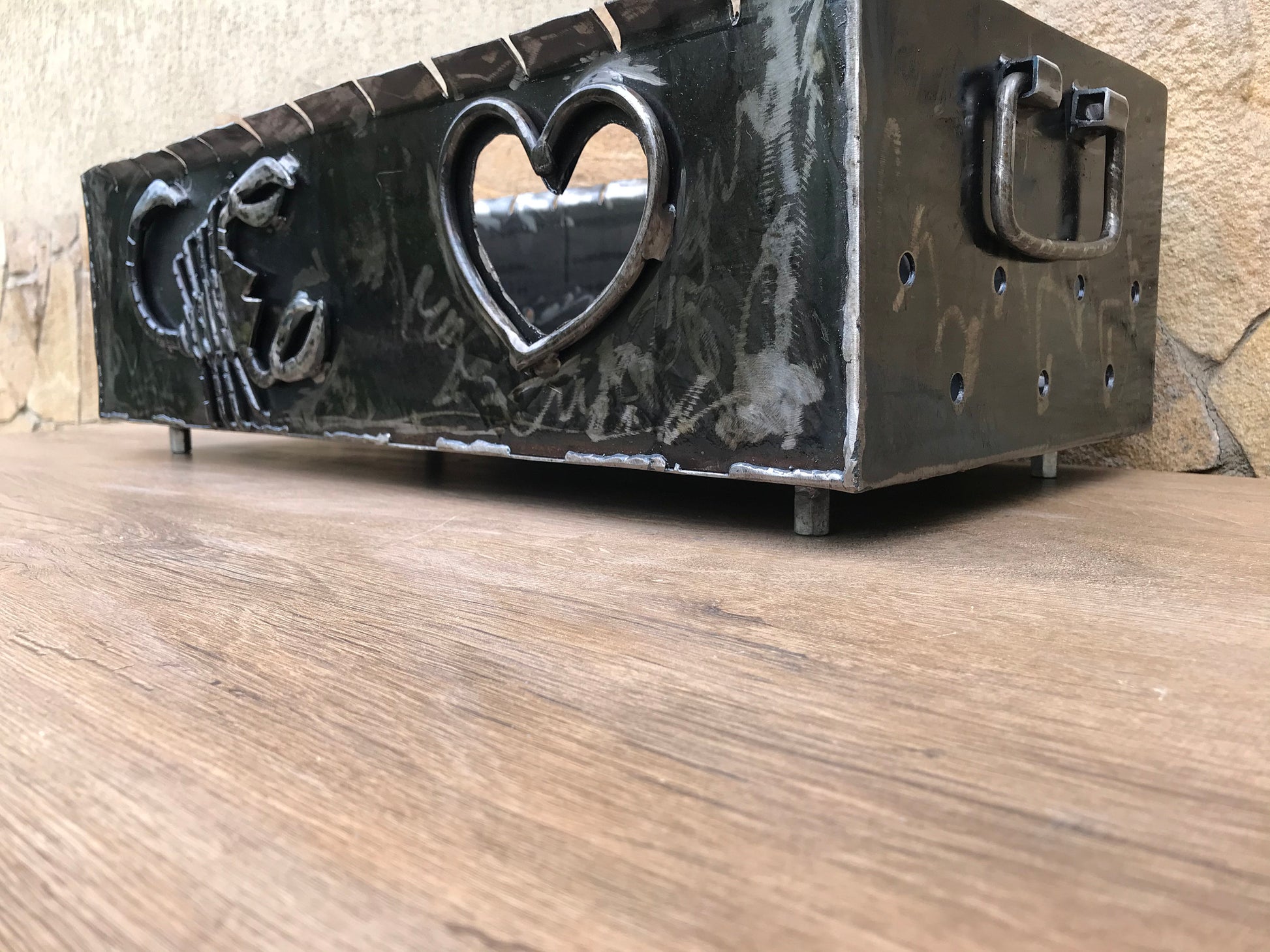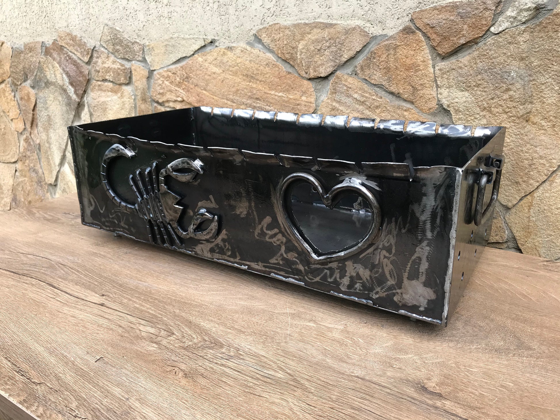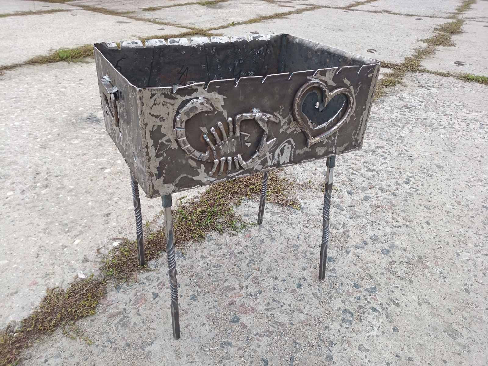 Do you want to surprise your guests, friends, family members at your picnic? Here is what you are missing for sure! A portable brazier grill made with a scorpion and a heart on one side, with movable handle, legs with twisted texture (any other symbols you prefer instead of a scorpion and a heart are possible to make).
