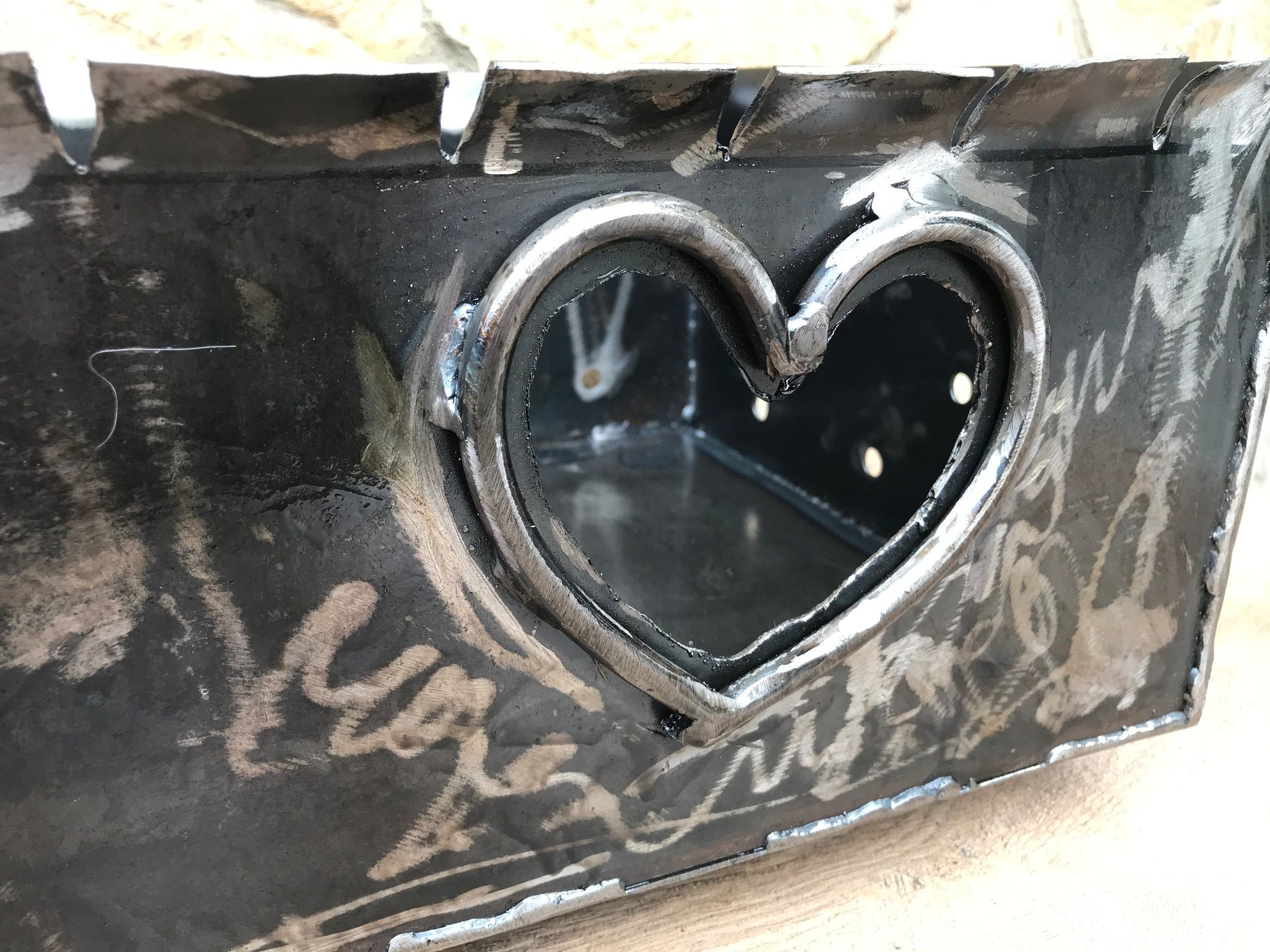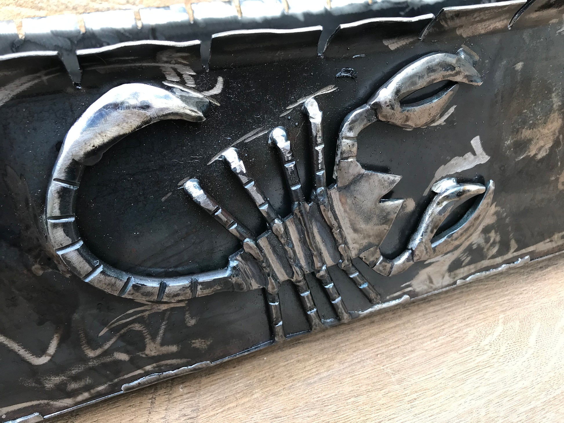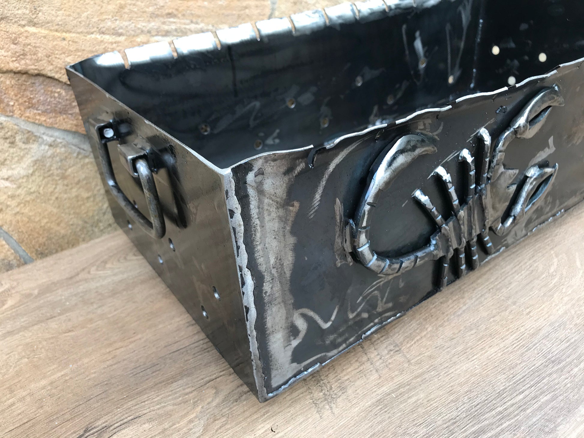 Do you want to surprise your guests, friends, family members at your picnic? Here is what you are missing for sure! A portable brazier grill made with a scorpion and a heart on one side, with movable handle, legs with twisted texture (any other symbols you prefer instead of a scorpion and a heart are possible to make).