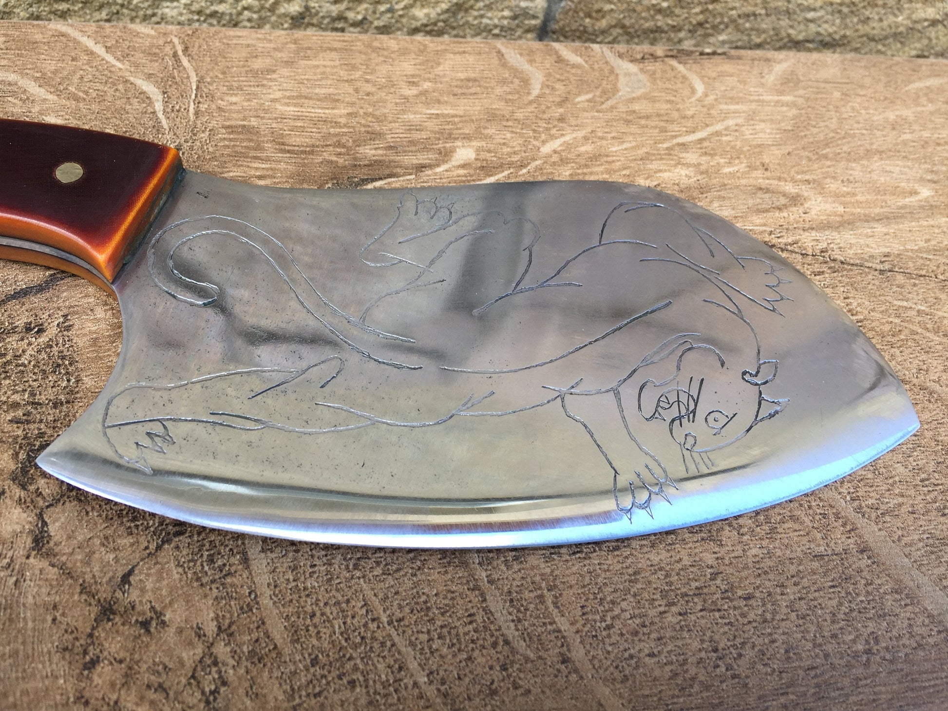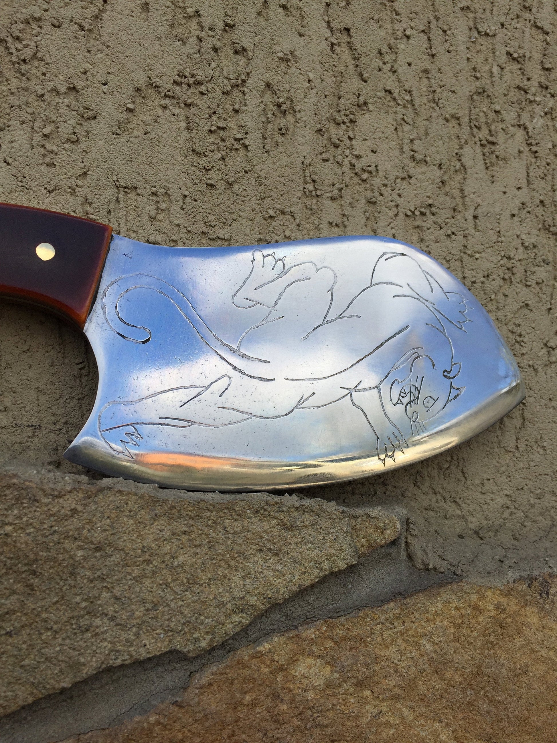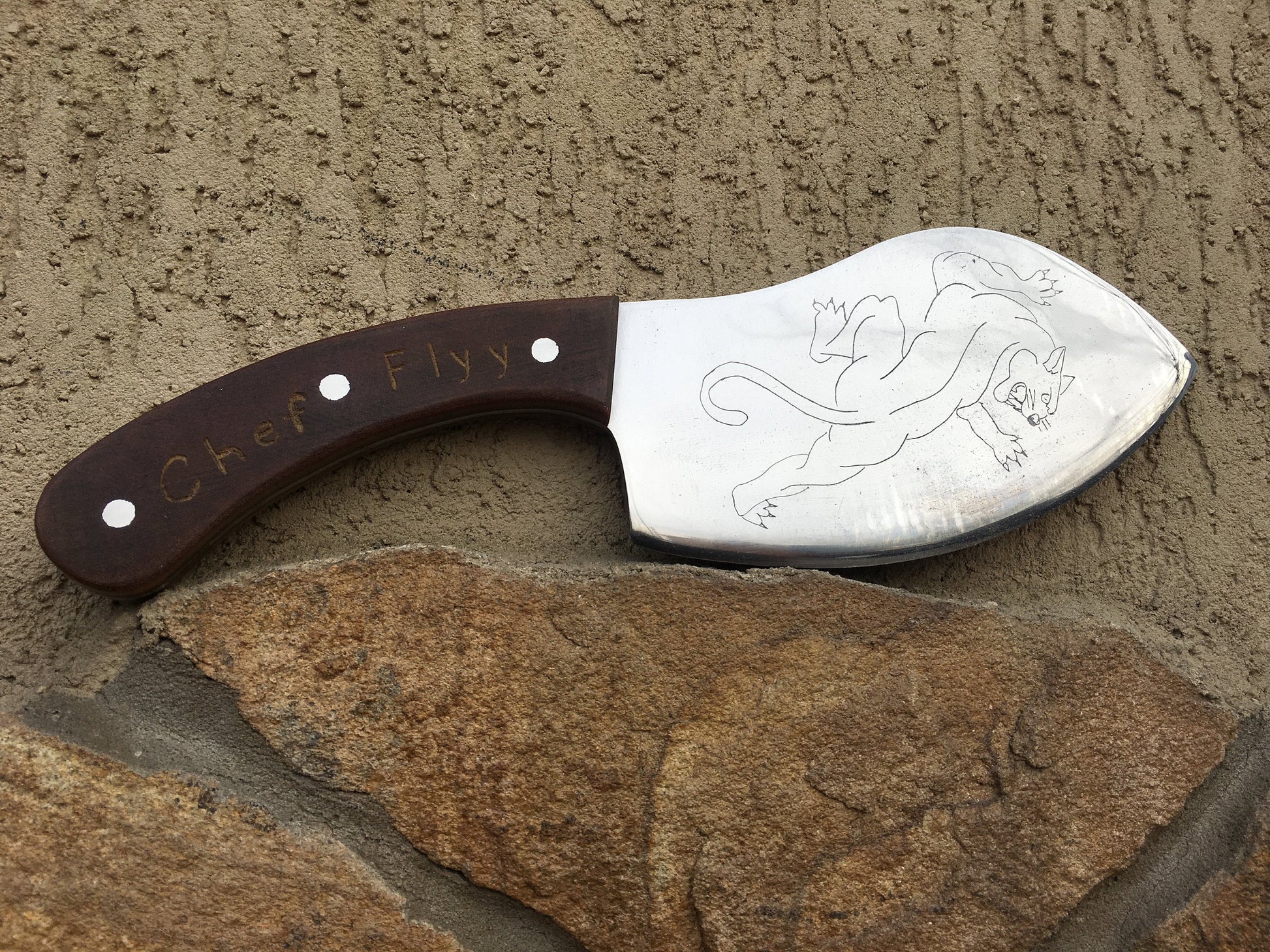 Here is a hand crafted knife with a nice structure of the blade (etched panther of the blade) and very convenient handle.