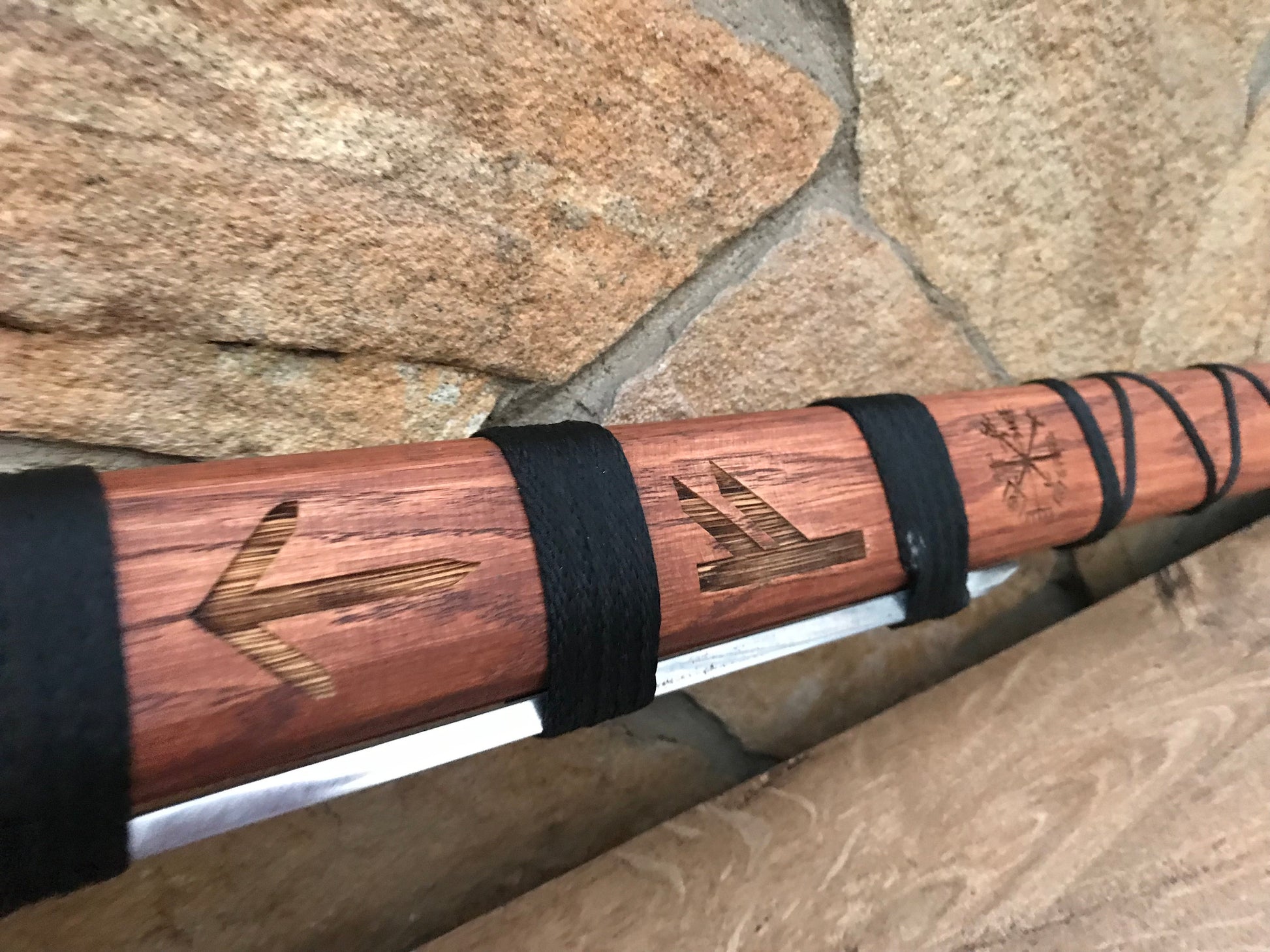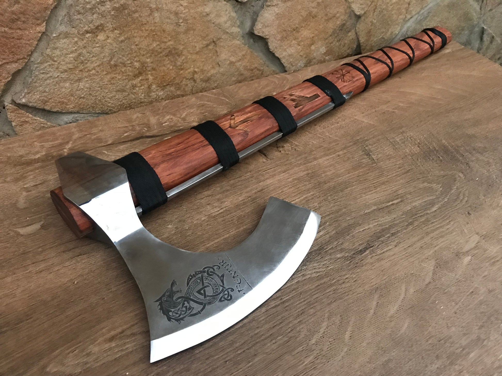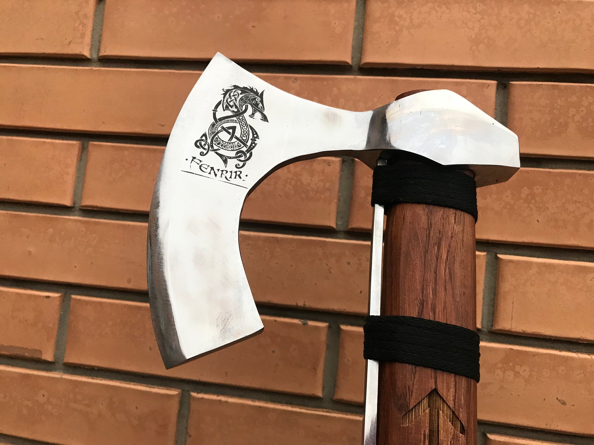 The axe head is done very decoratively, engraved with a Celtic Fenrir on a blade, the handle has two runes (Freya und Tyr) and Vegvisir (viking compass). There can be any customization which you prefer to have on this axe. If you do not give me other customization data, you will have the axe with the current customizations.