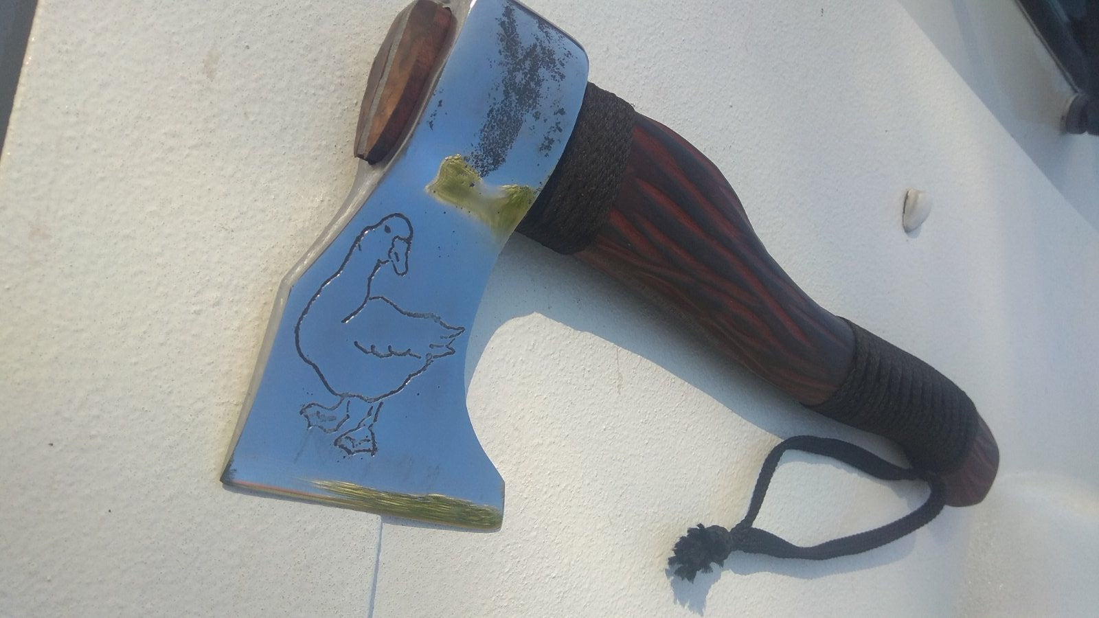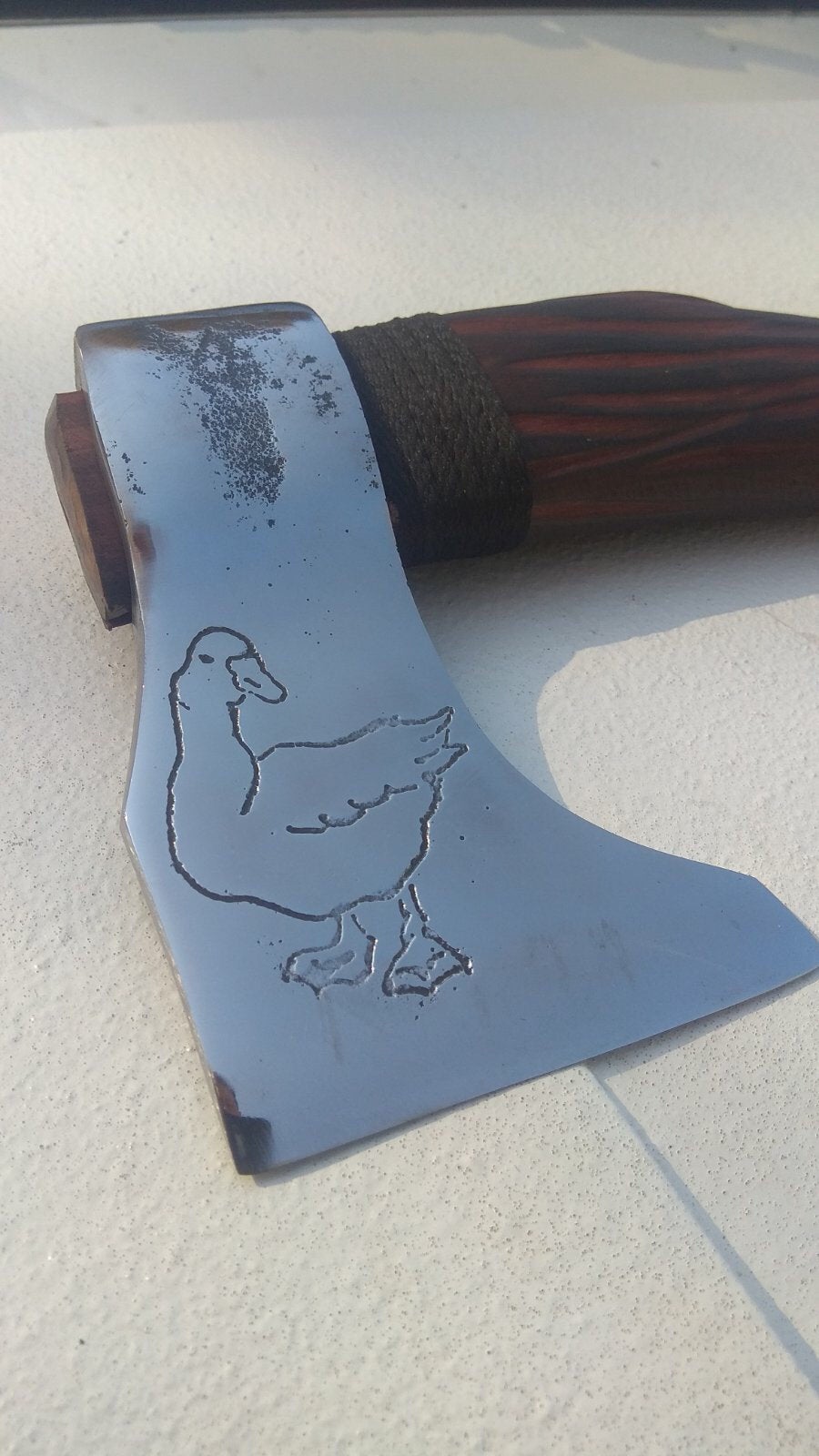 The axe head has the etched goose (there can be any animal/bird etched on an axe head which you prefer).