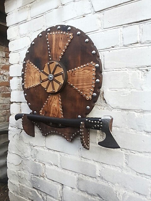 Looking for an unusual hand crafted shield with an axe? Here it is! A set of 2 pcs: a shield and an axe with the shield being a wall axe holder.