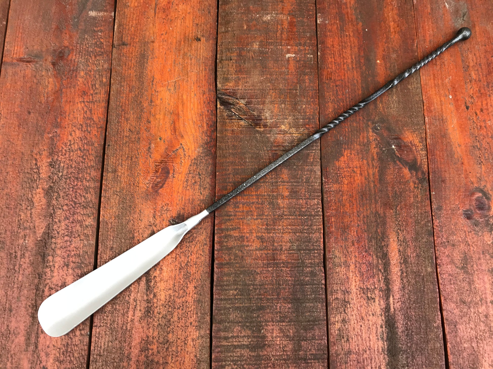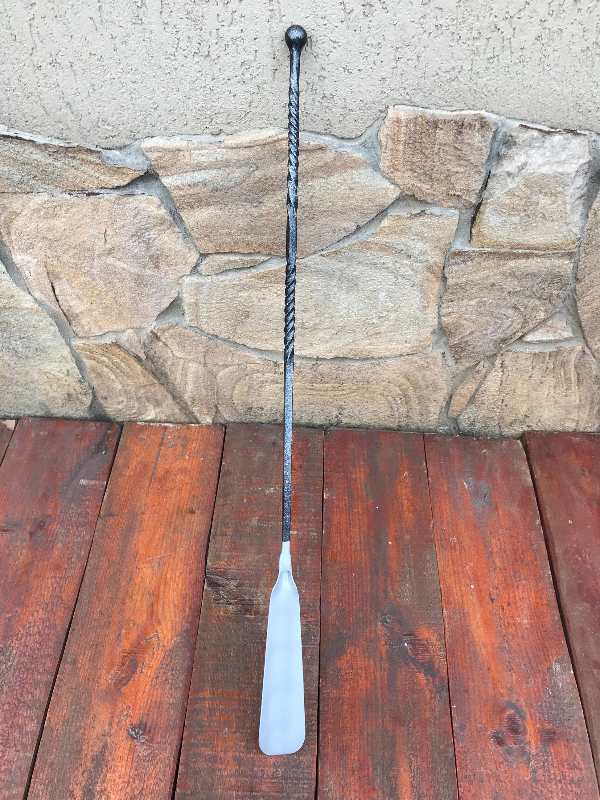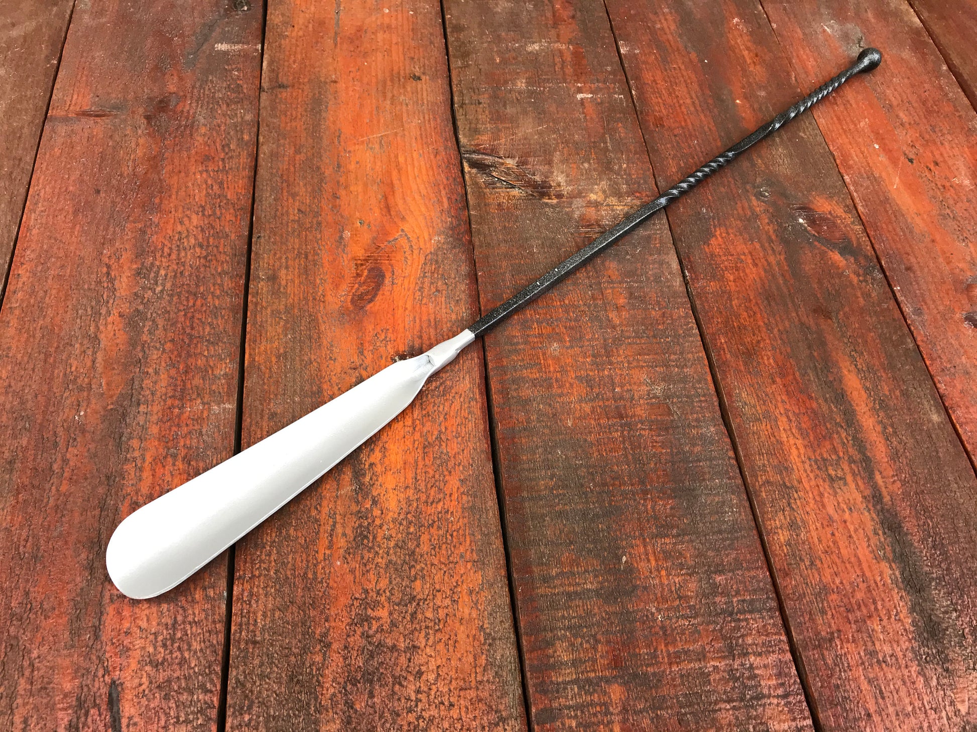 A shoehorn can be not a usual shoehorn but a masterpiece which can decorate your home and outlines the features of your home interior. Here is a forged shoehorn, hand made, hand forged. The shoehorn is done very decoratively, with twisted metal handle.