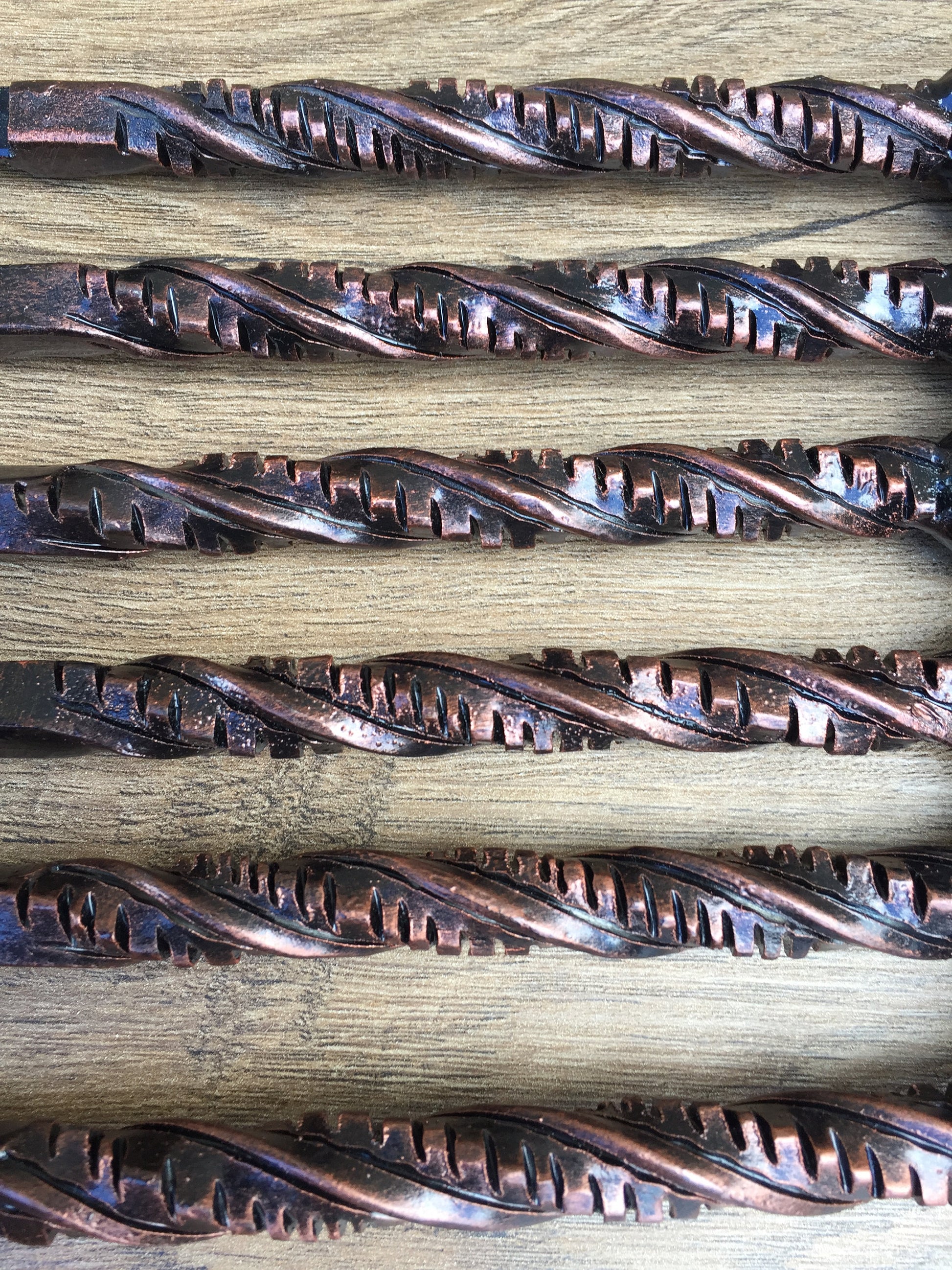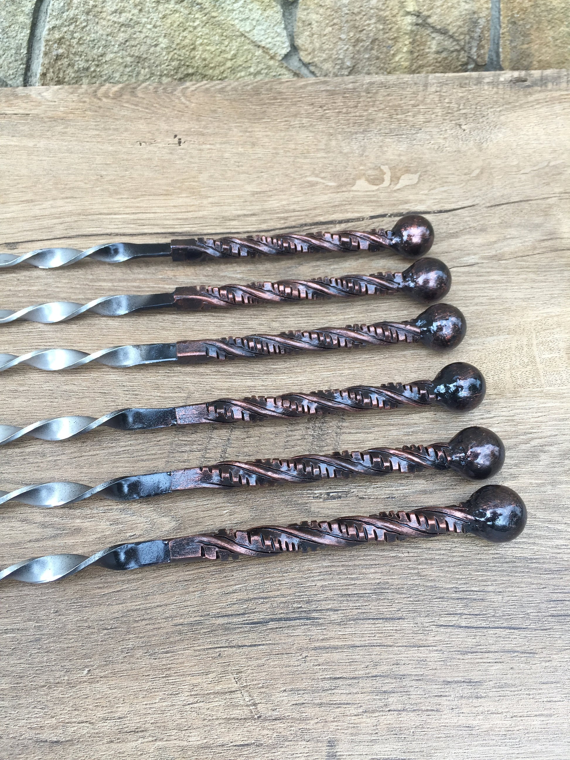 Grill accessories can be not only usual skewers but a masterpiece which decorates your house and outlines your interior/exterior features. Here is a hand forged set of skewers with a nice handle (twisted cubes).