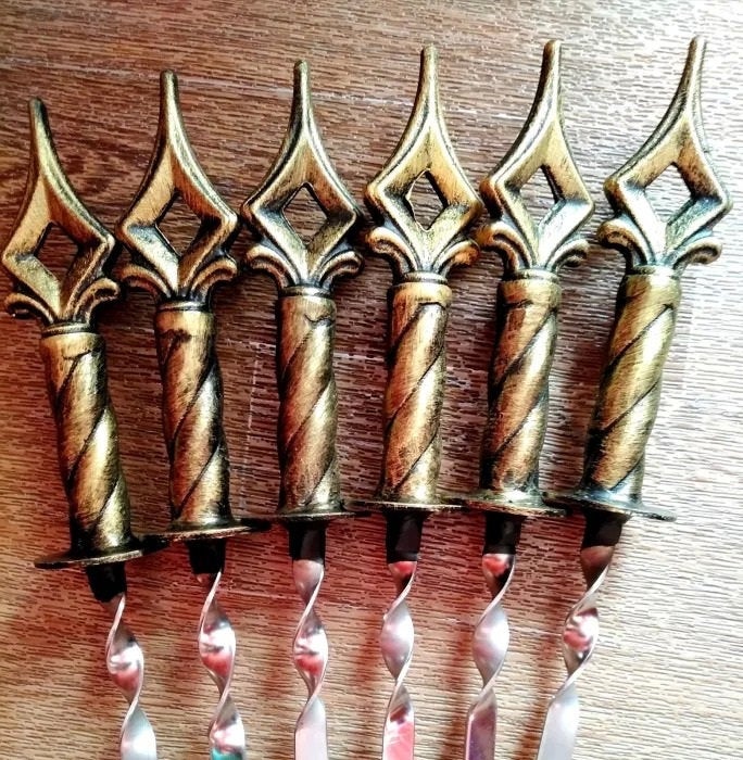 Stainless steel skewers can be not only usual skewers but a masterpiece which gives you new feelings and emotions. Here is a hand forged set of skewers (6 pcs) made of stainless steel with very nice decorative iron handles, fire poker, two knives. It is a functional piece of art!