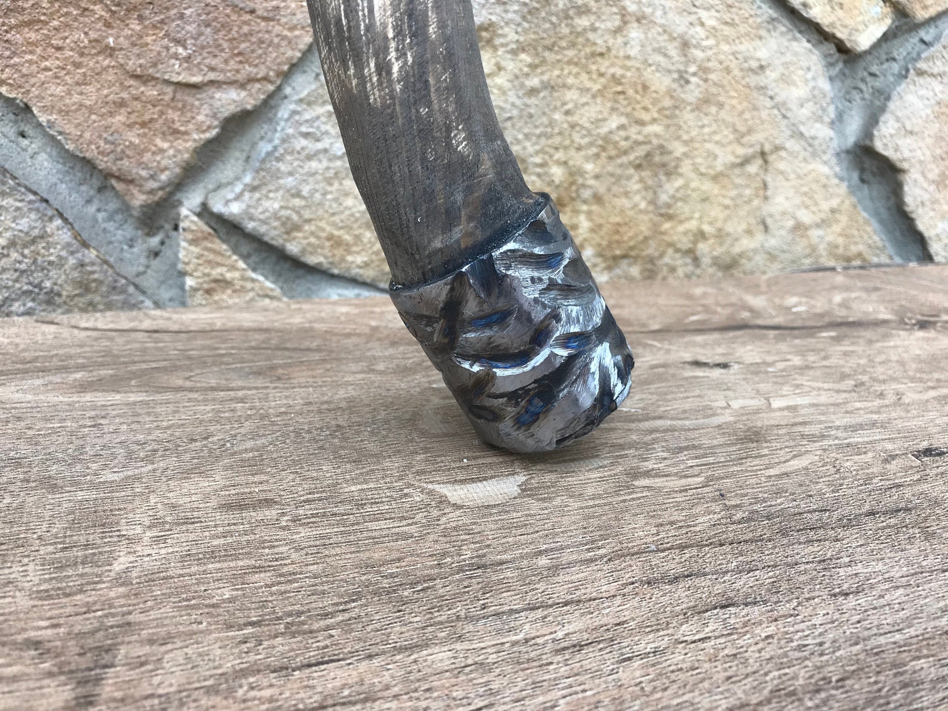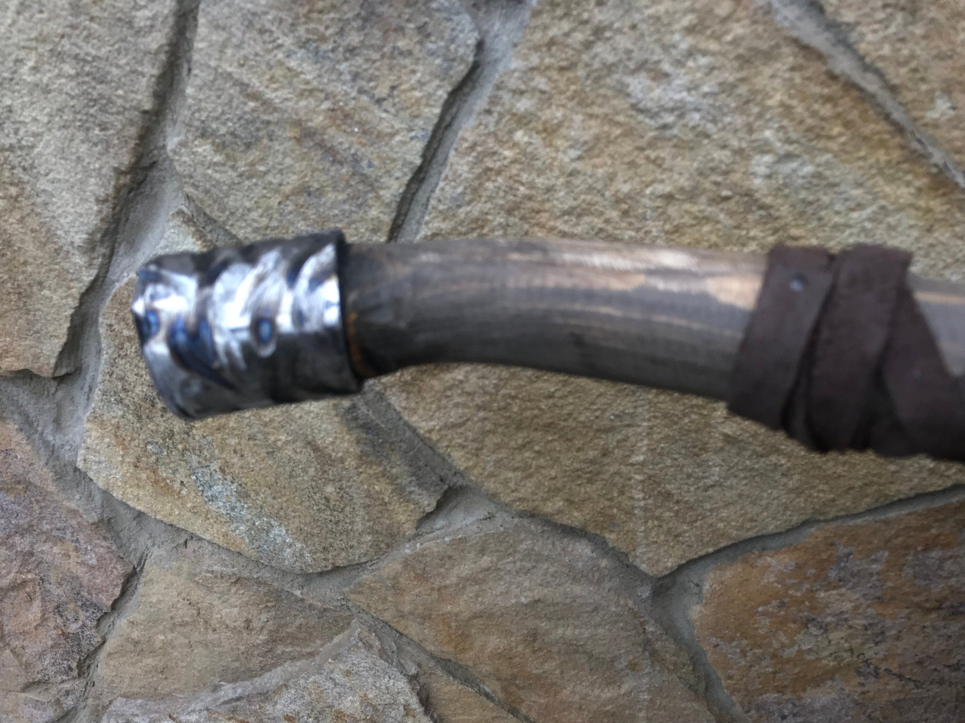 Color of the handle: brown, nicely carved, bound with a leather stripe.