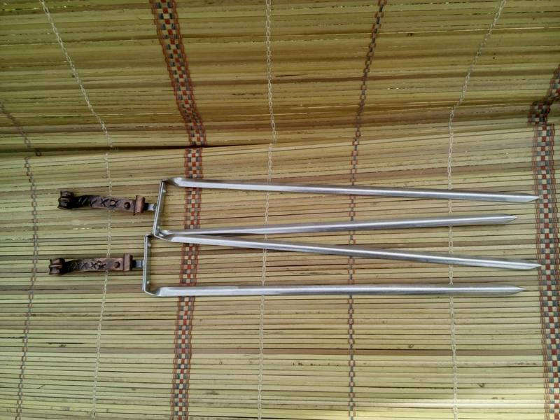 Grill accessories can be not only usual skewers but a masterpiece which give you new feelings and emotions. Here is a hand forged set of skewers with double blades (6 pcs). The handles of skewers are made in a view of a paw, they look very nice.