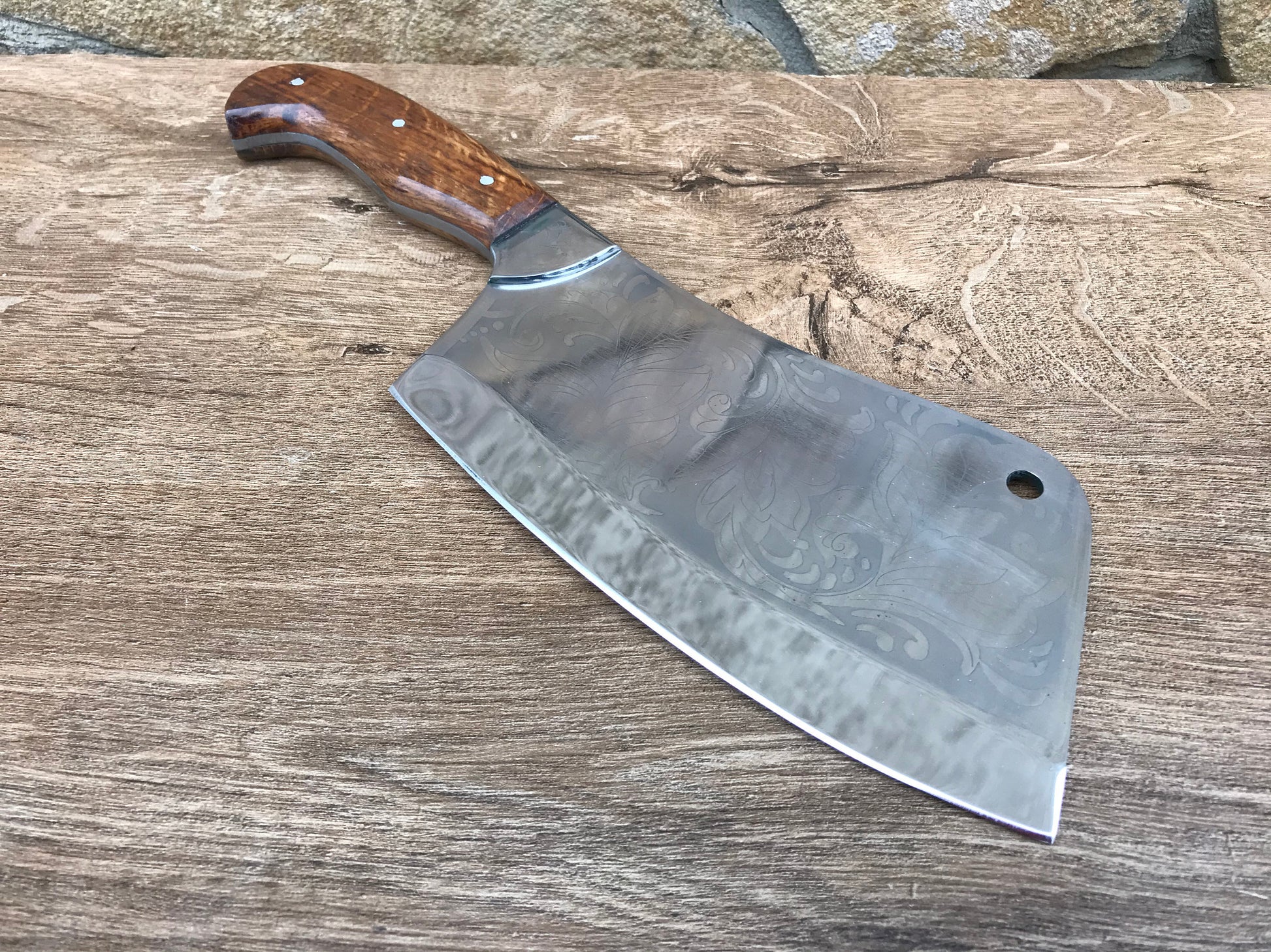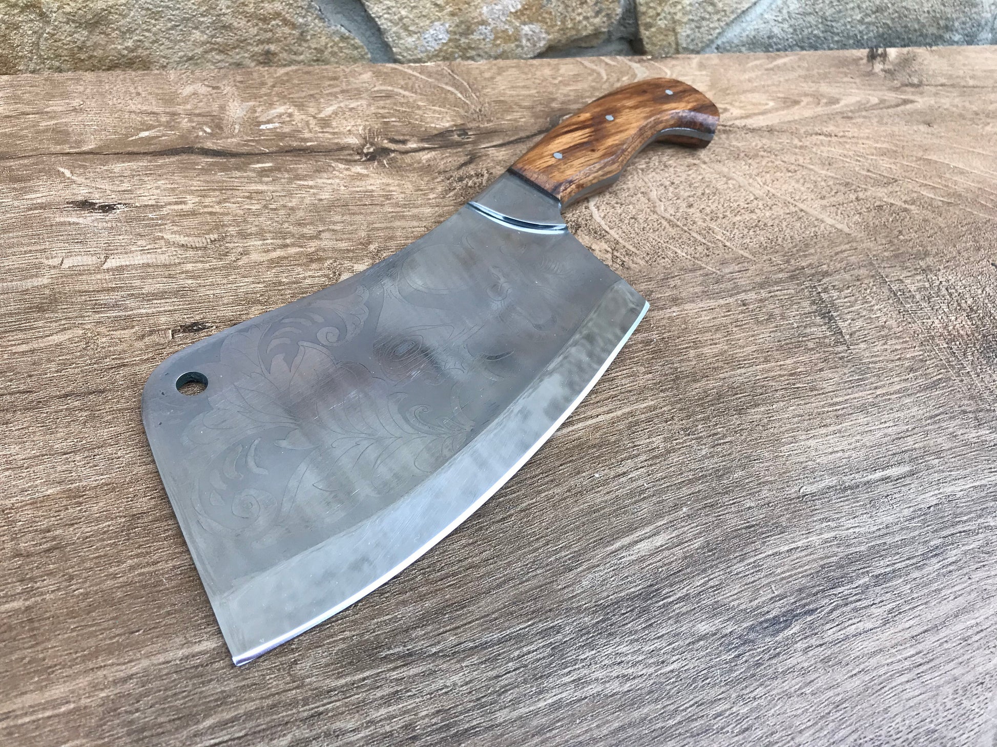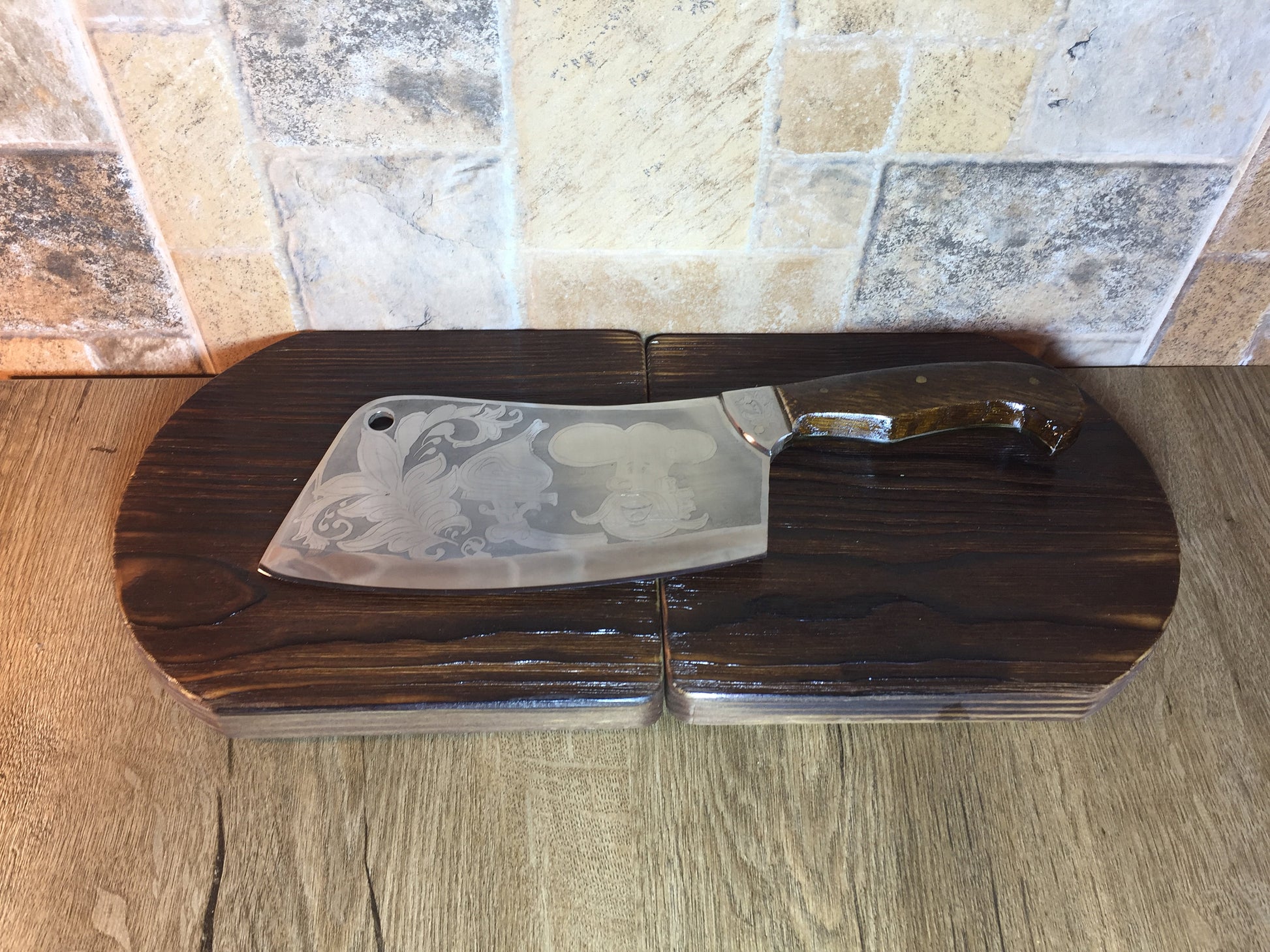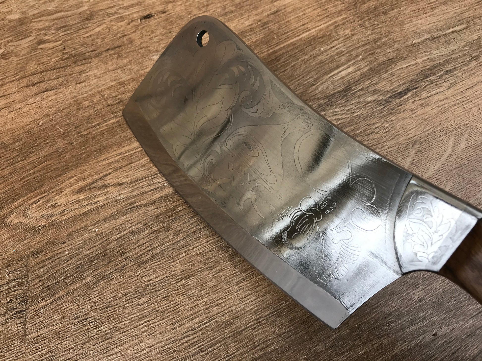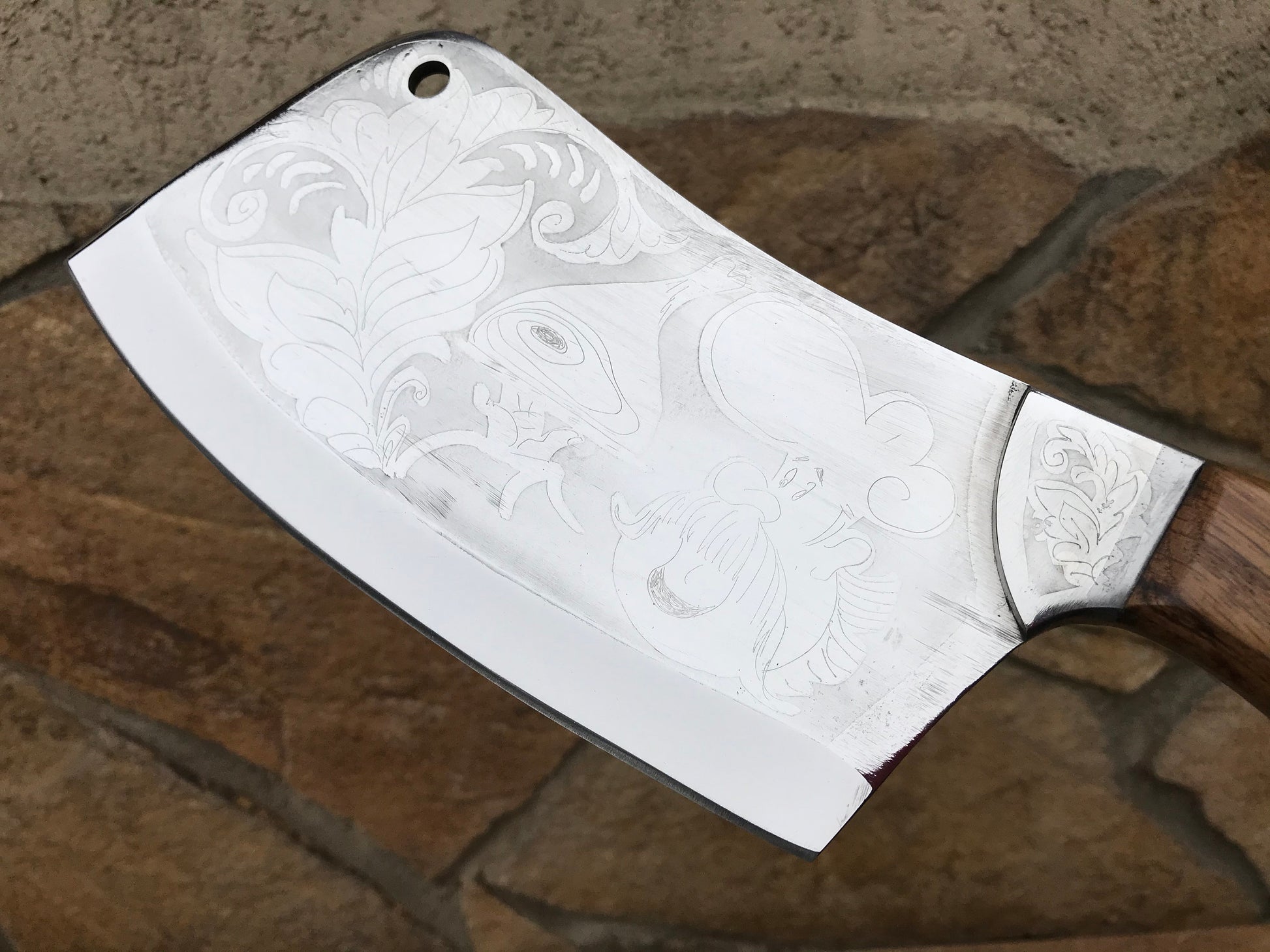 Here is a butcher knife/kitchen knife. It has a nice engraving from both sides of a blade (on one side - flowers and leaves, on the other side - a cooker holding a plate with a chicken and some flowers) . It looks very decorative and it is a universal cool gift! It will be your best kitchen knife!