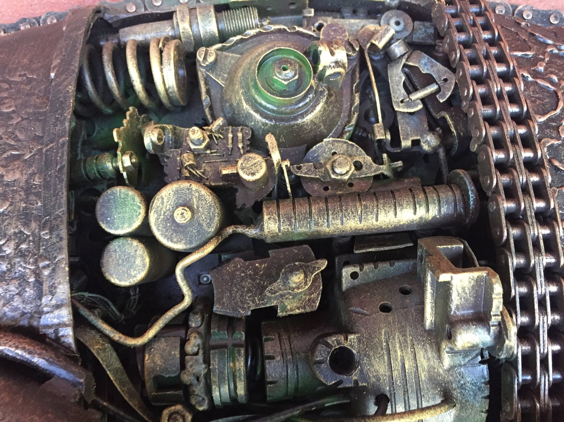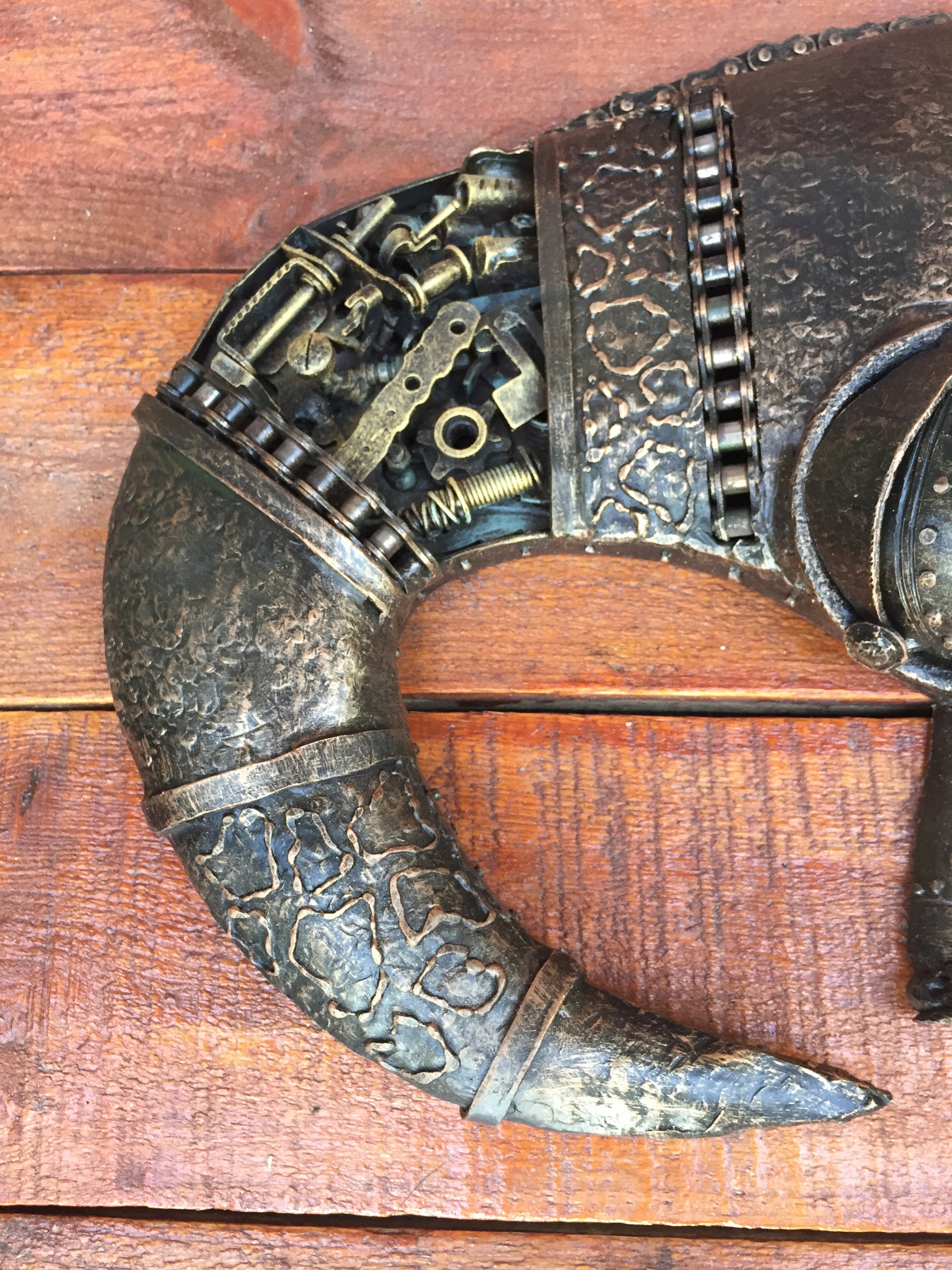 A steampunk dinosaur painting will decorate your house and outline its interior features. It is hand forged with using different mechanisms from different devices. It is awesome!
