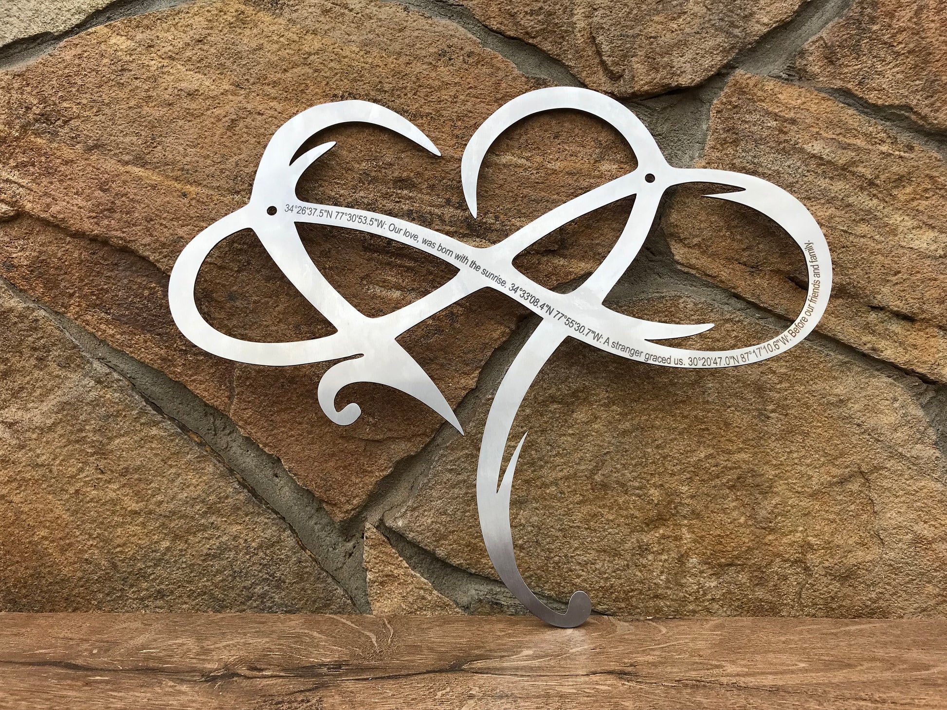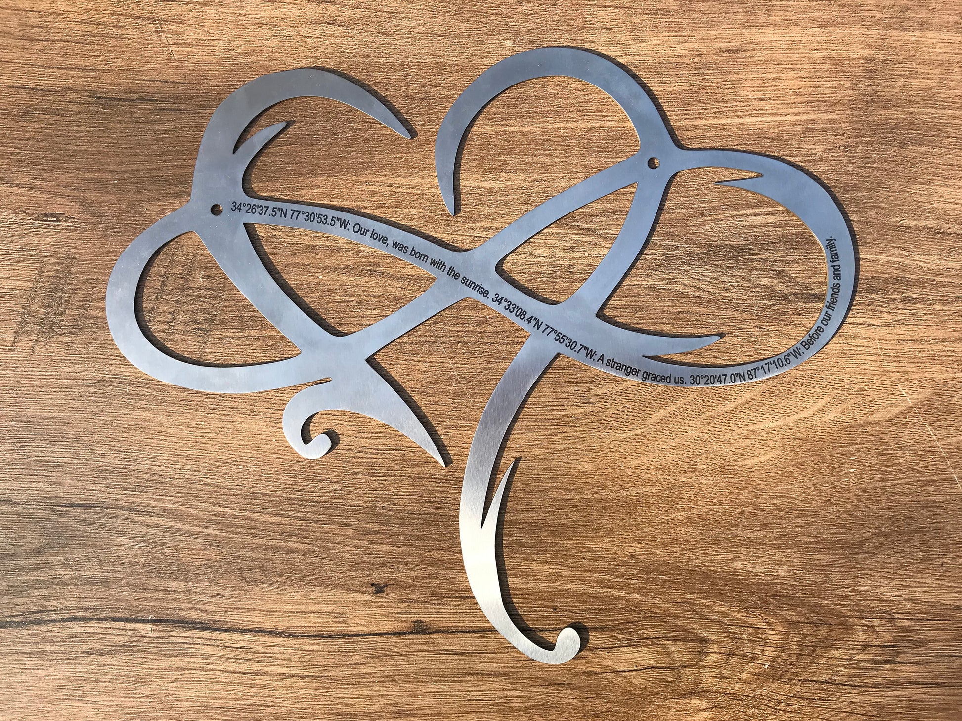 Here is a custom wall decor made of steel which includes a heart and infinity sign crossed together. This is a great 11th anniversary gift (steel year), Christmas gift, engagement gift and a gift for any other gifting occasions.