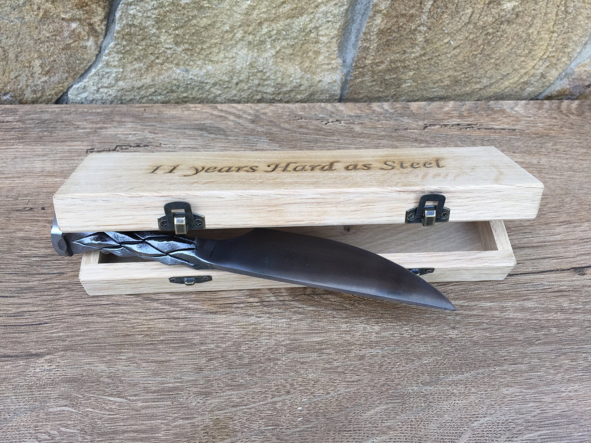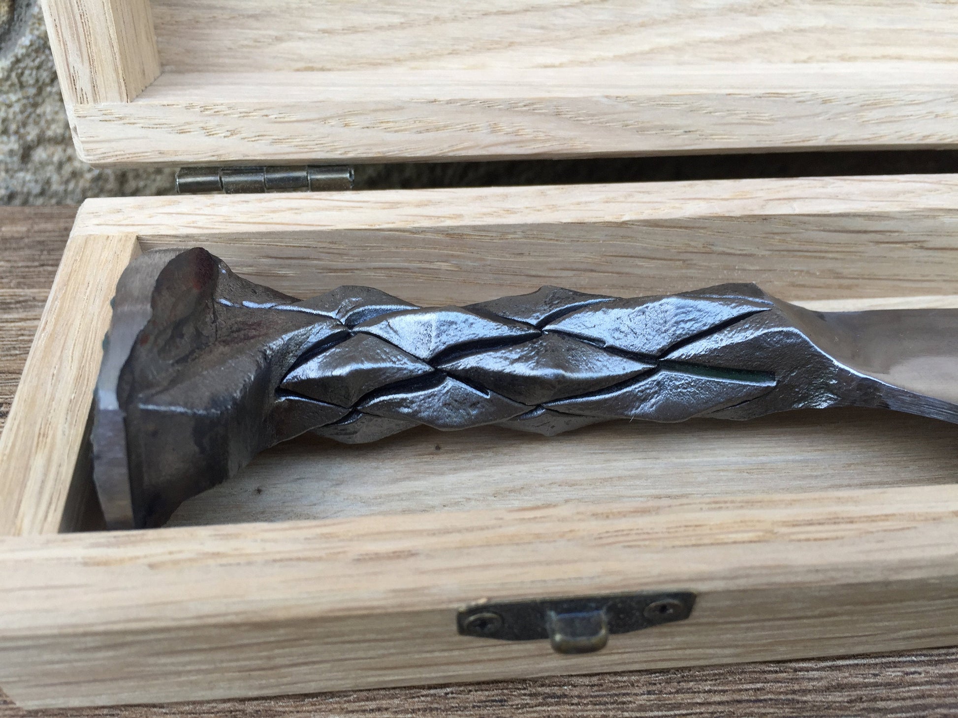 Here is a hand forged knife (a handle - in a view of a pine-apple texture) in a wooden box (casket). This is a great groomsmen gift, corporate gift, usher gift, groom gift, father of the bride gift, 6th anniversary gift (iron year), 11th anniversary gift (steel year), Father's Day, Christmas gift for a grandfather or any other gifting occasion.