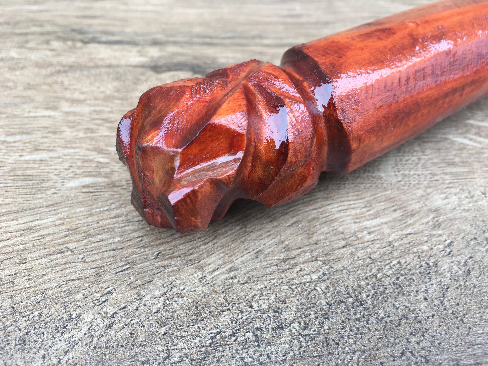 A small outdoors axe (hatchet), with carved handle, hand-forged and made from carbon steel using traditional blacksmith methods. The steel is stuck several times, increasing its density and thereby the durability of the axe. It will be a perfect companion in your ventures through the wilds, through the woods of the pacific northwest, or at the cabin to make kindling to warm your hearthside. It has a wooden stump.