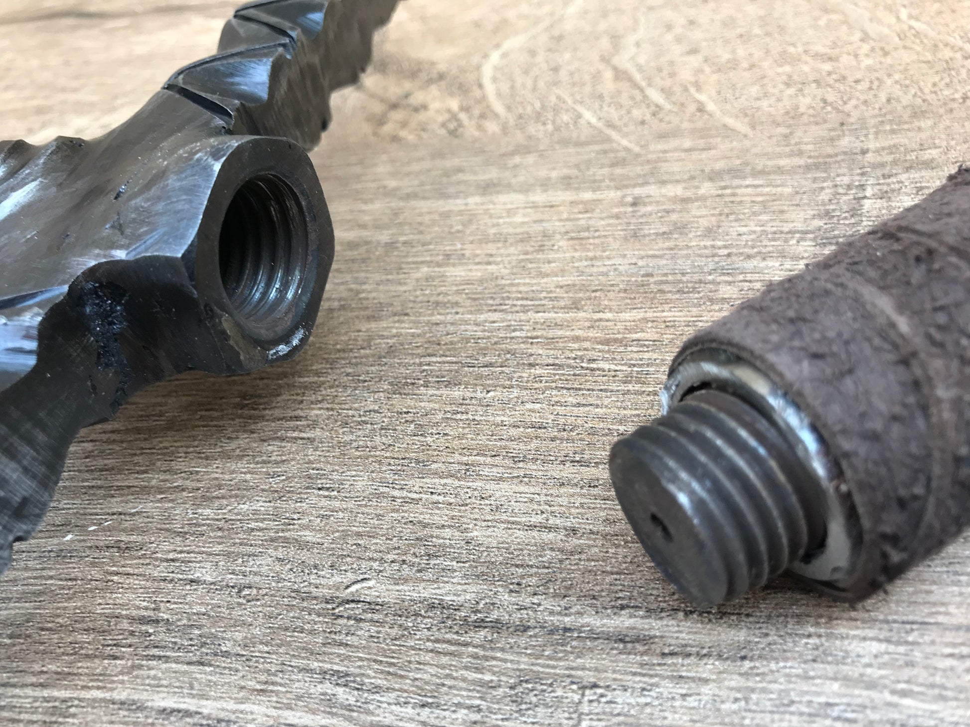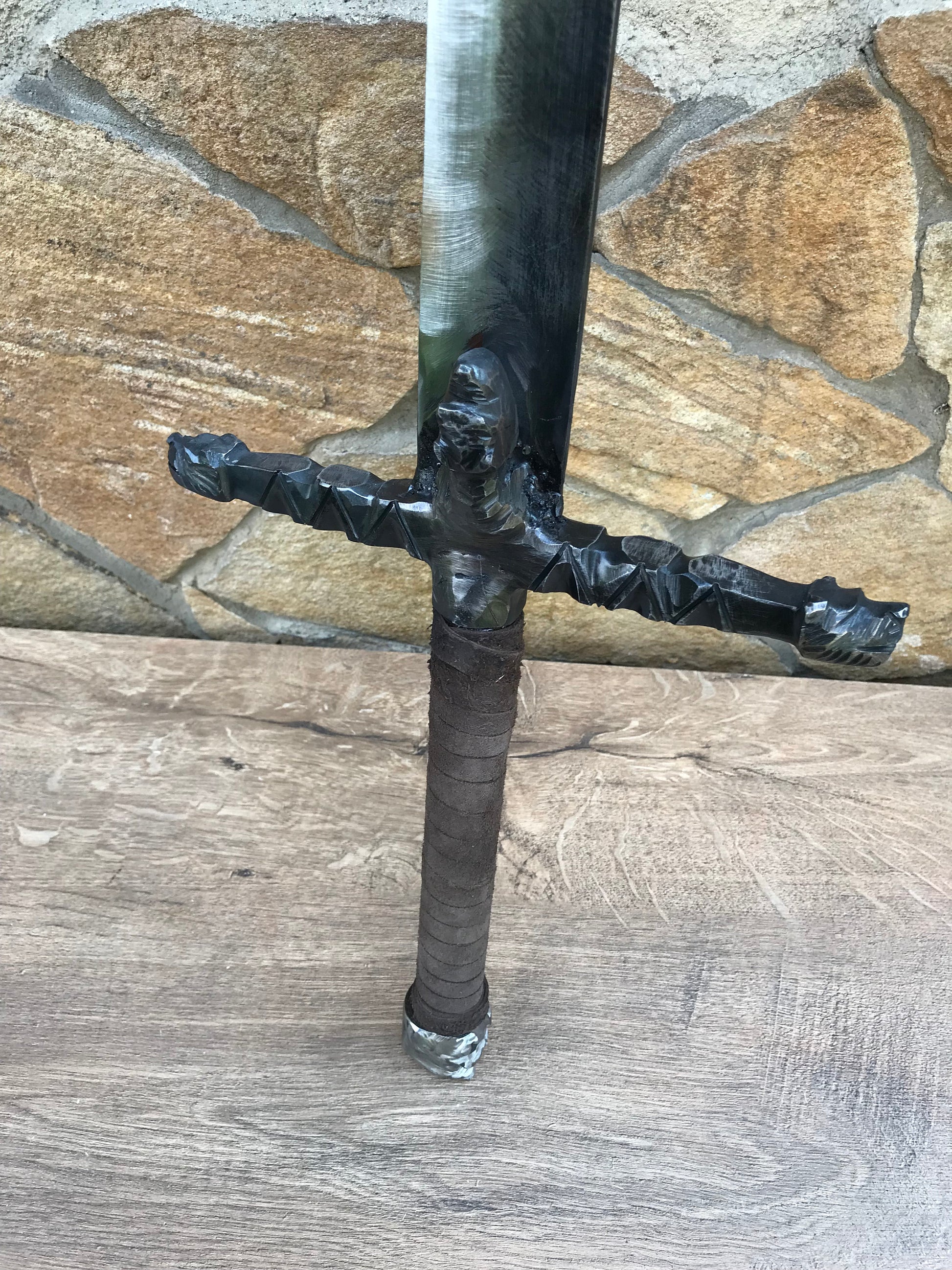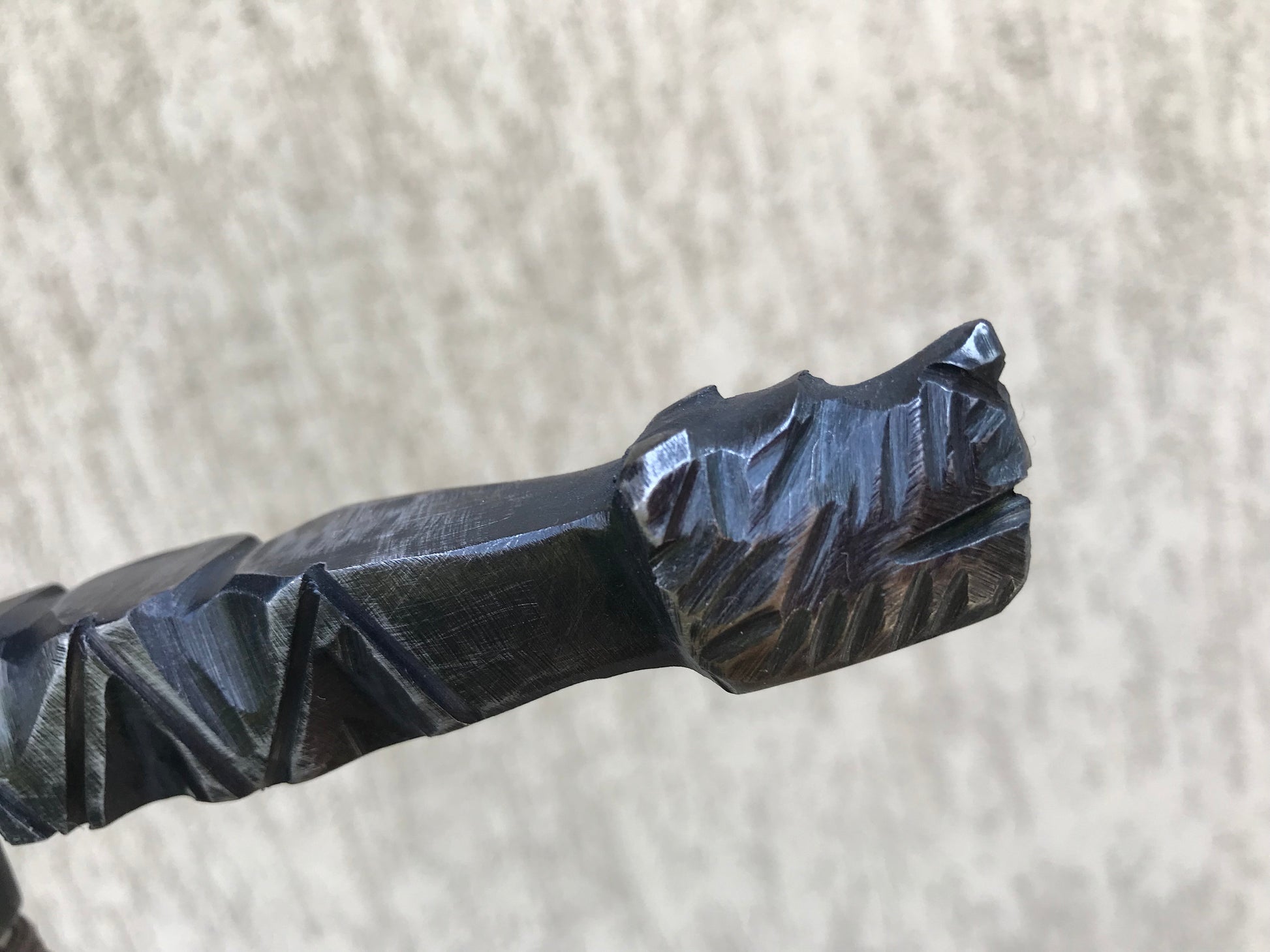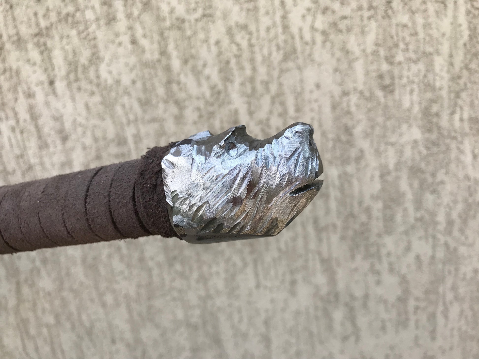 The handle has 5 bear heads and a leather. The sword blade is blunt. The handle has a screw to be connected with a blade. It will be shipped in disassembled condition.