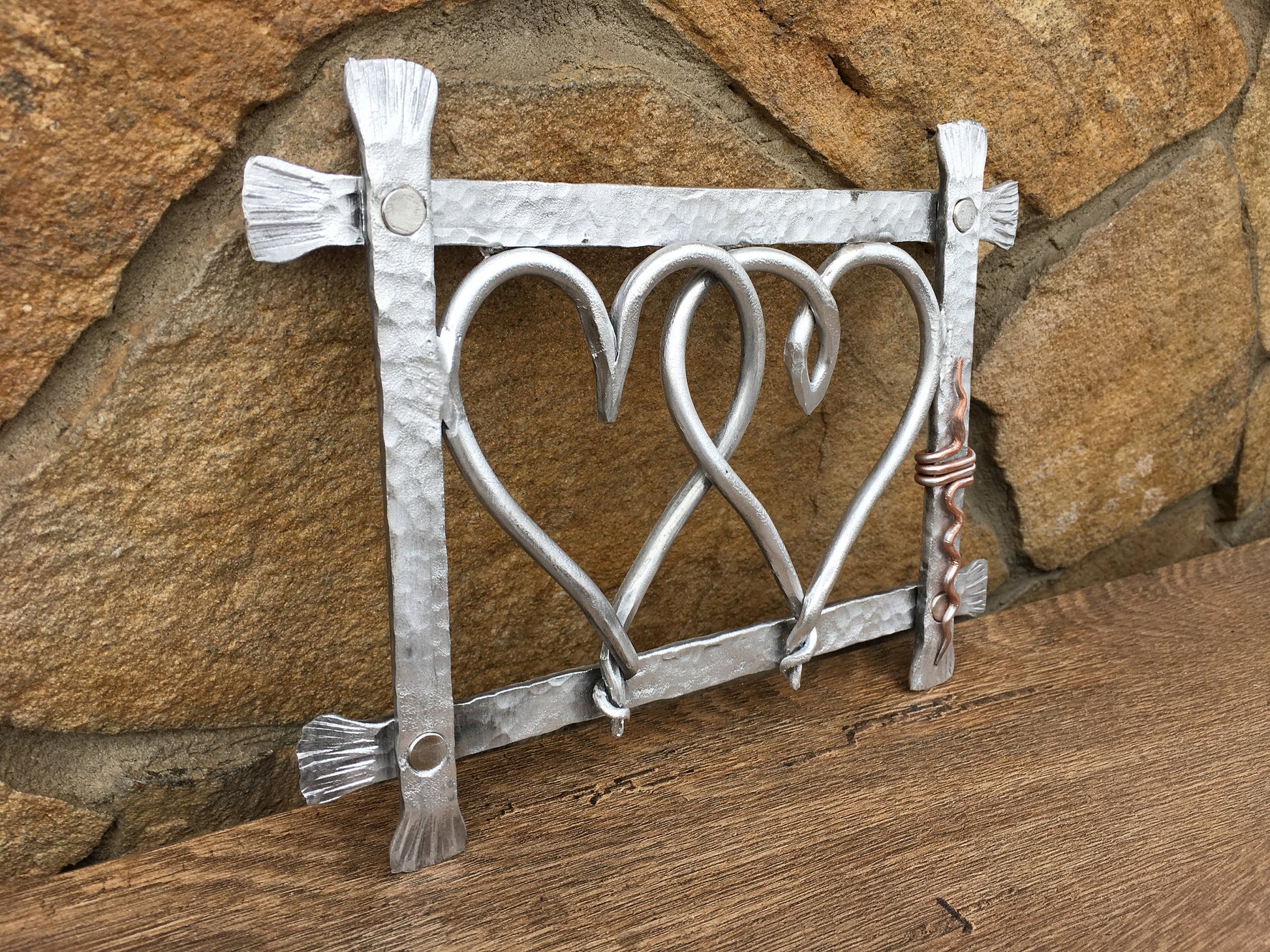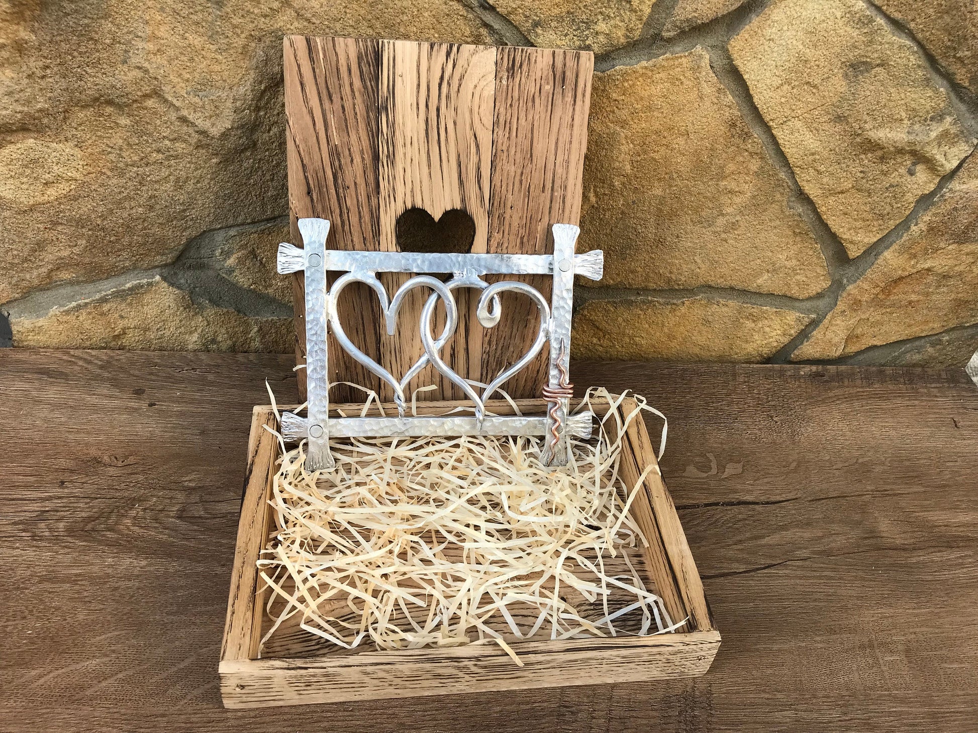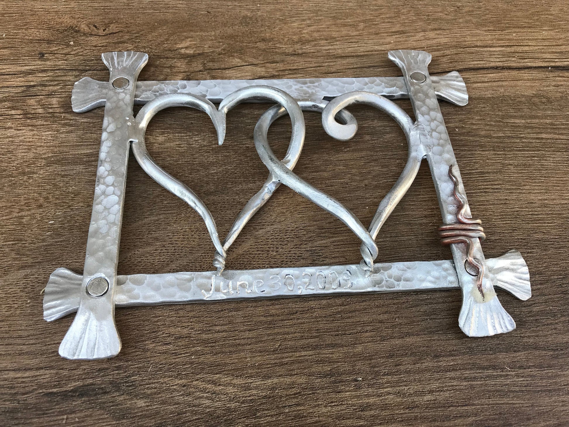 Here is a nice aluminium / tin hand forged frame with two hearts and a copper wire in a wooden gift box. A nice gift for a wedding anniversary, 10th wedding anniversary (aluminium/tin anniversary), for expressing love, for engagement, Valentine's Day and for many other gifting occasions!
