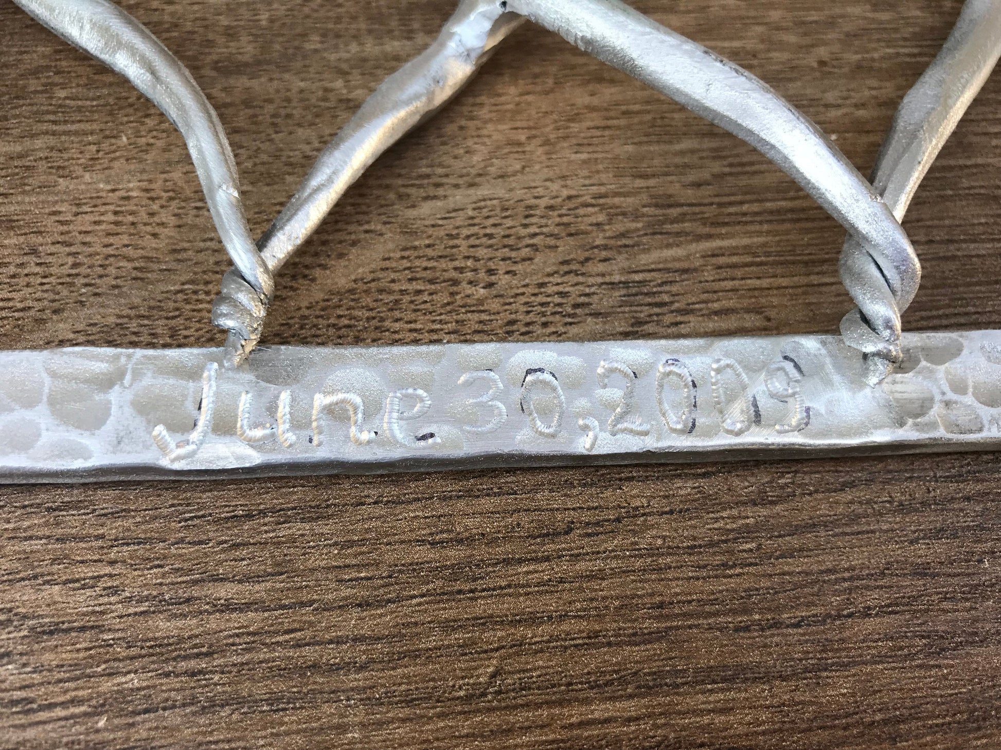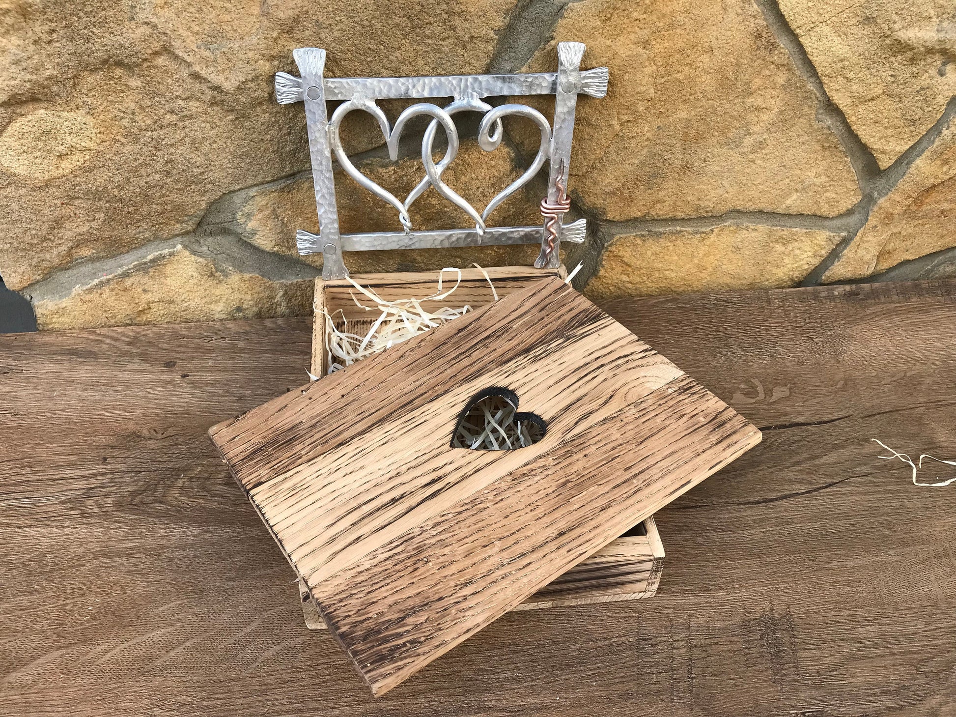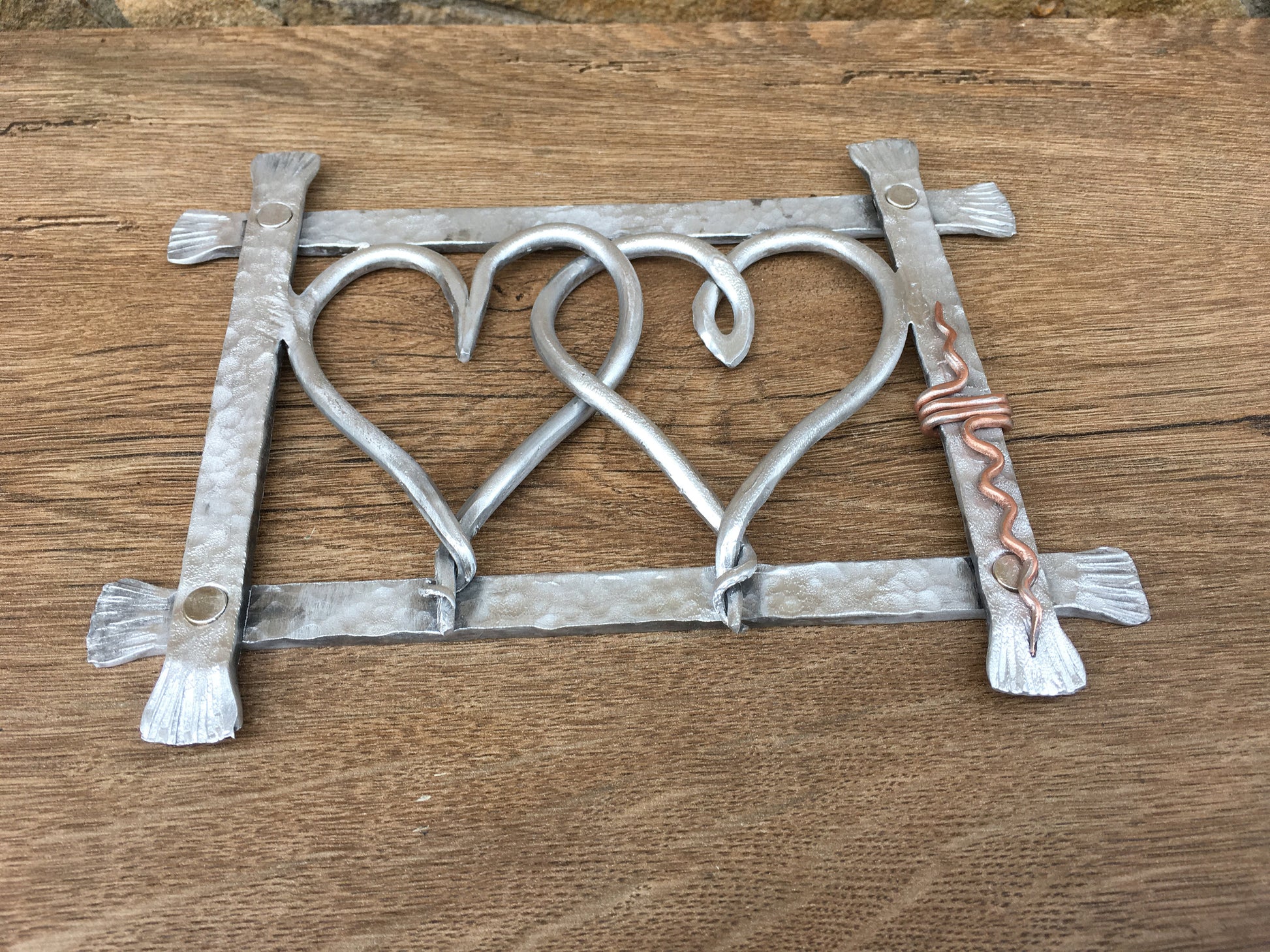 Here is a nice aluminium / tin hand forged frame with two hearts and a copper wire in a wooden gift box. A nice gift for a wedding anniversary, 10th wedding anniversary (aluminium/tin anniversary), for expressing love, for engagement, Valentine's Day and for many other gifting occasions!
