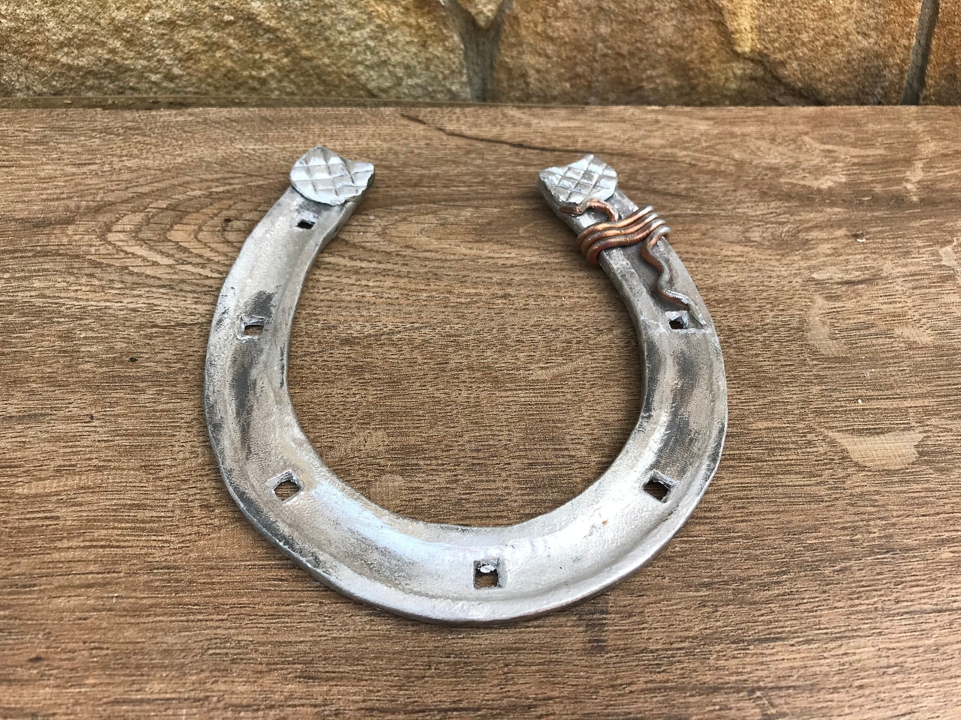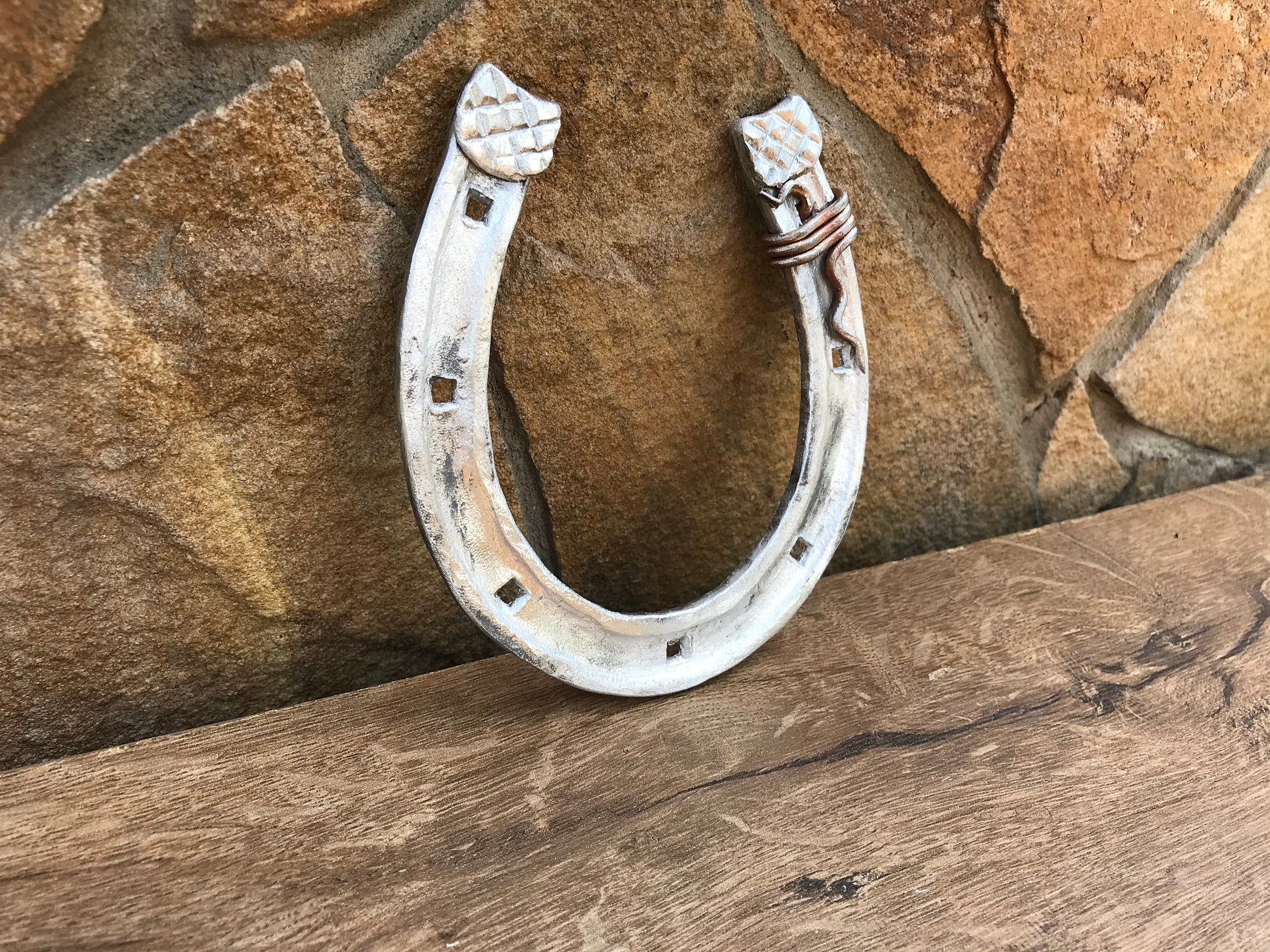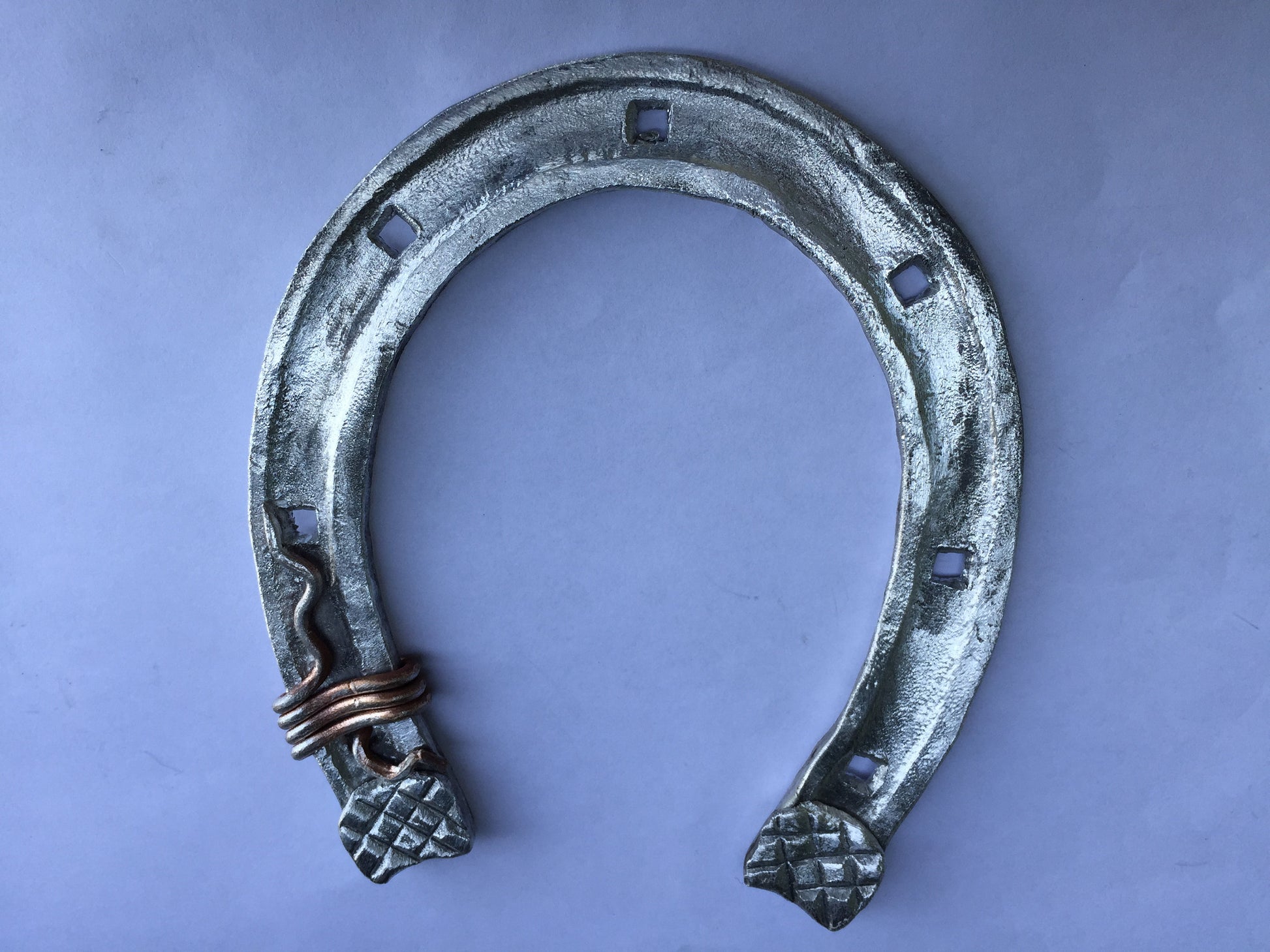 Here is a nice aluminium hand forged horseshoe with a nice copper wire. A nice present for a wedding, 10th wedding anniversary (aluminium/tin anniversary), for expressing love, for engagement, Valentine's Day and for many other gifting occasions!