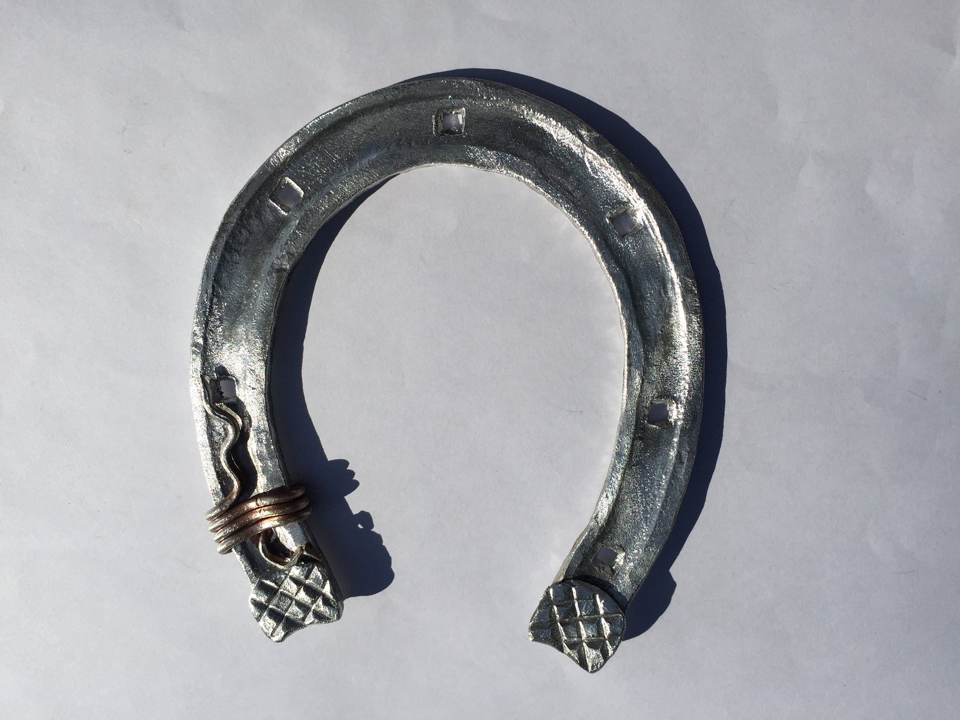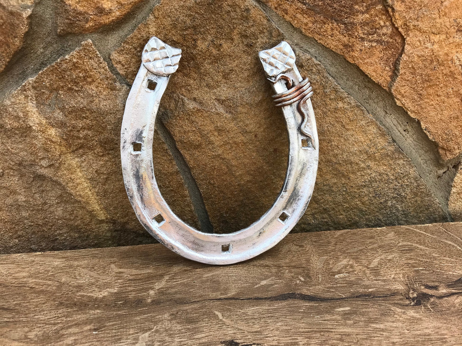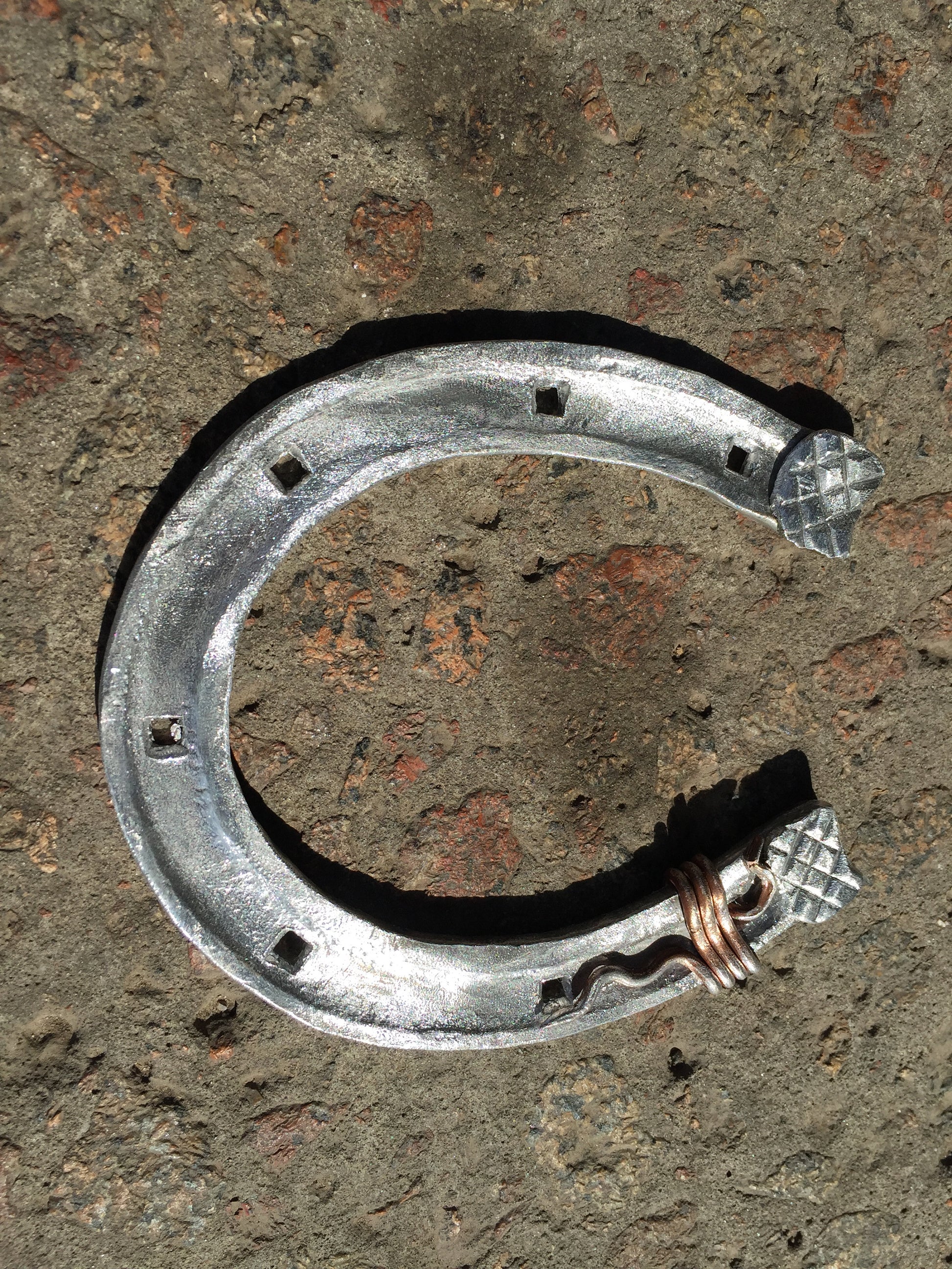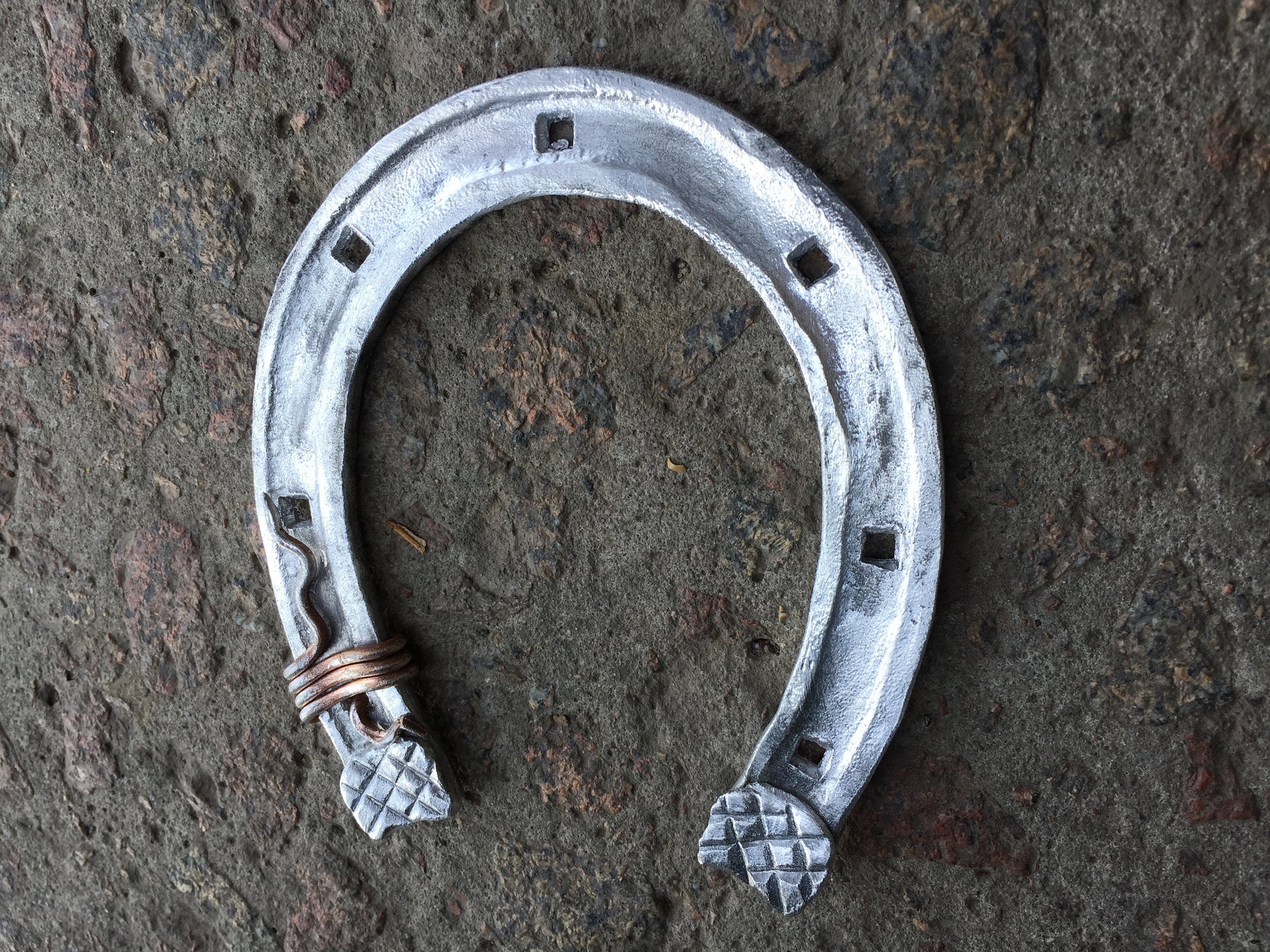 Here is a nice aluminium hand forged horseshoe with a nice copper wire. A nice present for a wedding, 10th wedding anniversary (aluminium/tin anniversary), for expressing love, for engagement, Valentine's Day and for many other gifting occasions!
