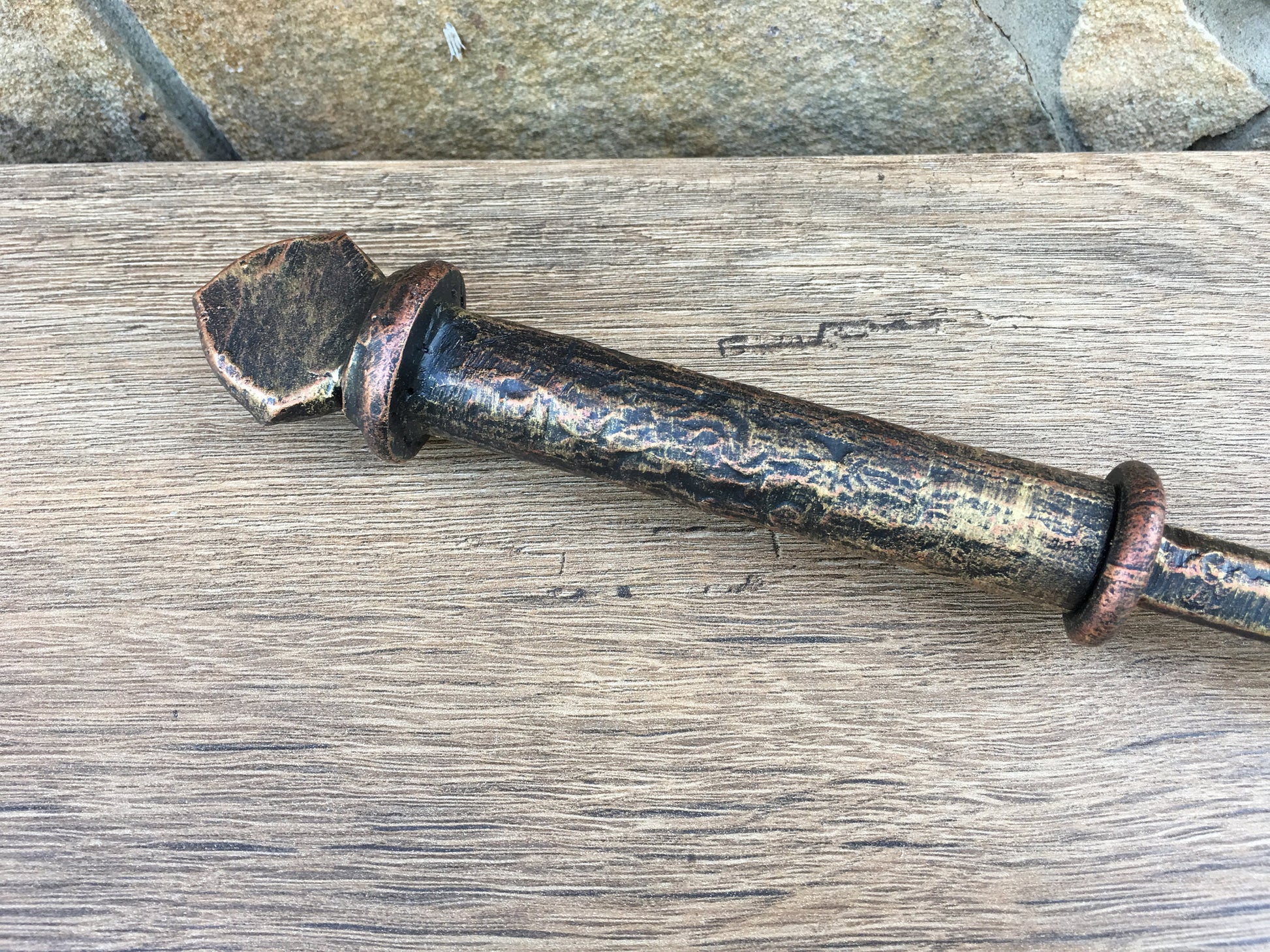 Color: black covered by copper/bronze patina.