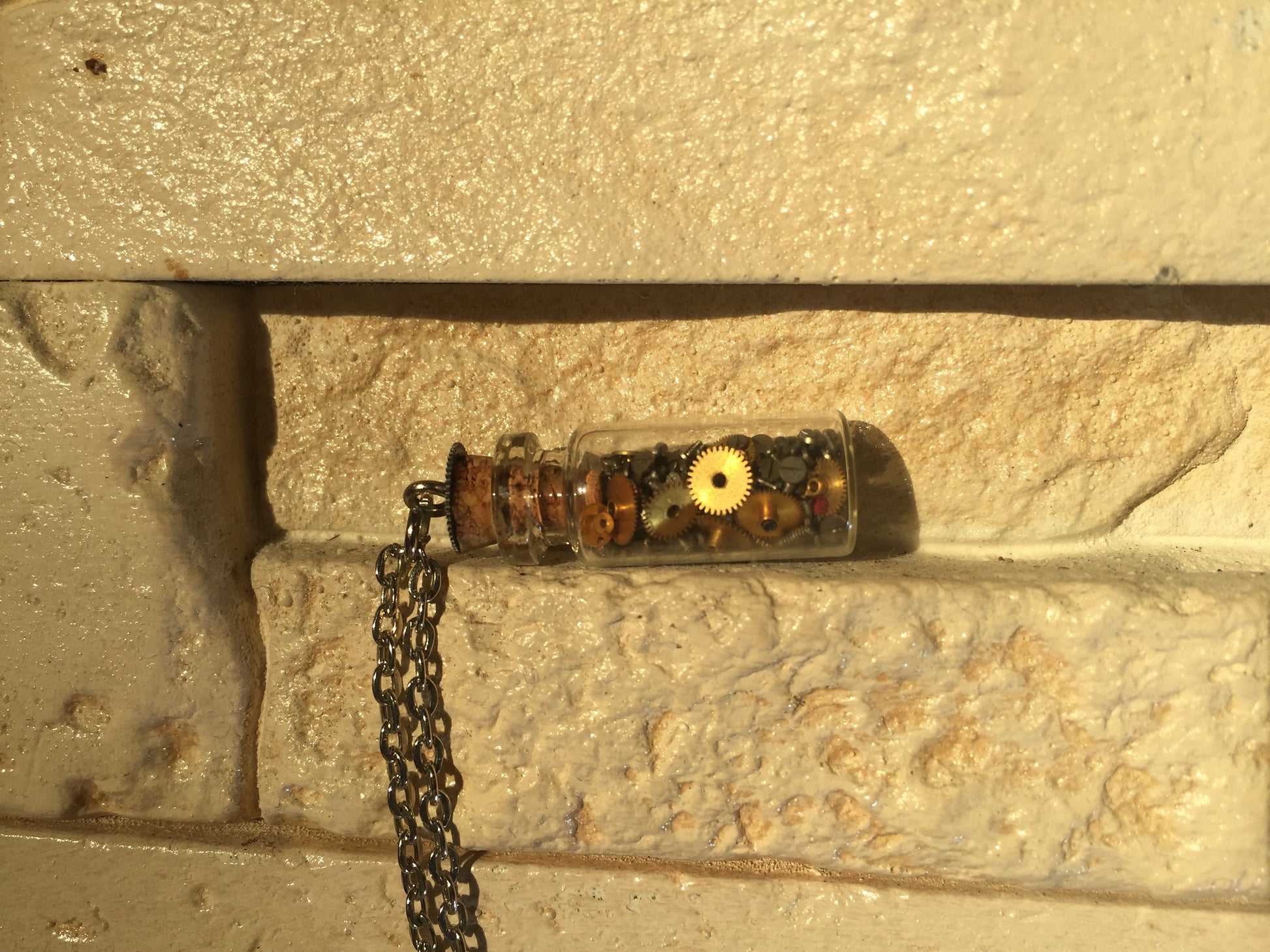 I made it by filling a small glass vial with the tiny old watch parts and gears, sealed the top with a cork, put a chain. Uniquely handmade.