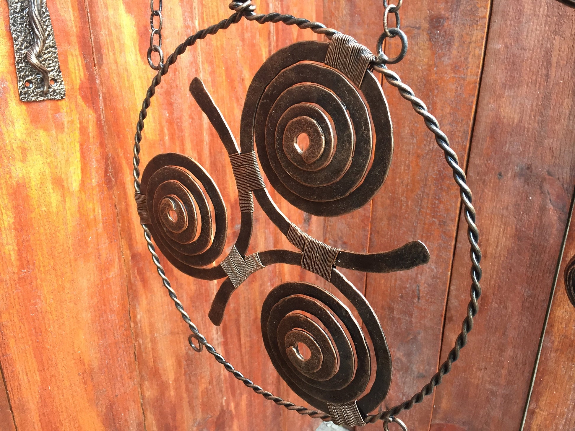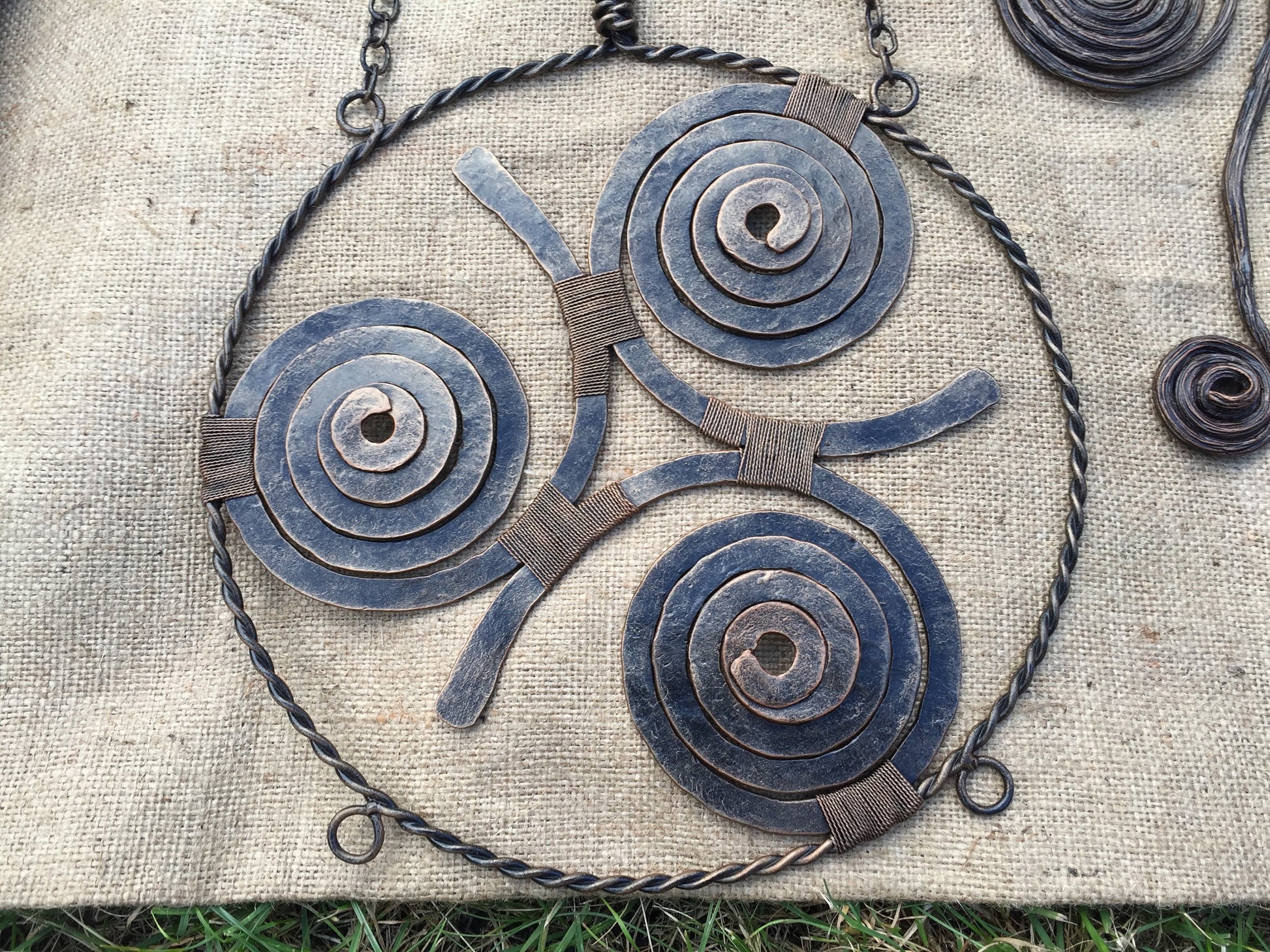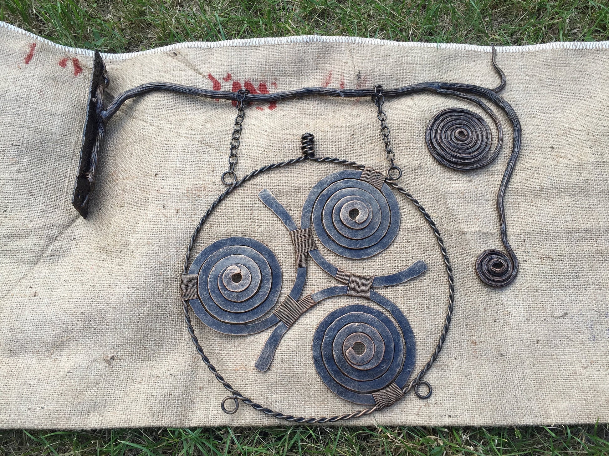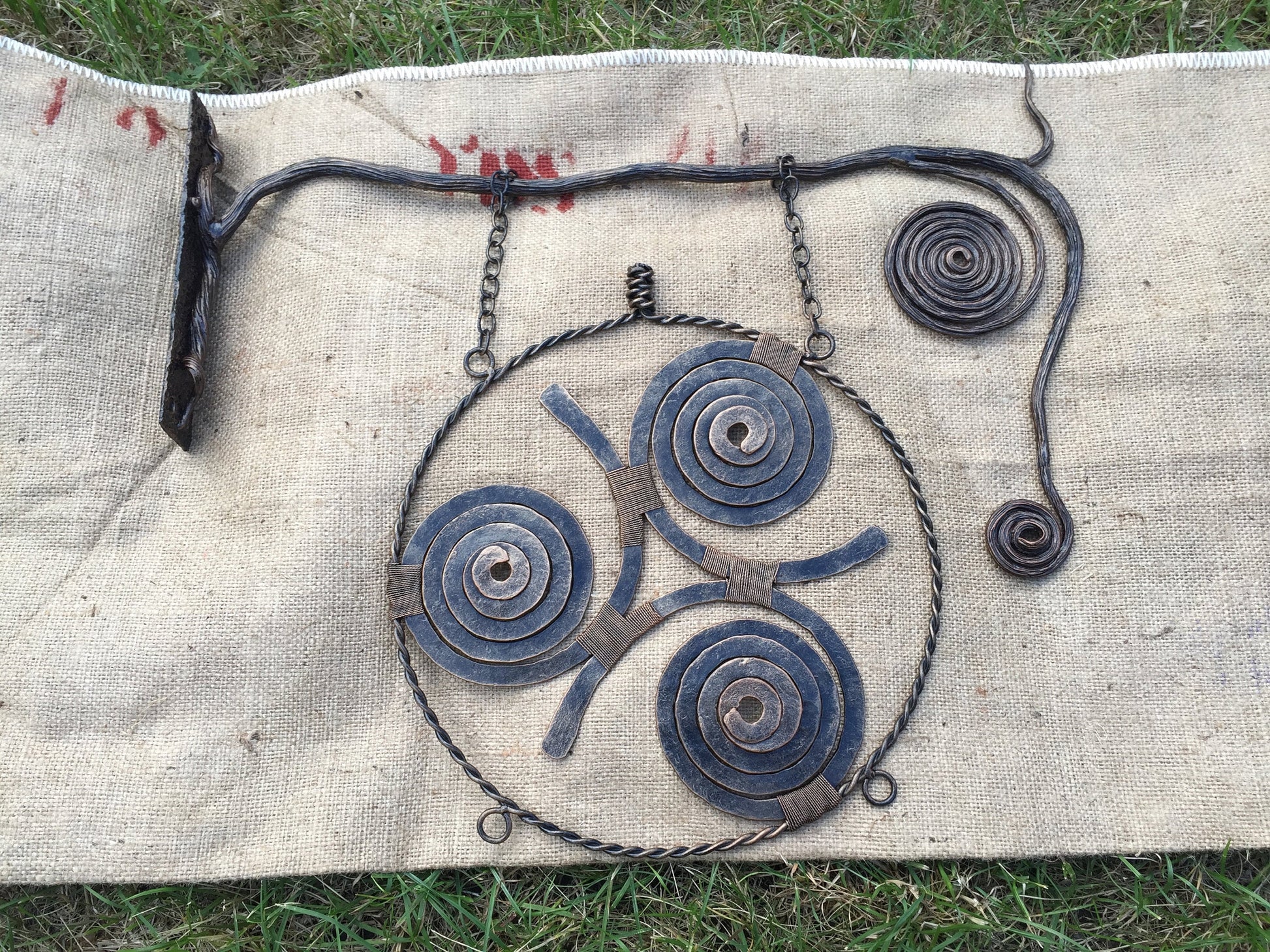 Here is a hand forged Viking amulet in a view of three spirals (triskele) which is wall hanging. It hangs on two chains, the chains are connected to a metal rod which is done in a view of a branch with a bark texture surface, also two twisted circles were added to the branch to make it more decortive looking.