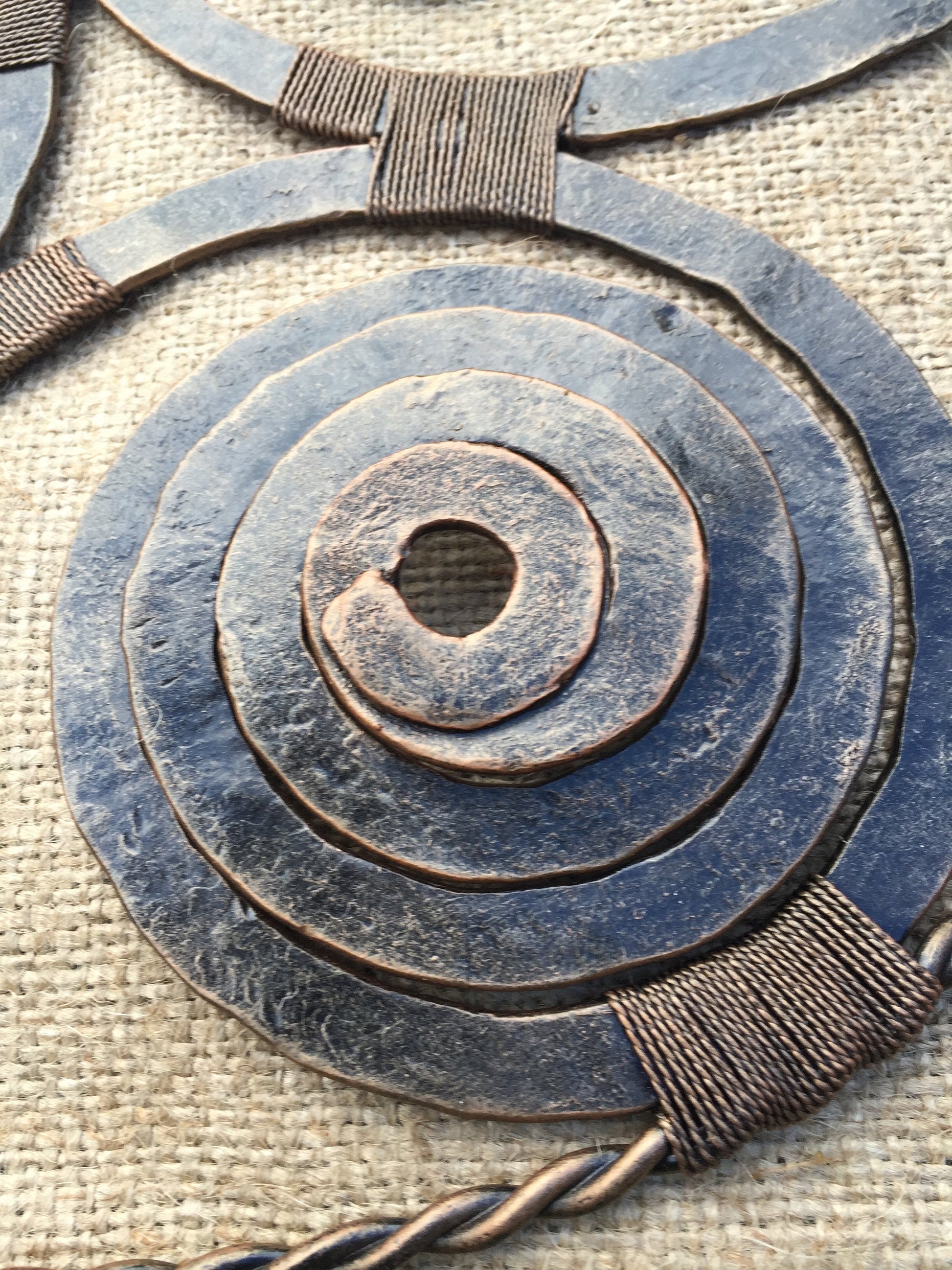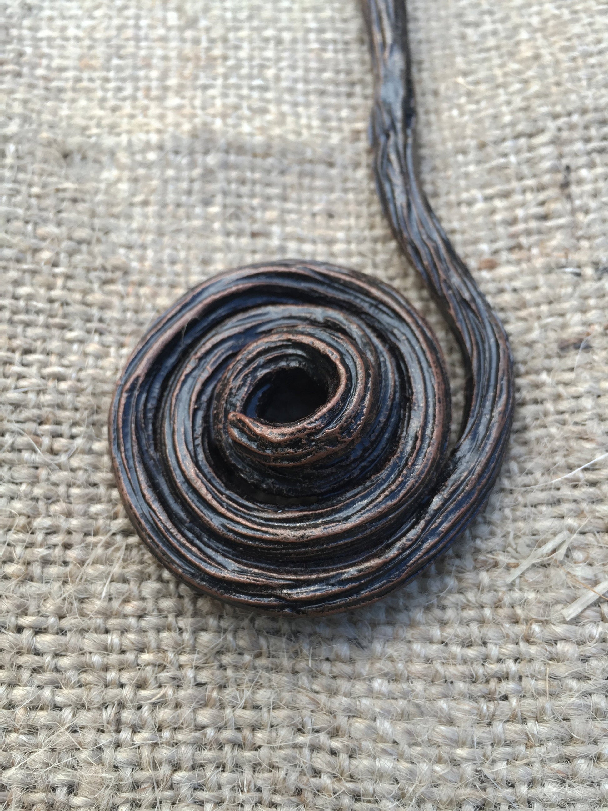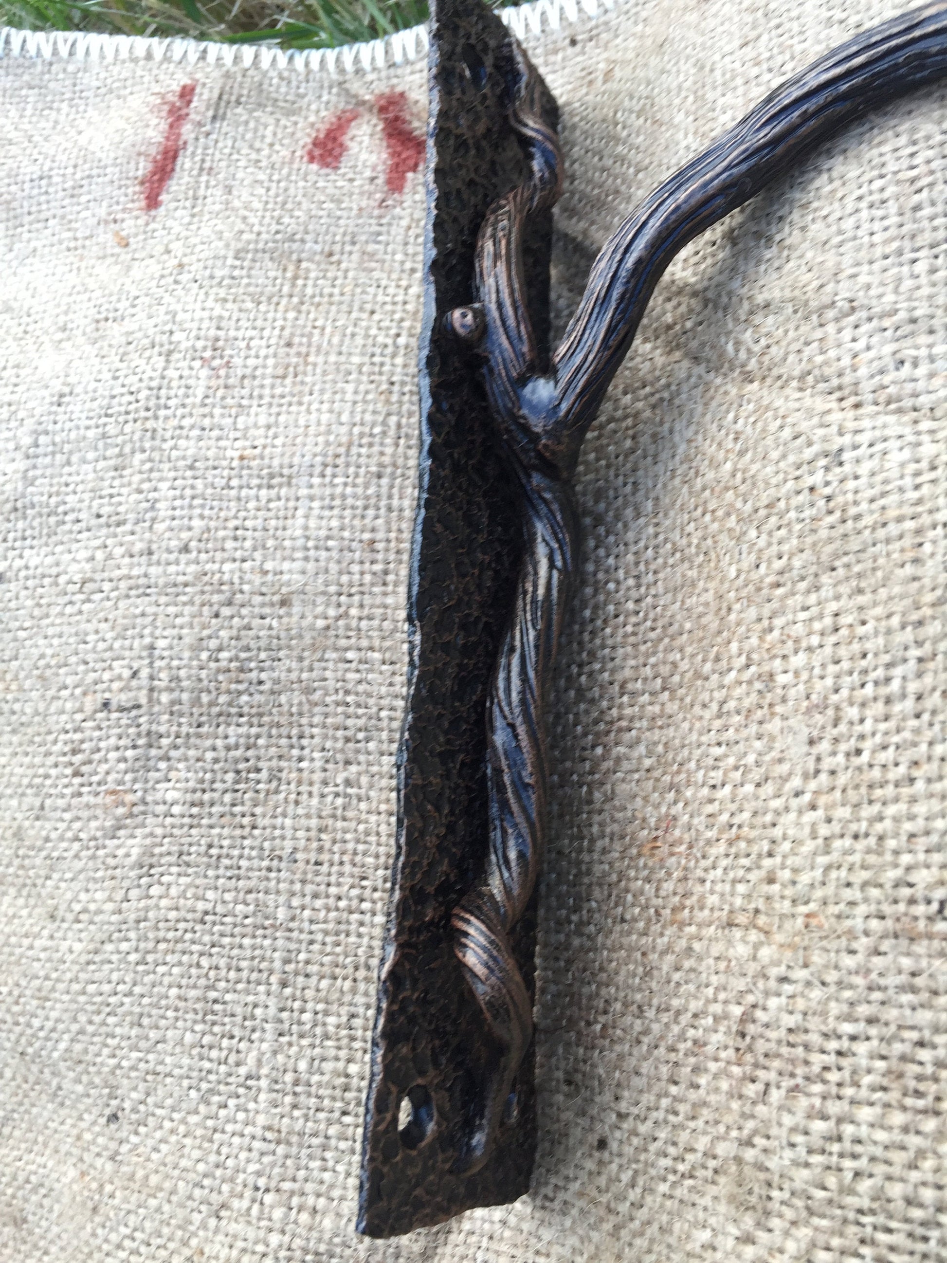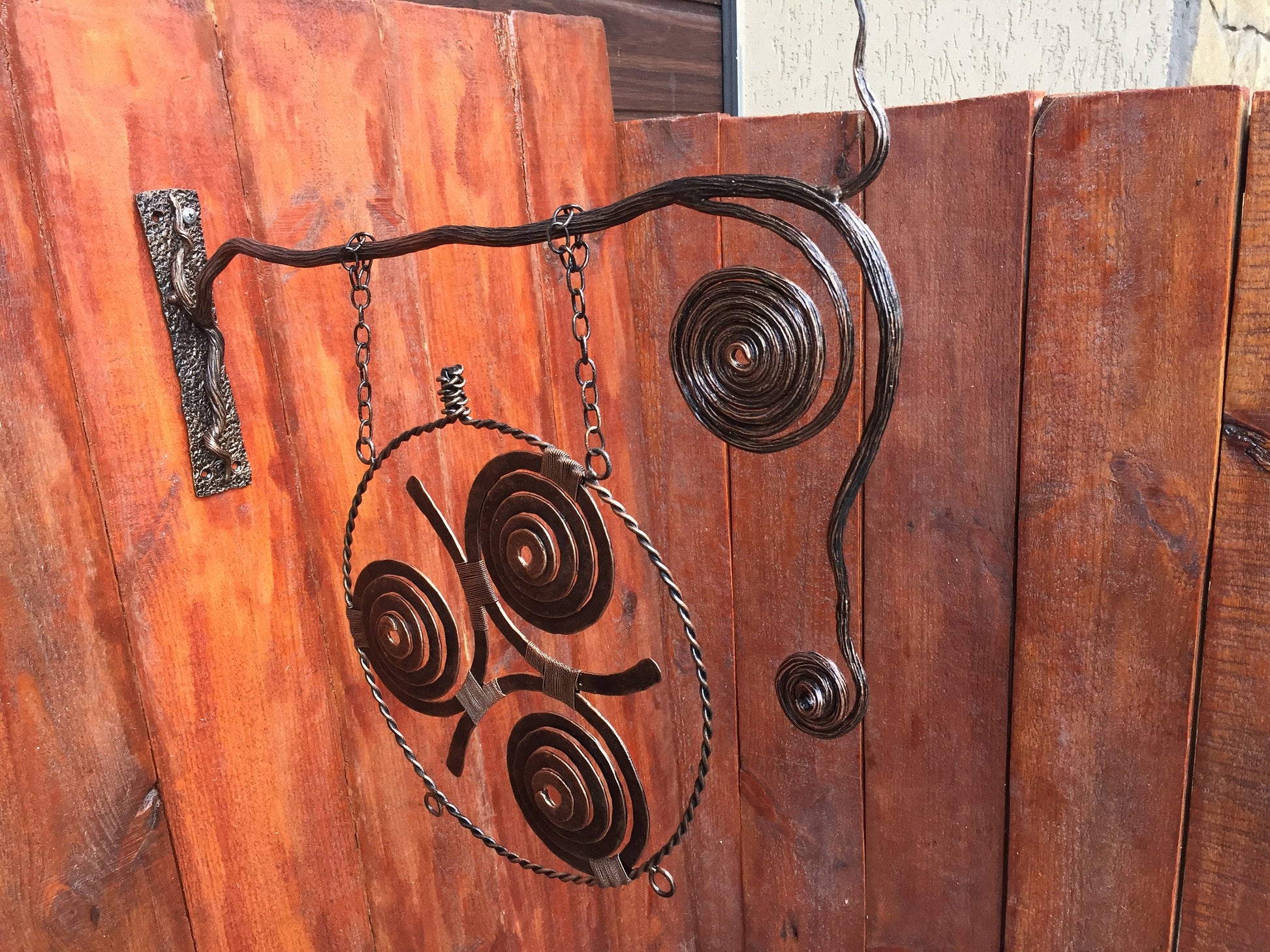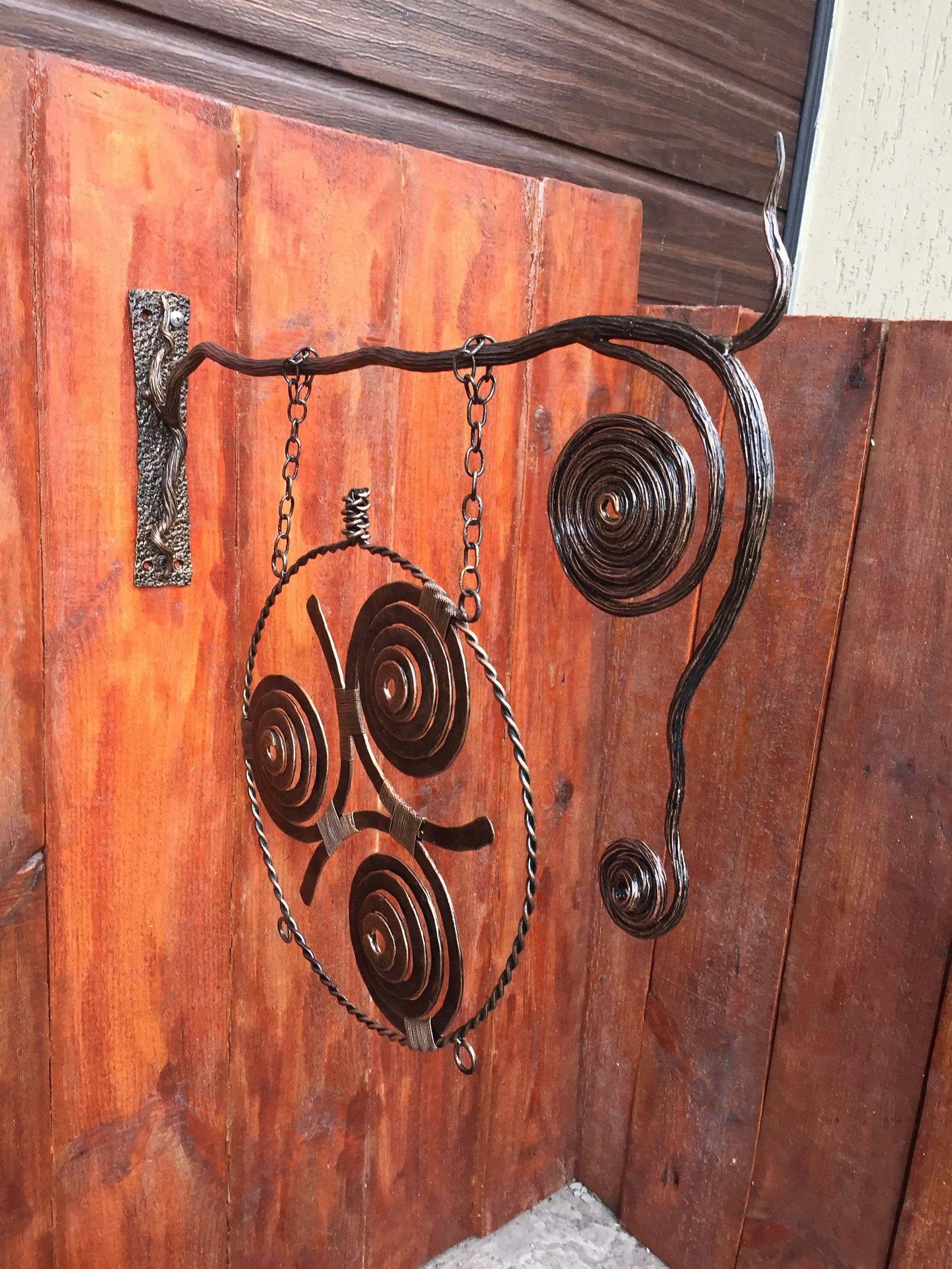 Here is a hand forged Viking amulet in a view of three spirals (triskele) which is wall hanging. It hangs on two chains, the chains are connected to a metal rod which is done in a view of a branch with a bark texture surface, also two twisted circles were added to the branch to make it more decortive looking.