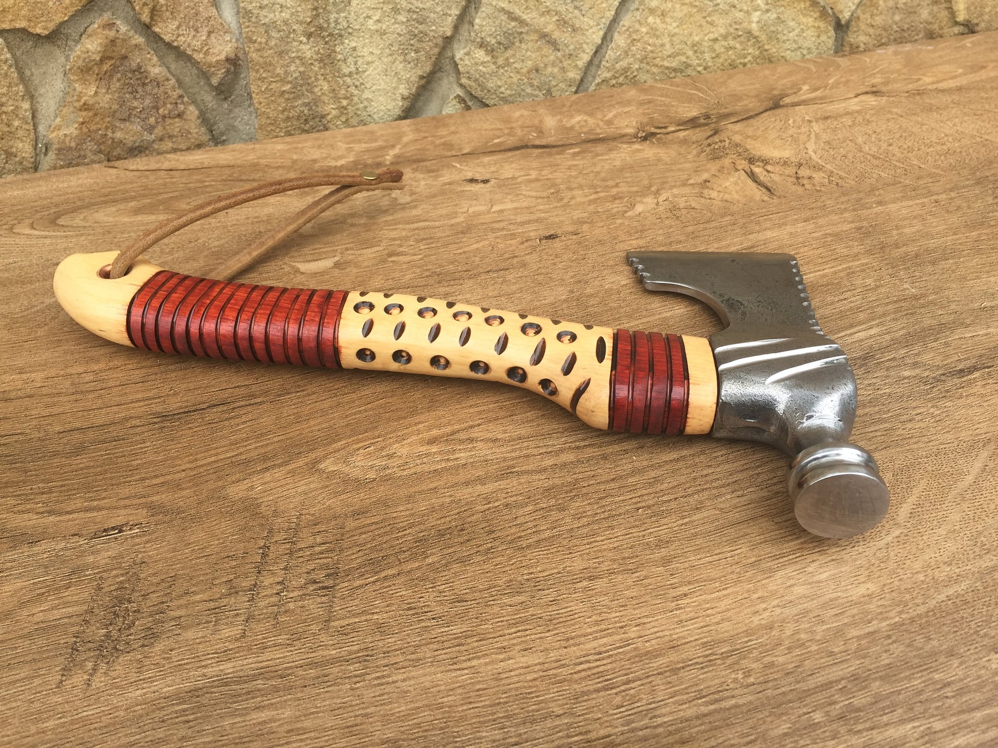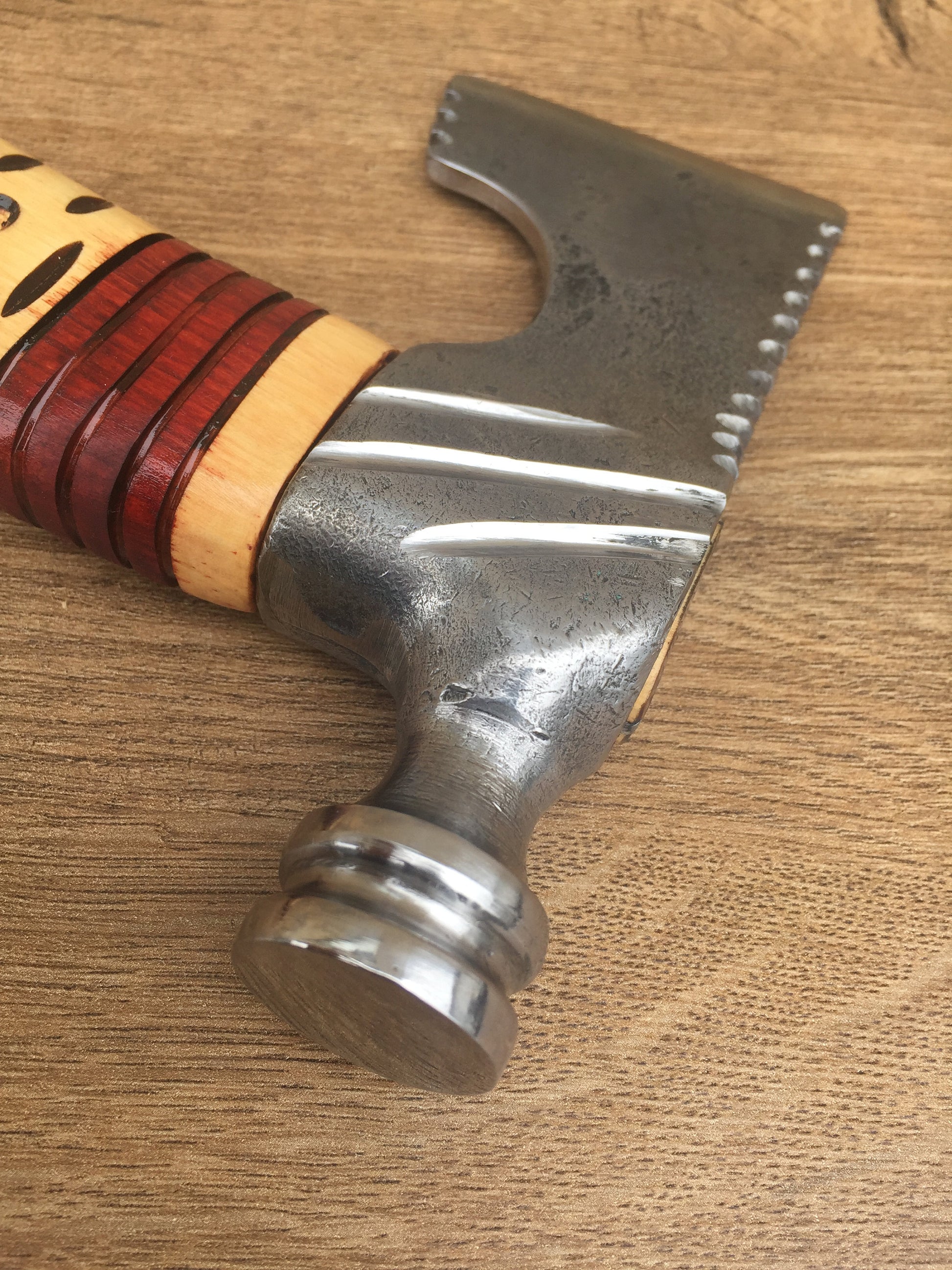 There is a leather belt on the handle (the belt goes via a copper pipe). The carved stripes on the handle with cherry color and black dots (wood burned) make it beautiful. It looks awesome in such a color with such a texture of the axe head!