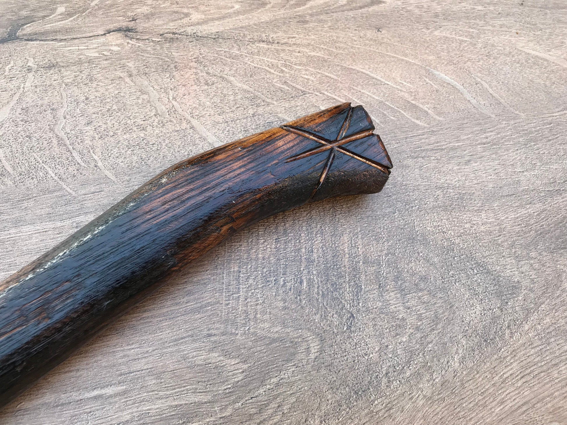 A compact outdoors axe, hand-forged and made from carbon steel using traditional blacksmith methods. The steel is stuck several times, increasing its density and thereby the durability of the axe. Perfect for packing in a rucksack, the axe can also be worn on a belt. It will be a perfect companion in your ventures through the wilds, through the woods of the pacific northwest, or at the cabin to make kindling to warm your hearthside.