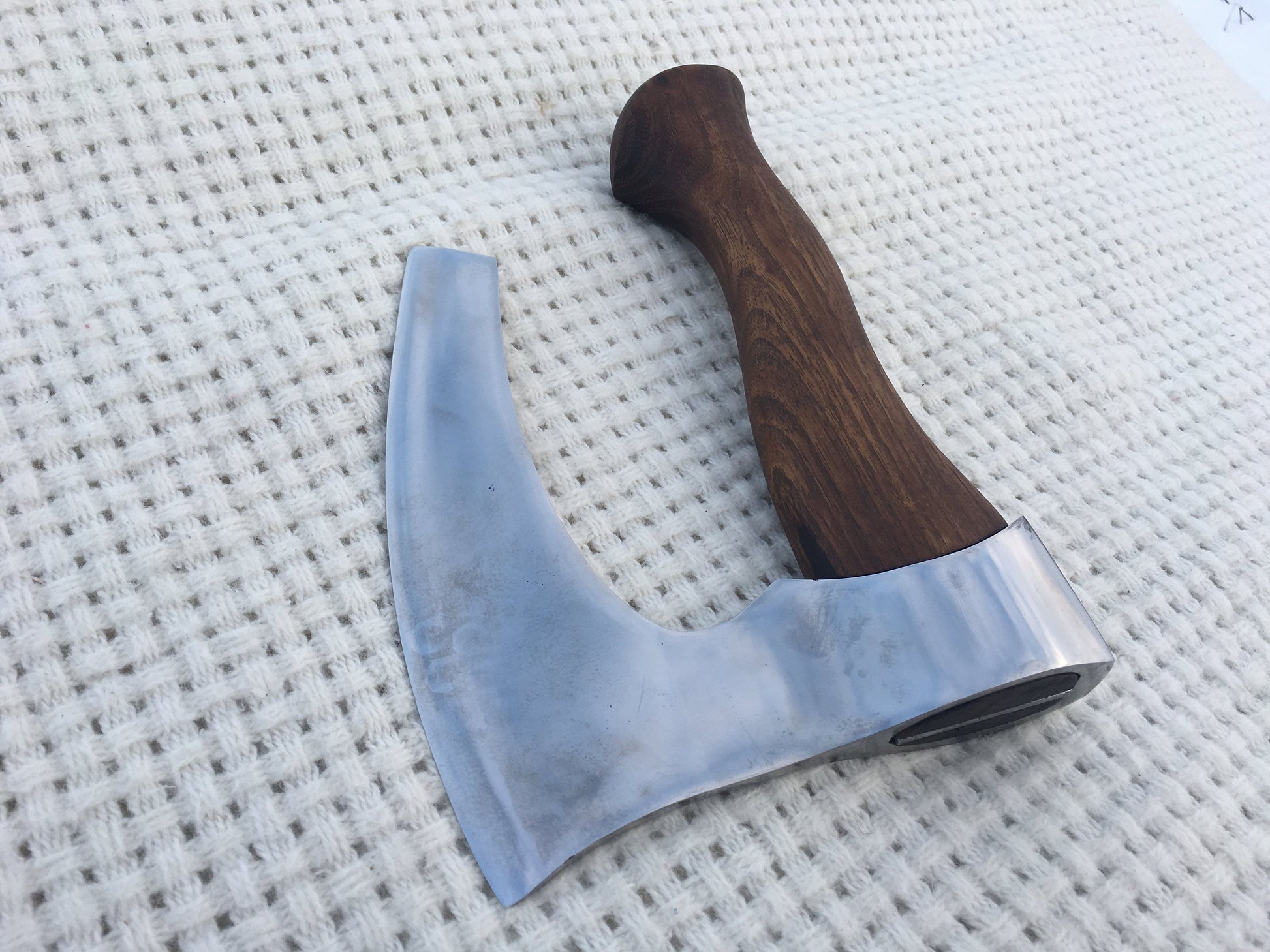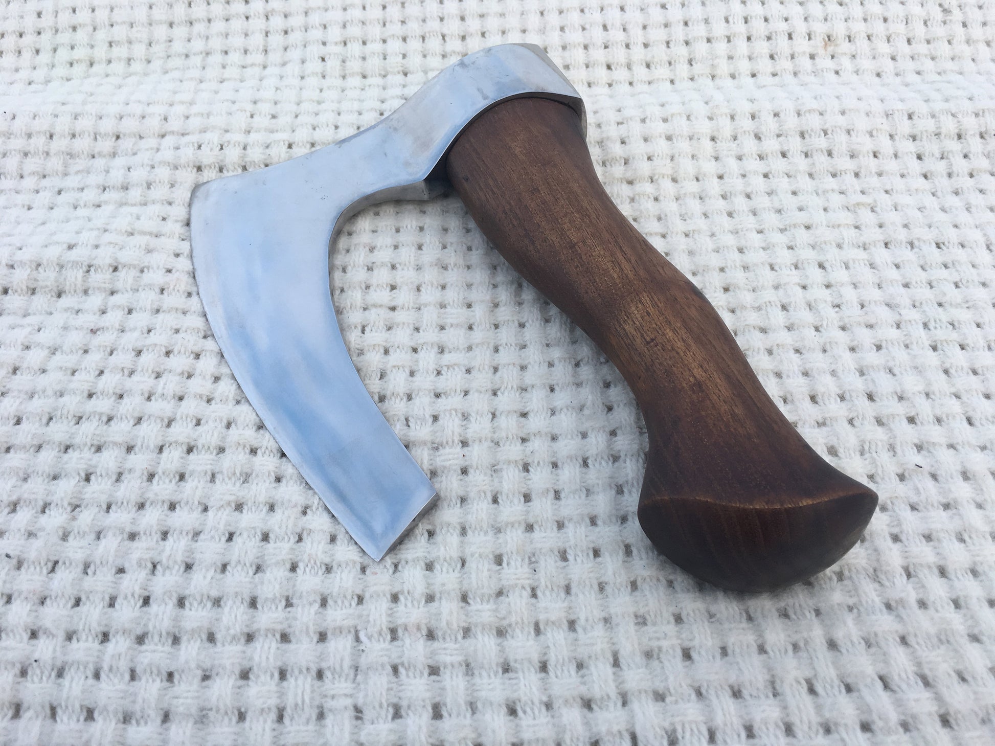A compact outdoors axe, with mirror blade, hand-forged and made from carbon steel using traditional blacksmith methods. The steel is stuck several times, increasing its density and thereby the durability of the axe. Perfect for packing in a rucksack, the axe can also be worn on a belt. It will be a perfect companion in your ventures through the wilds, through the woods of the pacific northwest, or at the cabin to make kindling to warm your hearthside. It has a wooden stump.