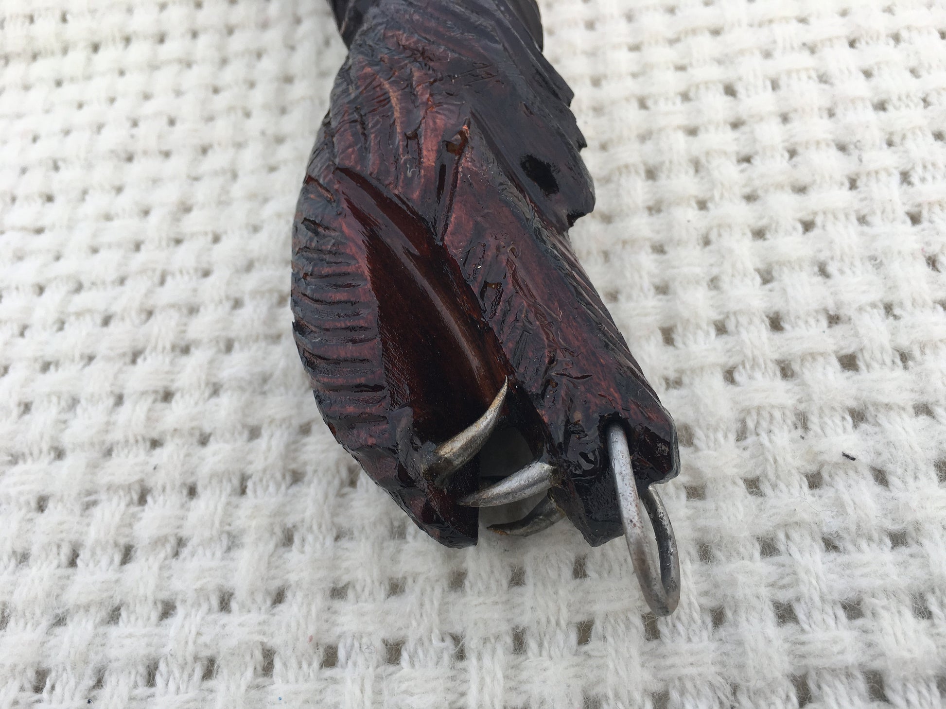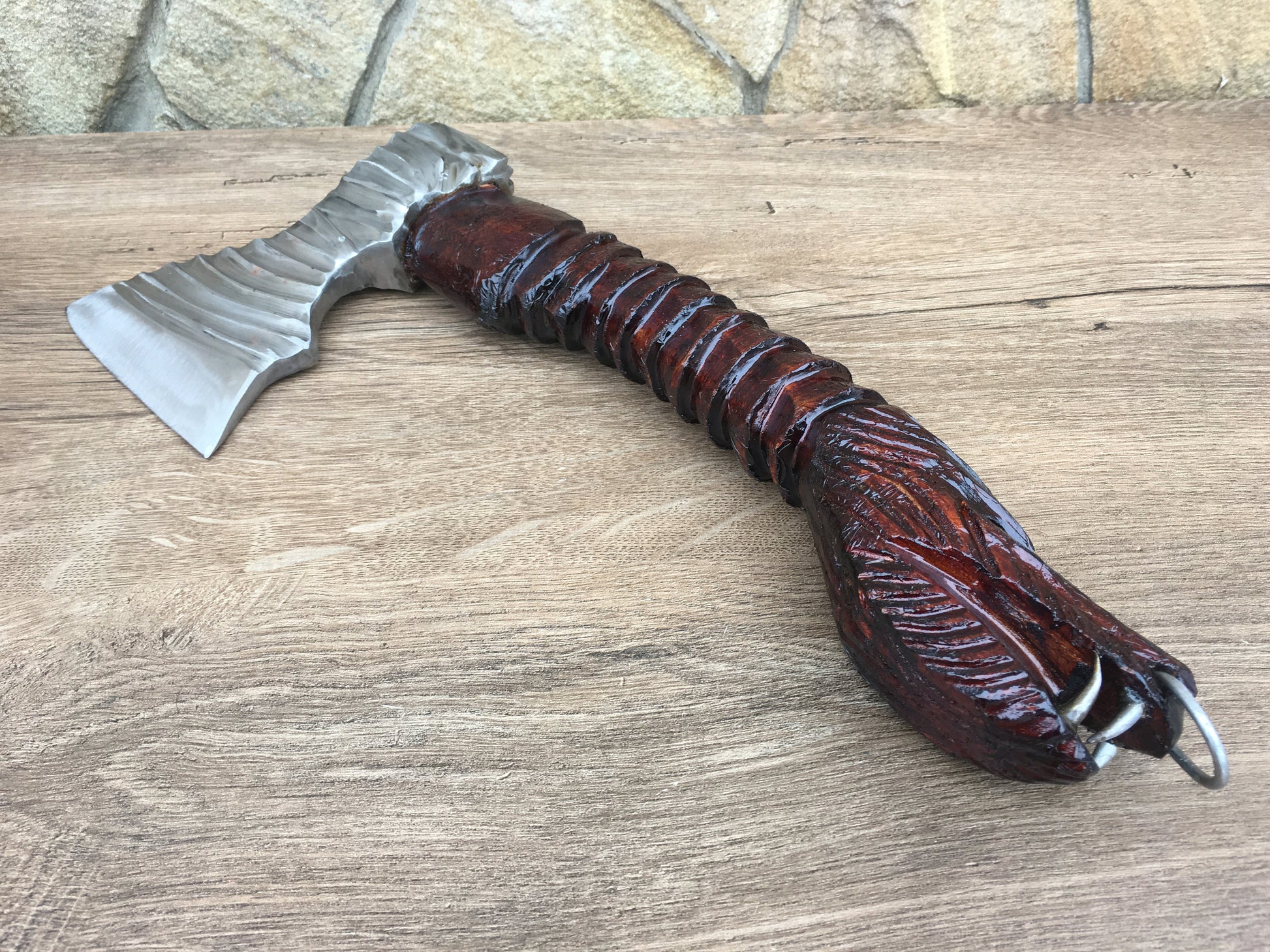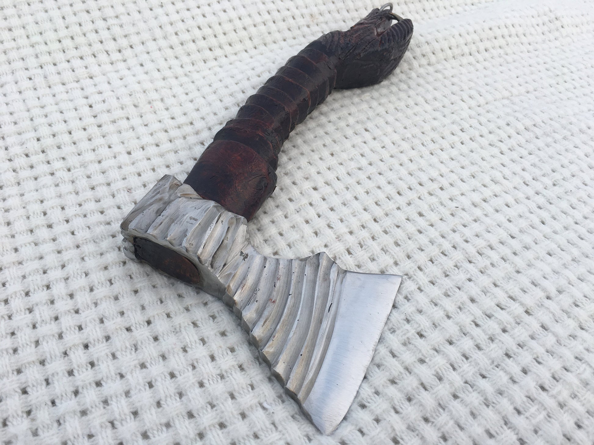Color of the handle: brown. On the top of the handle a dragon head with steel teeth is carved. The axe head is decorative done.