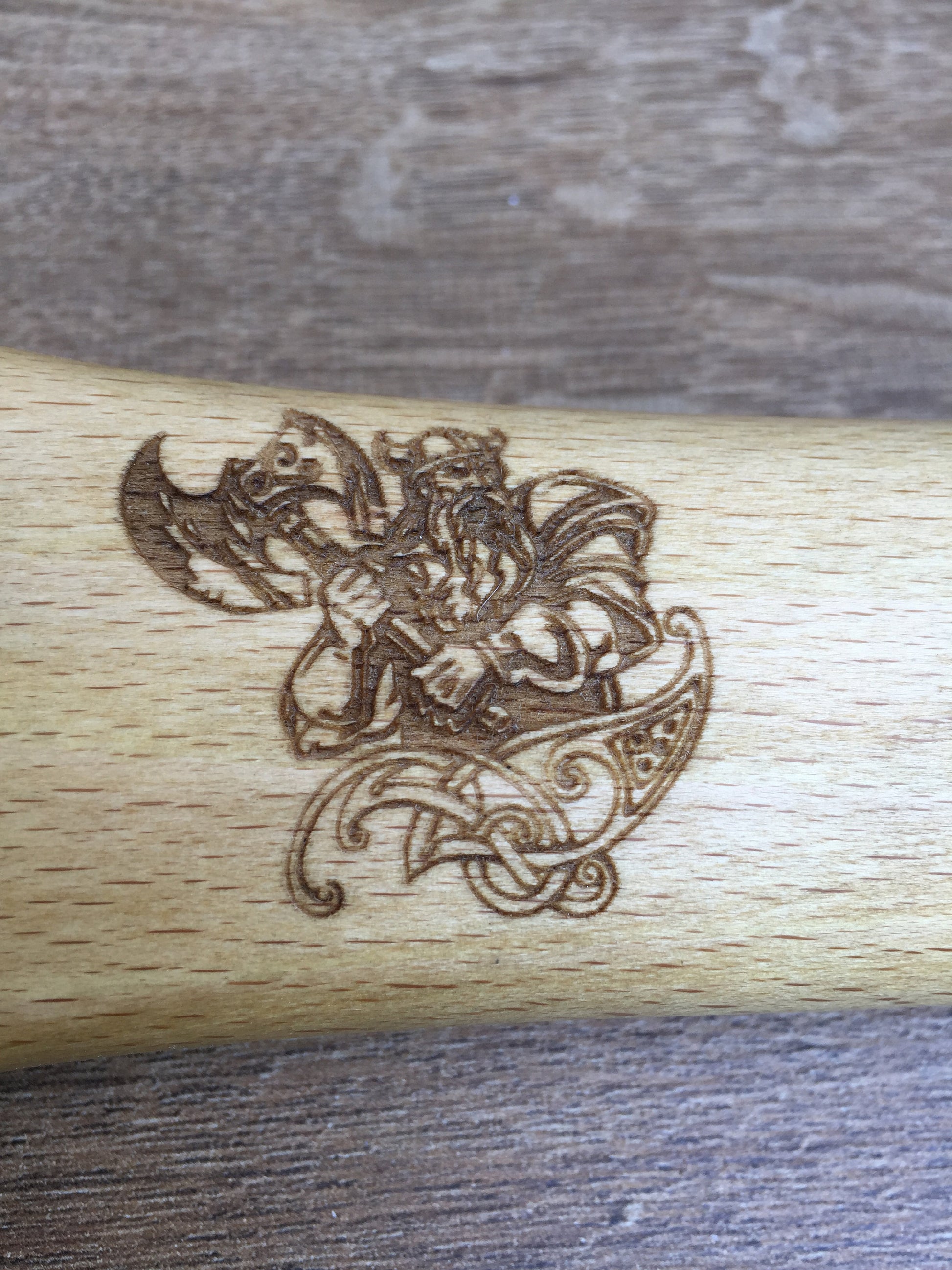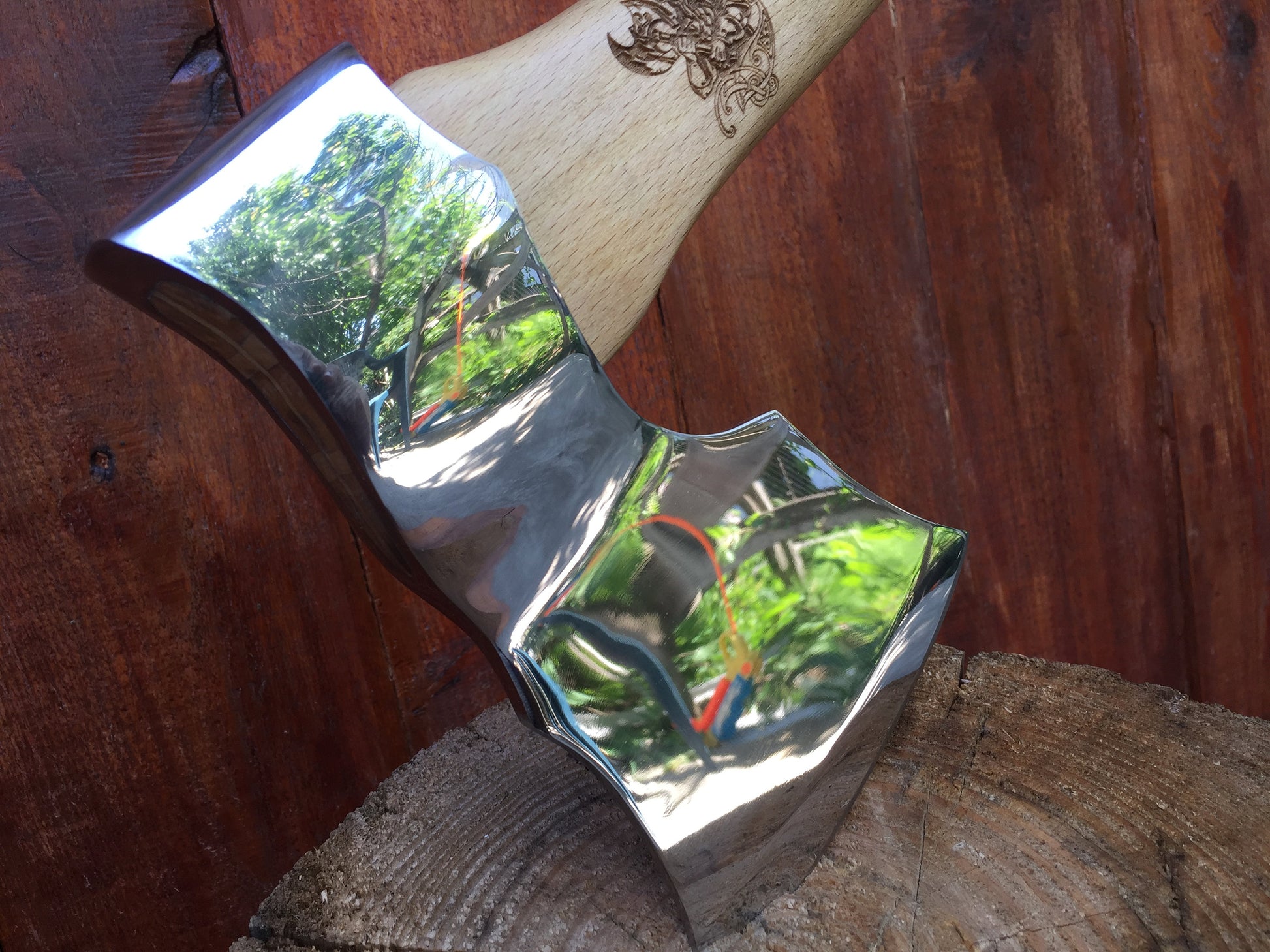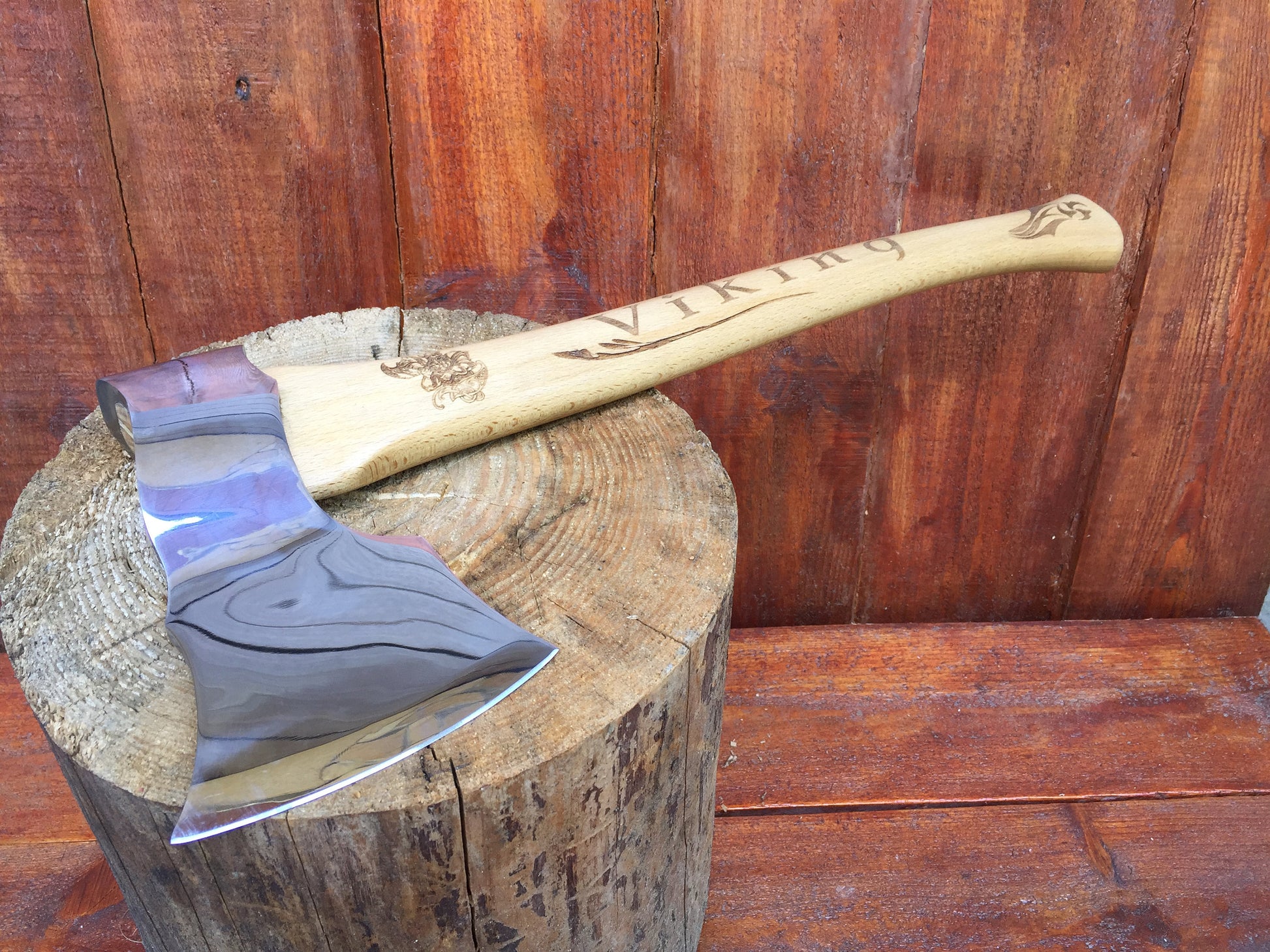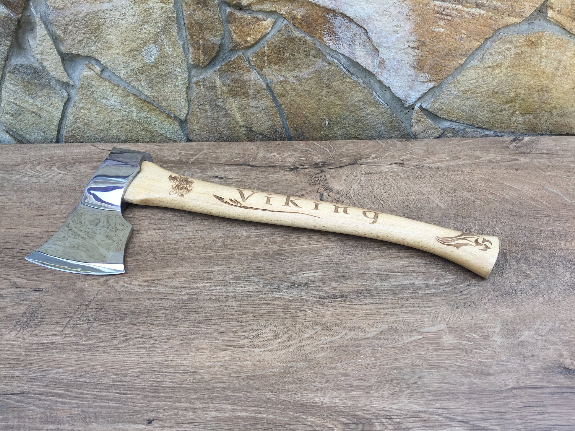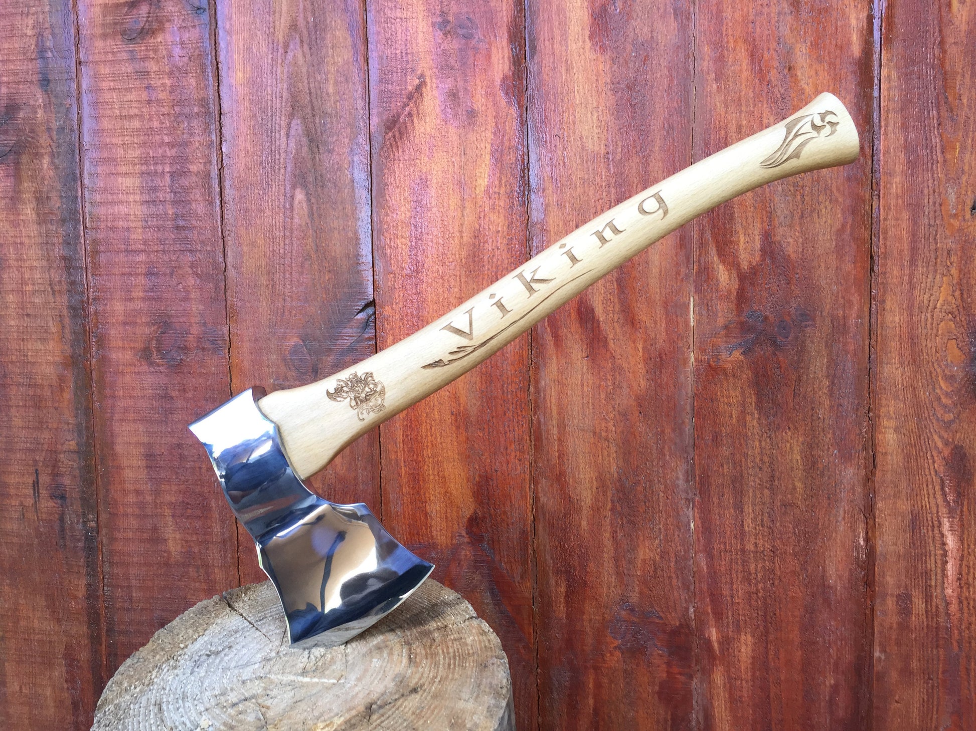 This unique axe has a nice mirroe metal structure, the handle is carved with small viking figures (from both sides), sun and a word "Viking". The handle is decoratively curved to allow fingers better feel it in the hand. It looks very decorative although it is a real axe! It is a high quality work!