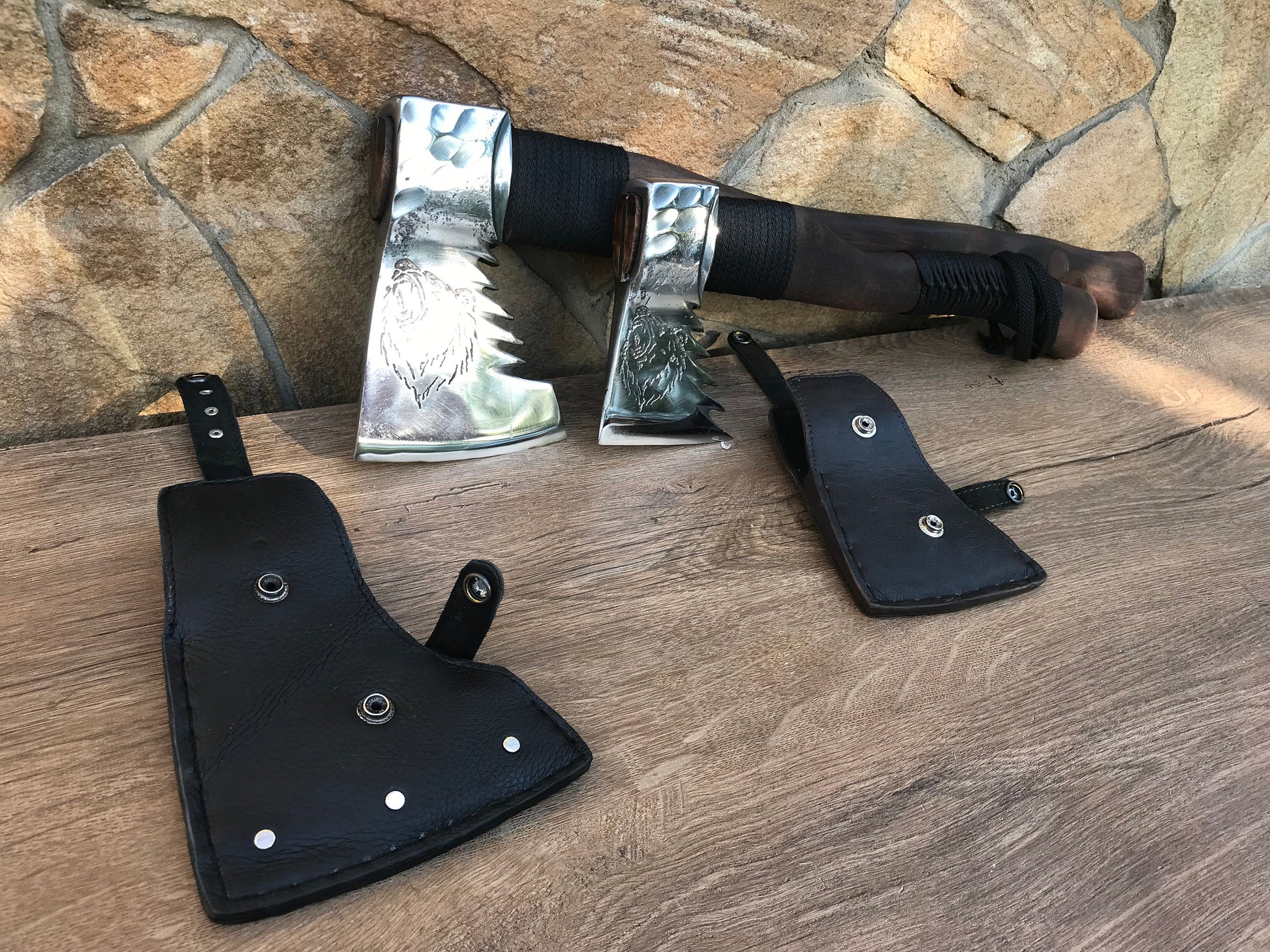A compact outdoors axes, with engraved bear head on the axe head, hand-forged and made from carbon steel using traditional blacksmith methods. The steel is stuck several times, increasing its density and thereby the durability of the axe. Perfect for packing in a rucksack, the axe can also be worn on a belt. It will be a perfect companion in your ventures through the wilds, through the woods of the pacific northwest, or at the cabin to make kindling to warm your hearthside. It has a wooden stump.