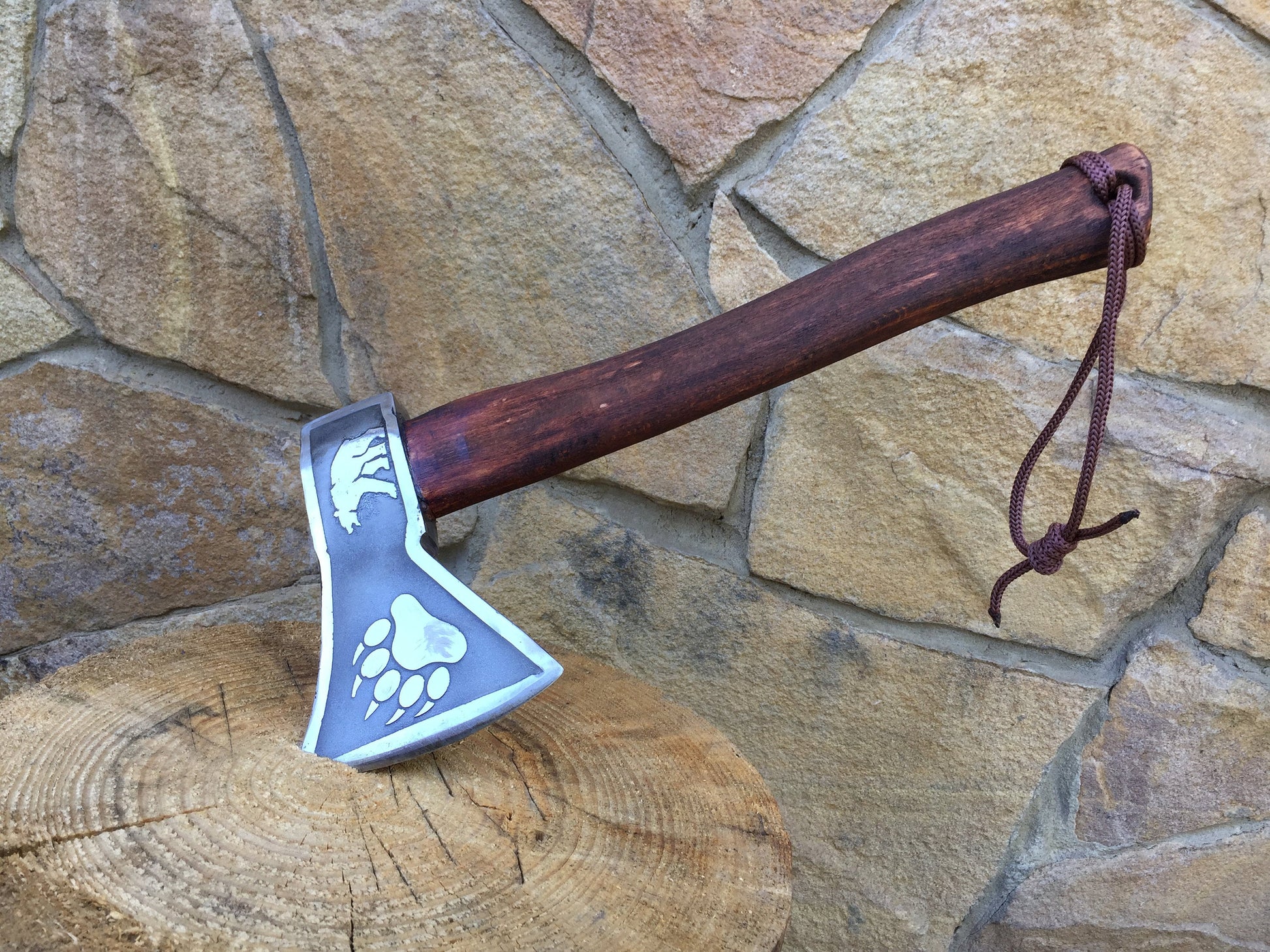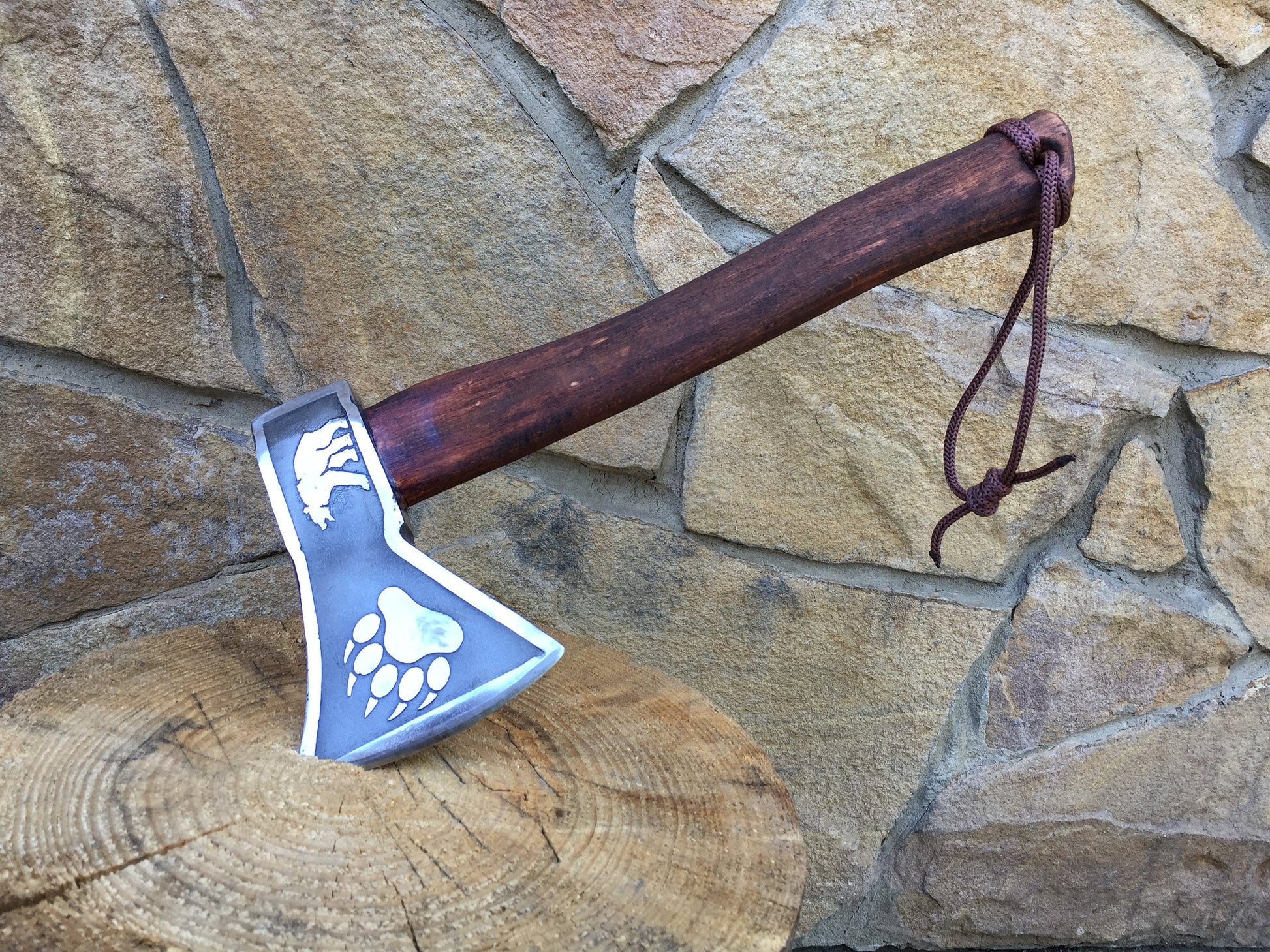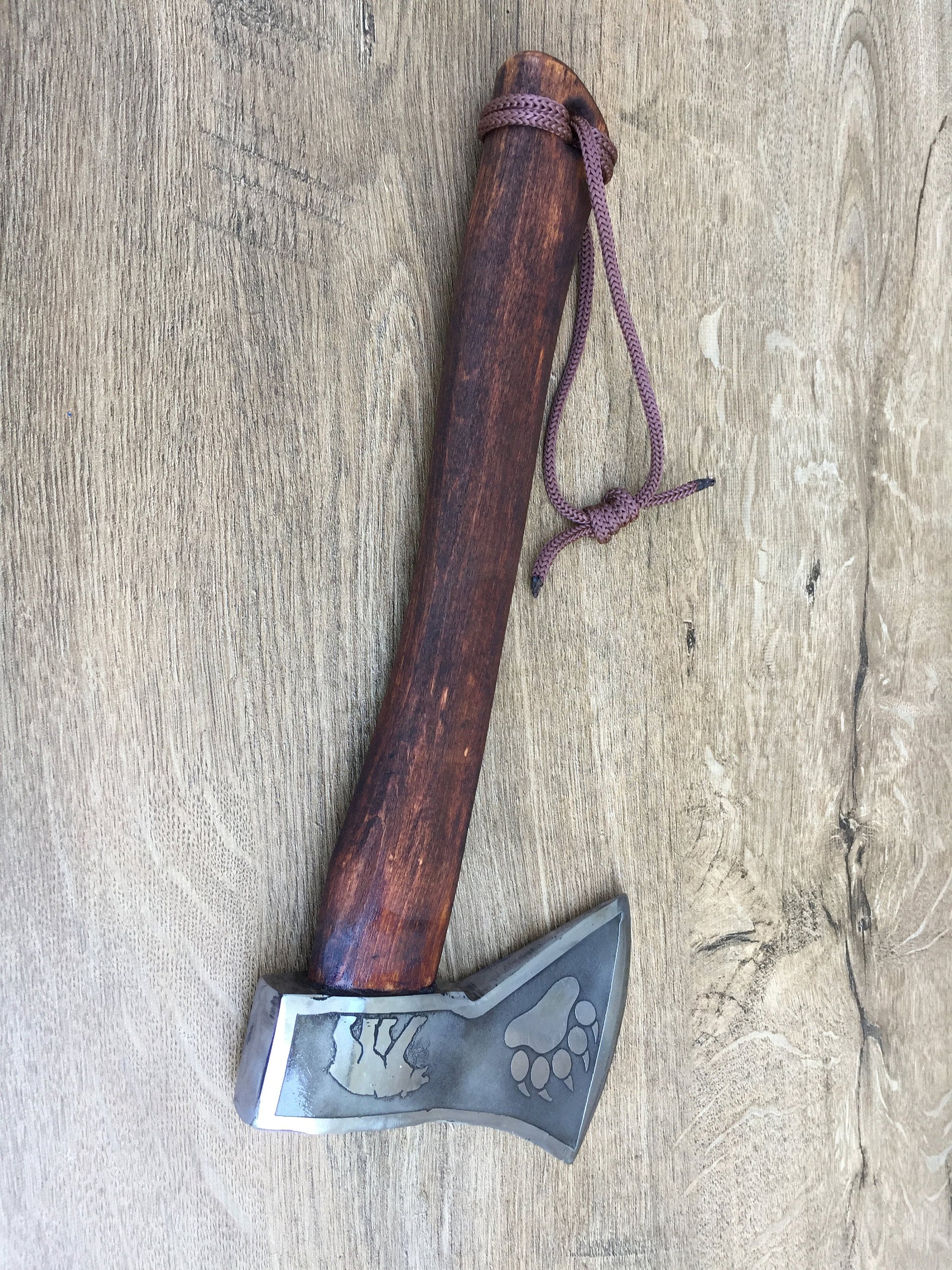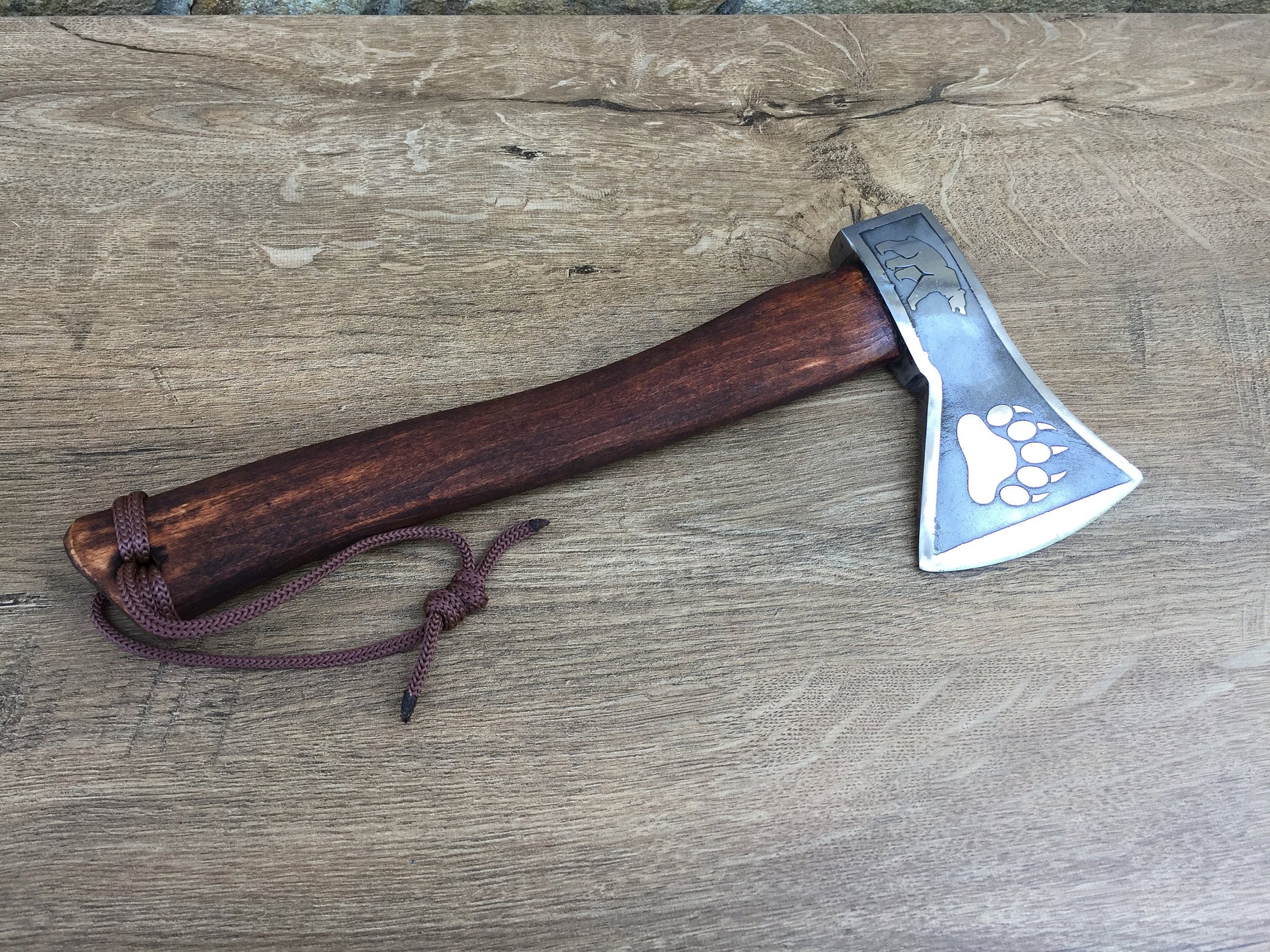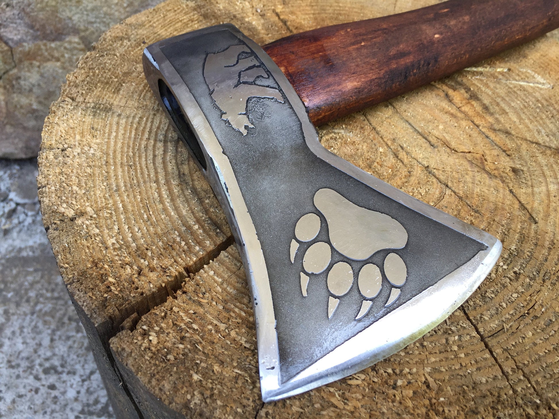 A compact outdoors axe, engraved with a bear and bear paw, hand-forged and made from carbon steel using traditional blacksmith methods. The steel is stuck several times, increasing its density and thereby the durability of the axe. Perfect for packing in a rucksack, the axe can also be worn on a belt. It will be a perfect companion in your ventures through the wilds, through the woods of the pacific northwest, or at the cabin to make kindling to warm your hearthside. It has a wooden stump.