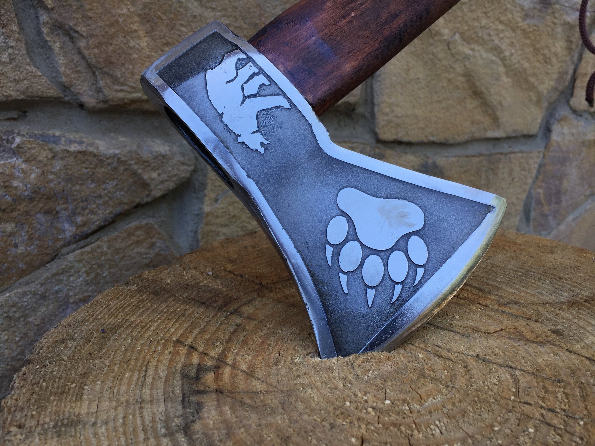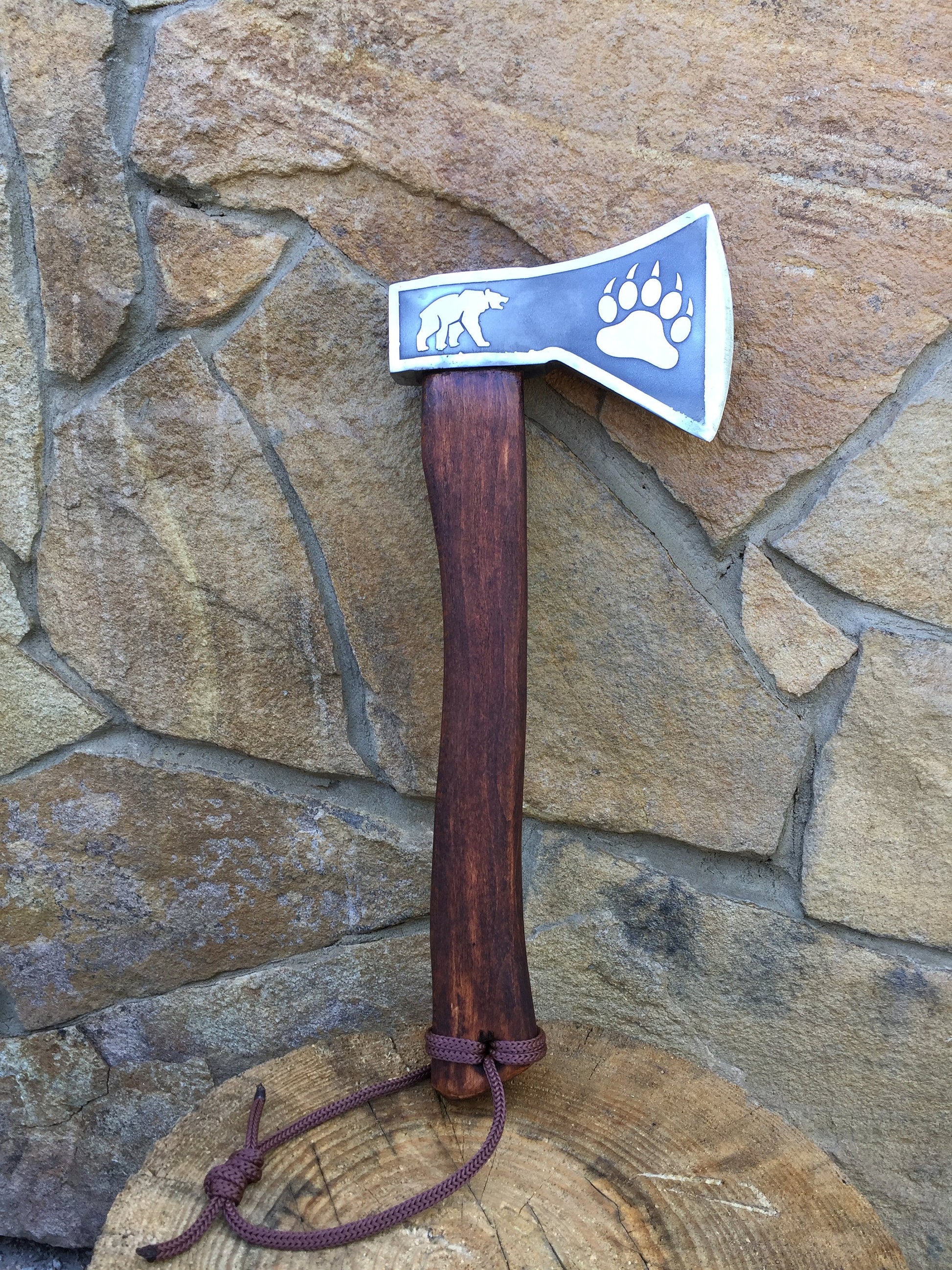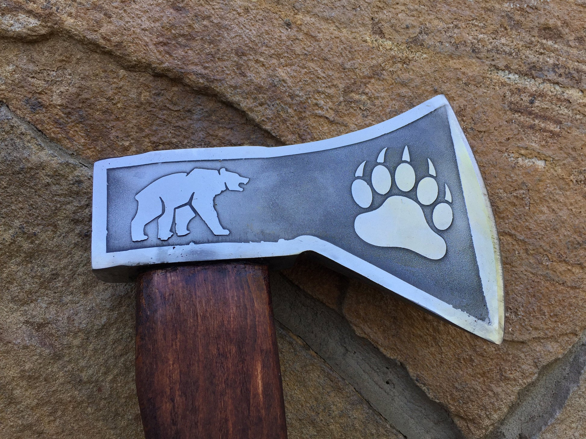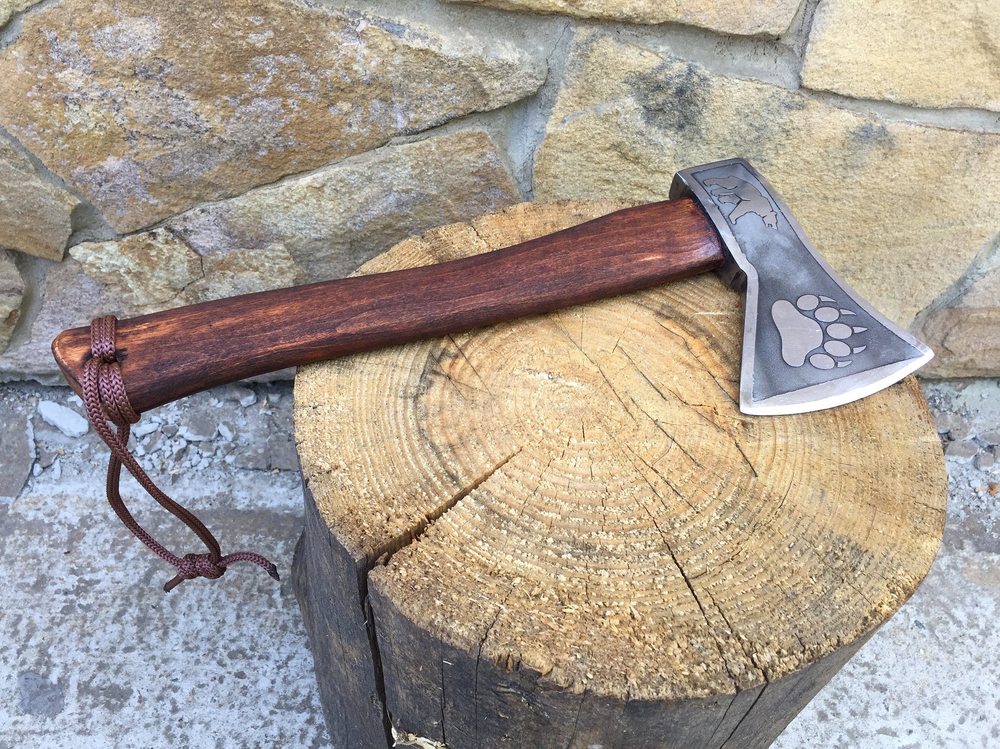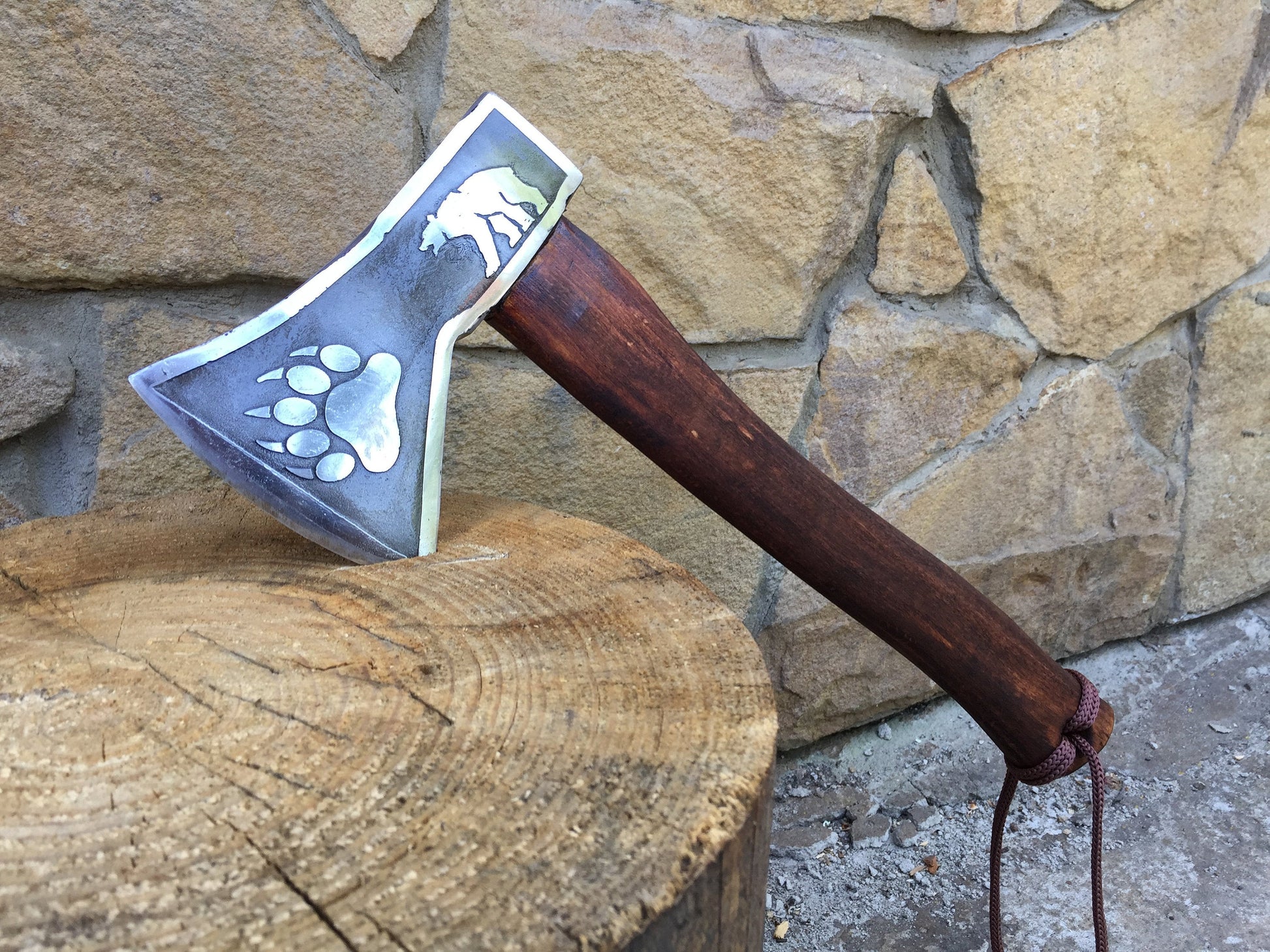 A compact outdoors axe, engraved with a bear and bear paw, hand-forged and made from carbon steel using traditional blacksmith methods. The steel is stuck several times, increasing its density and thereby the durability of the axe. Perfect for packing in a rucksack, the axe can also be worn on a belt. It will be a perfect companion in your ventures through the wilds, through the woods of the pacific northwest, or at the cabin to make kindling to warm your hearthside. It has a wooden stump.