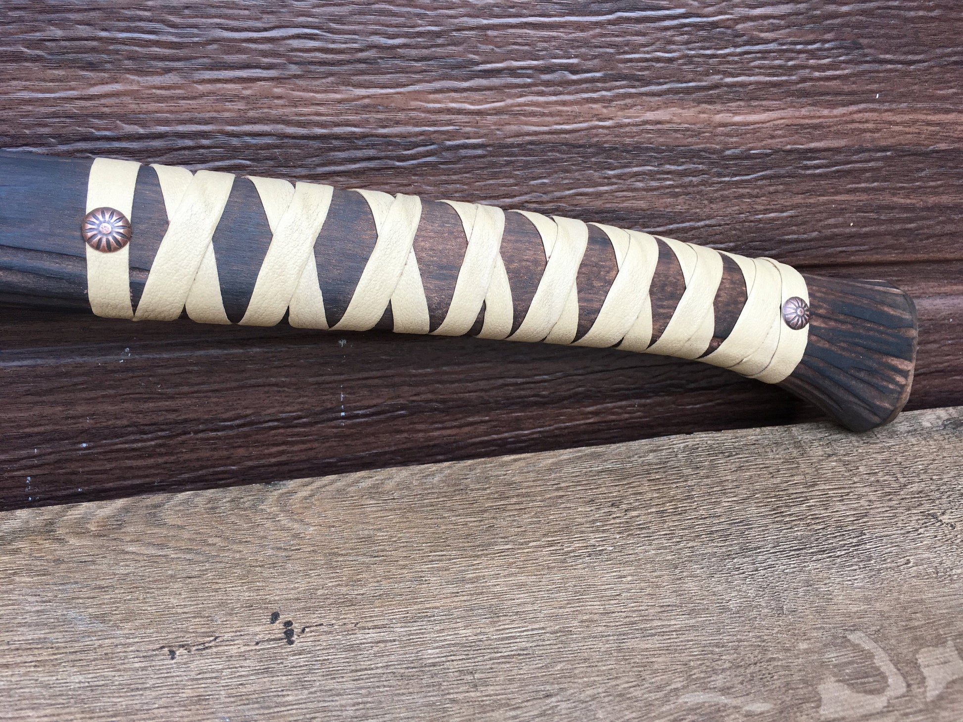 Color of the handle: brown, with a nice leather stripe, nicely carved wood. The axe head looks awesome thanks to decorative texture. A scorpion is etched on one side of the axe head.