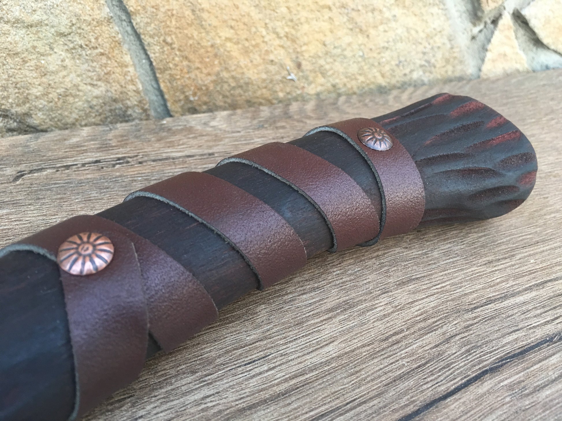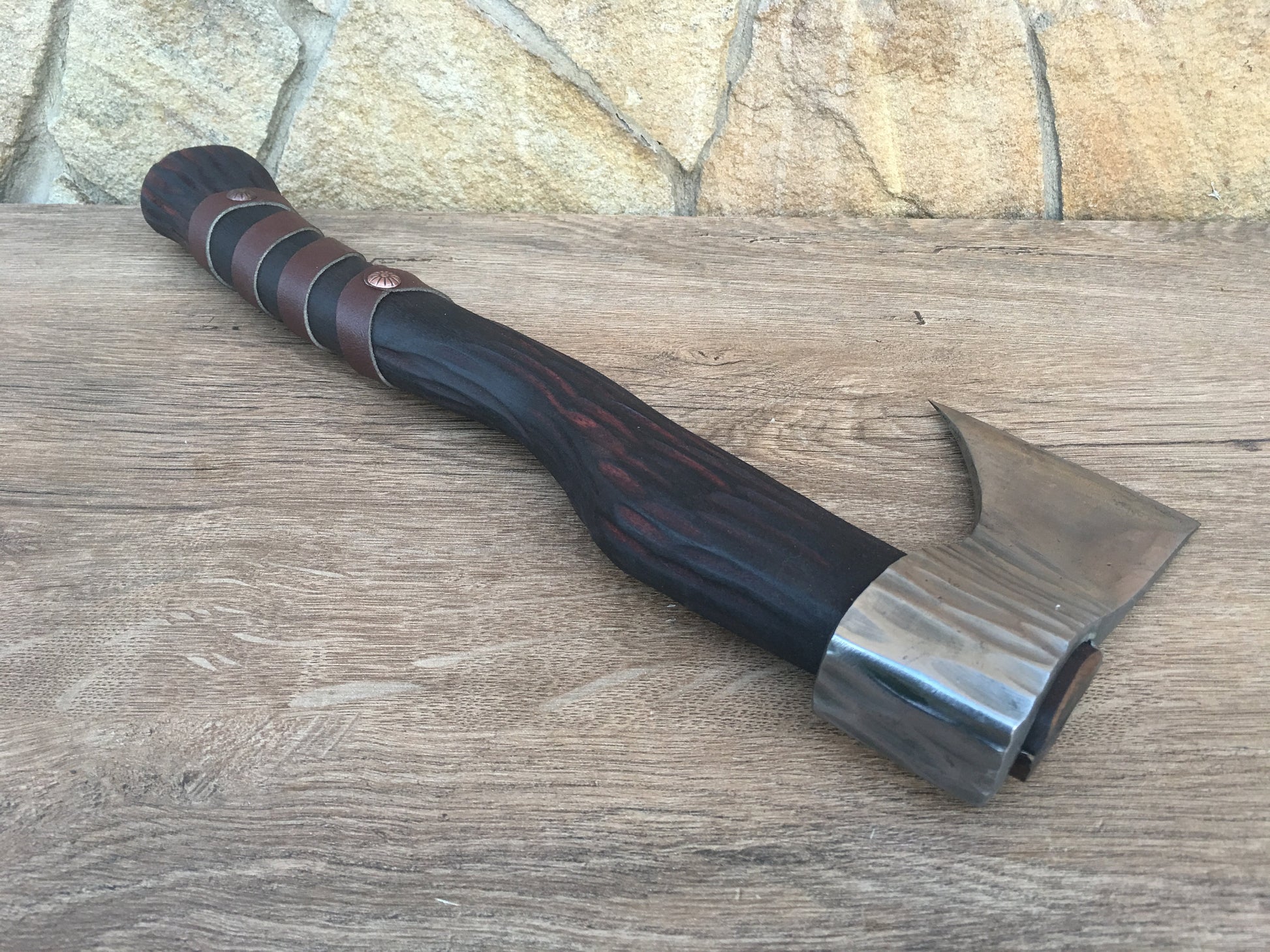Color of the handle: brown, with a nice leather stripe, nicely carved wood. The axe head looks awesome thanks to decorative texture.