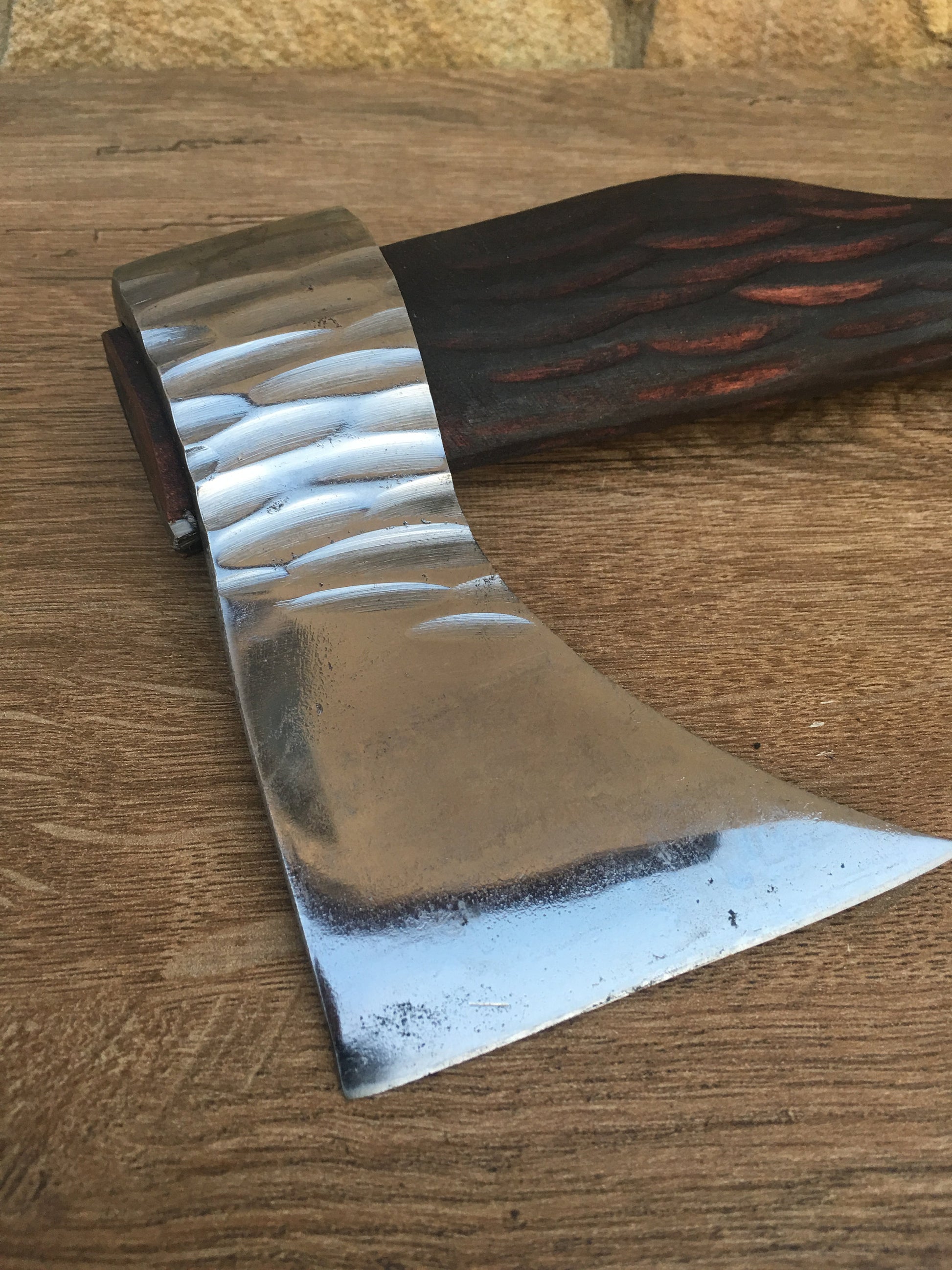 A compact outdoors axe, hand-forged and made from carbon steel using traditional blacksmith methods. The steel is stuck several times, increasing its density and thereby the durability of the axe. Perfect for packing in a rucksack, the axe can also be worn on a belt. It will be a perfect companion in your ventures through the wilds, through the woods of the pacific northwest, or at the cabin to make kindling to warm your hearthside. It has a wooden stump.