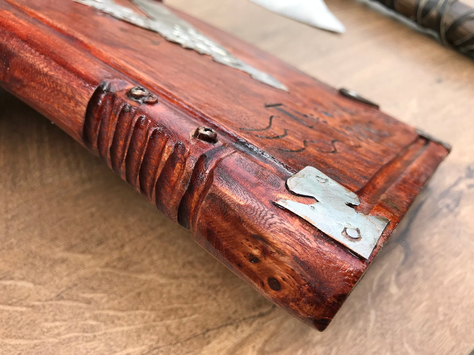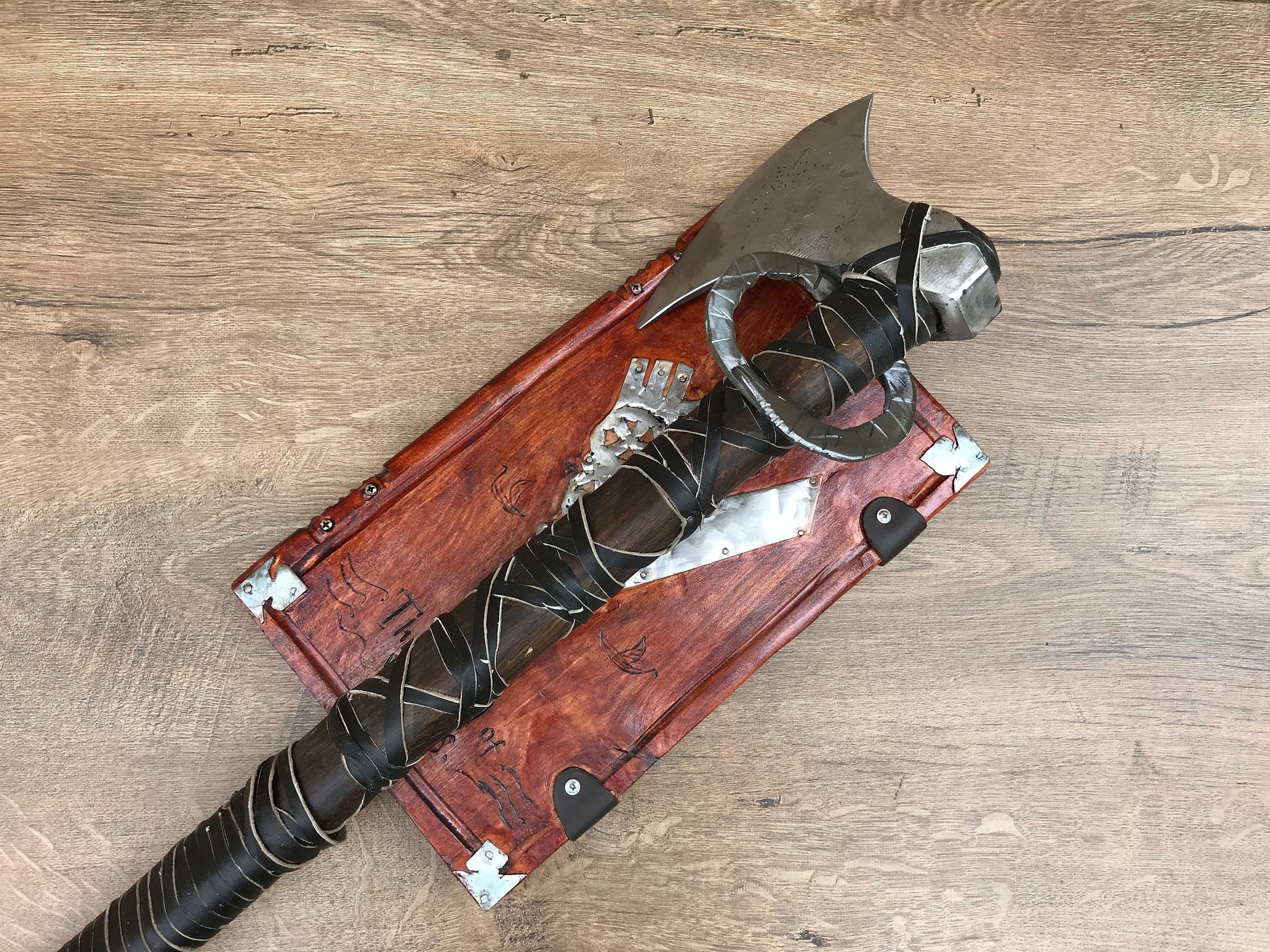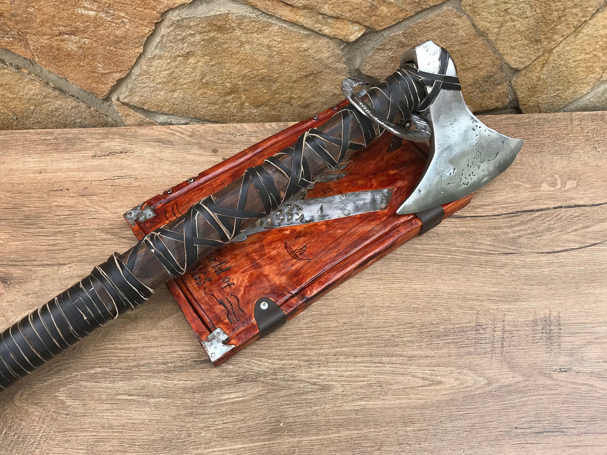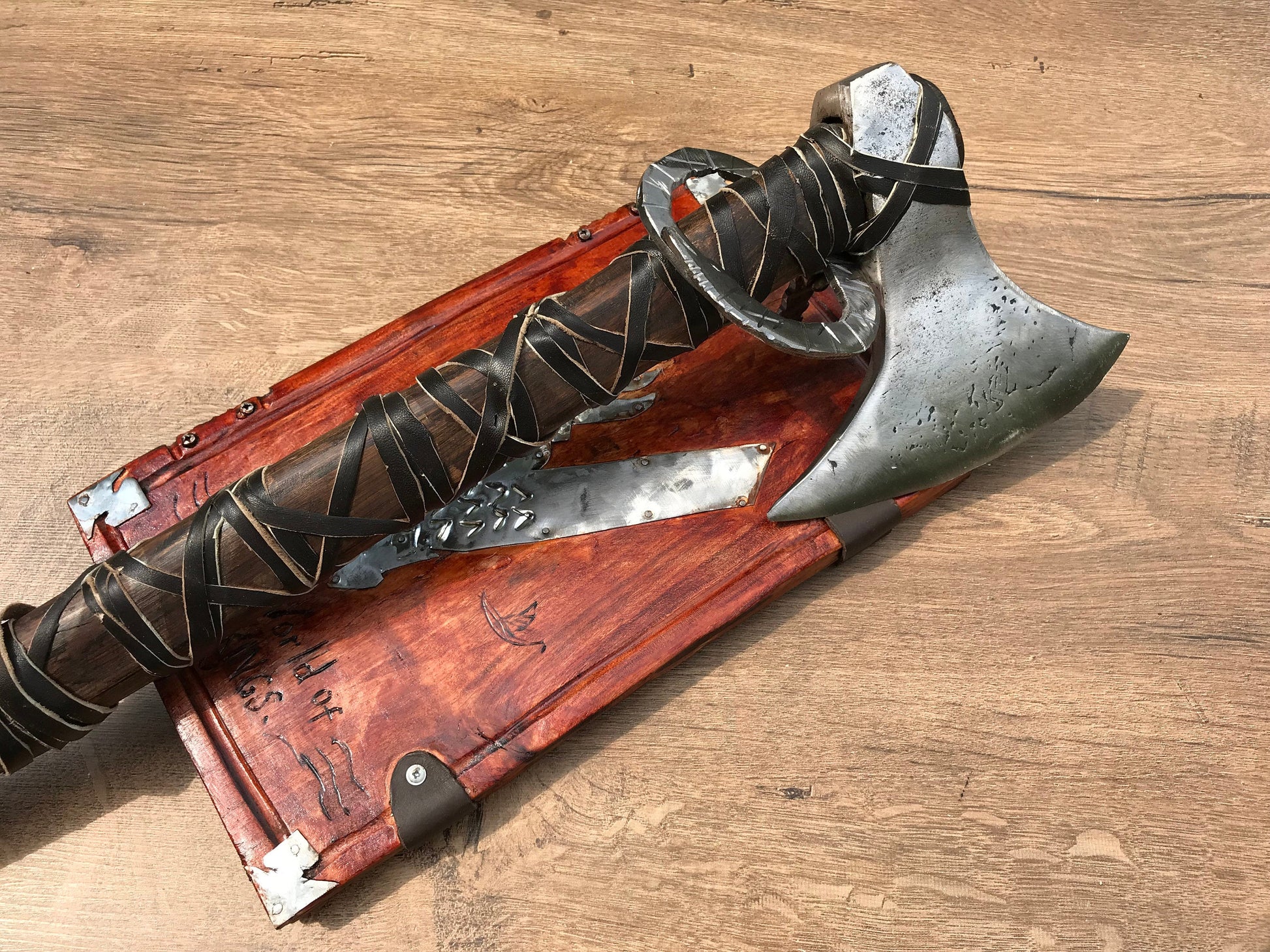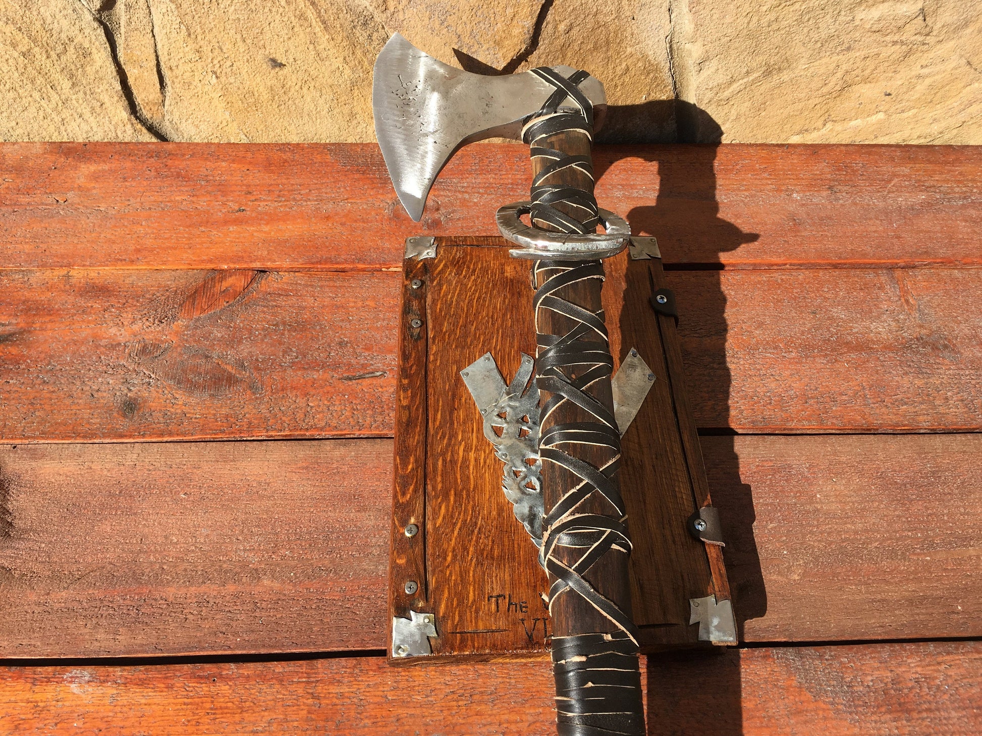 A compact outdoors Ragnar Lothbrok axe with the wall axe holder. The steel is stuck several times, increasing its density and thereby the durability of the axe. Perfect for packing in a rucksack, the axe can also be worn on a belt. It will be a perfect companion in your ventures through the wilds, through the woods of the pacific northwest, or at the cabin to make kindling to warm your hearthside. It has a wooden stump.