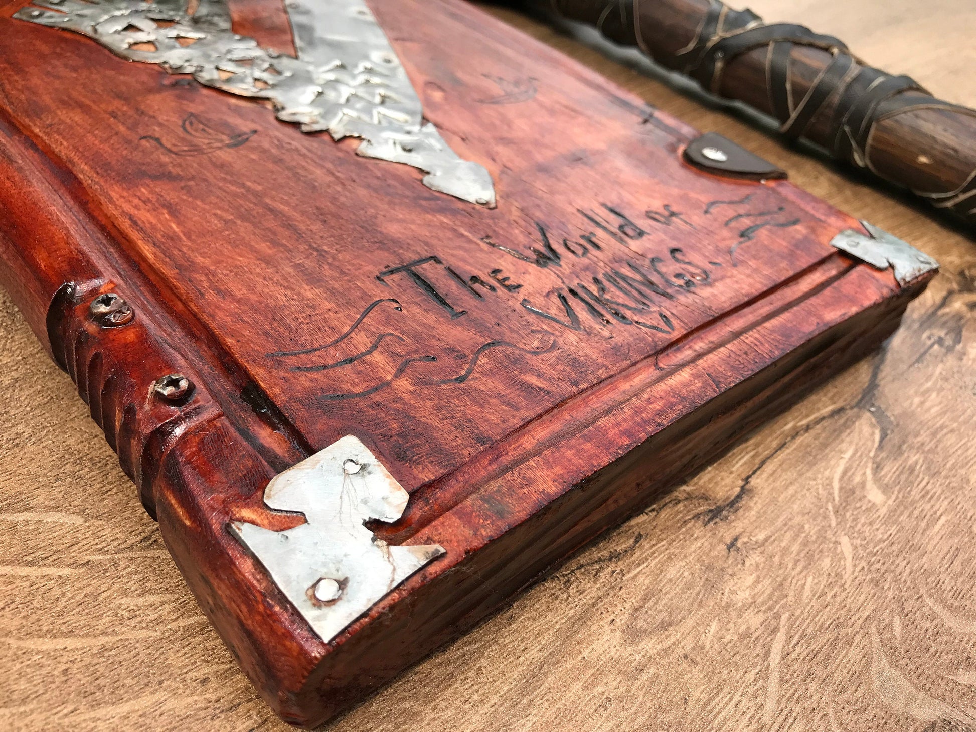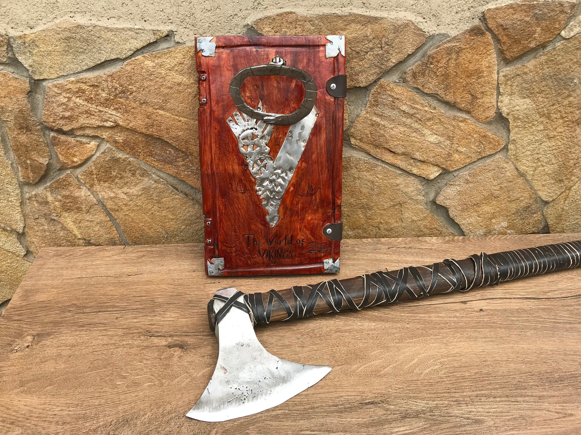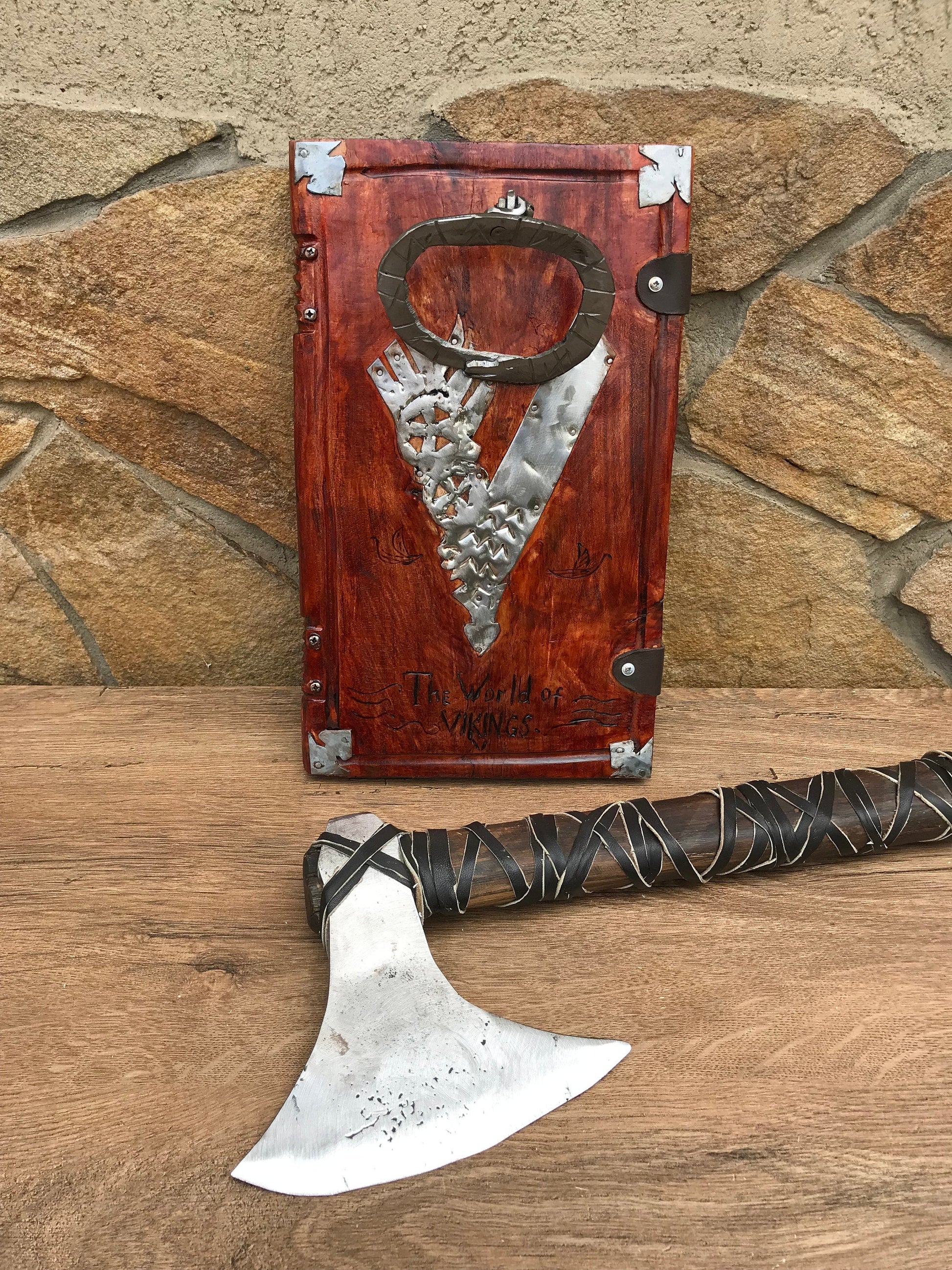 Axe holder is done from wood and steel, the wooden part is done in a view of a book called "The world of vikings". The symbols of the book were transferred to this axe holder.