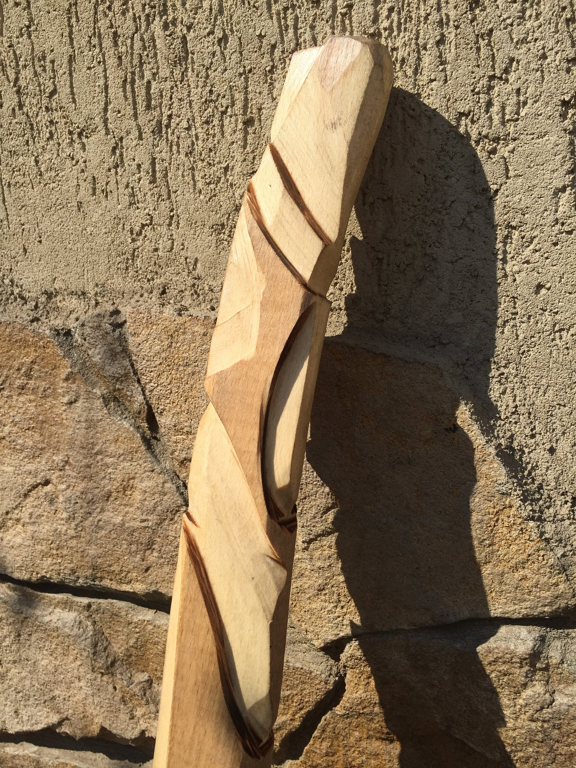 A compact outdoors axe, carved handle, engraved with a nice drawing, decoratively processed axe head, hand-forged and made from carbon steel using traditional blacksmith methods. The steel is stuck several times, increasing its density and thereby the durability of the axe. Perfect for packing in a rucksack, the axe can also be worn on a belt. It will be a perfect companion in your ventures through the wilds, through the woods of the pacific northwest, or at the cabin to make kindling to warm your hearthside. It has a wooden stump.