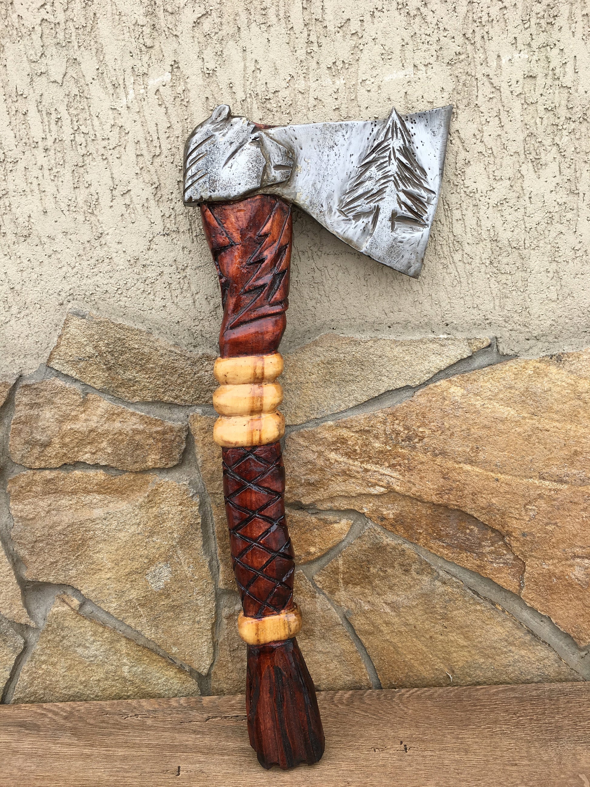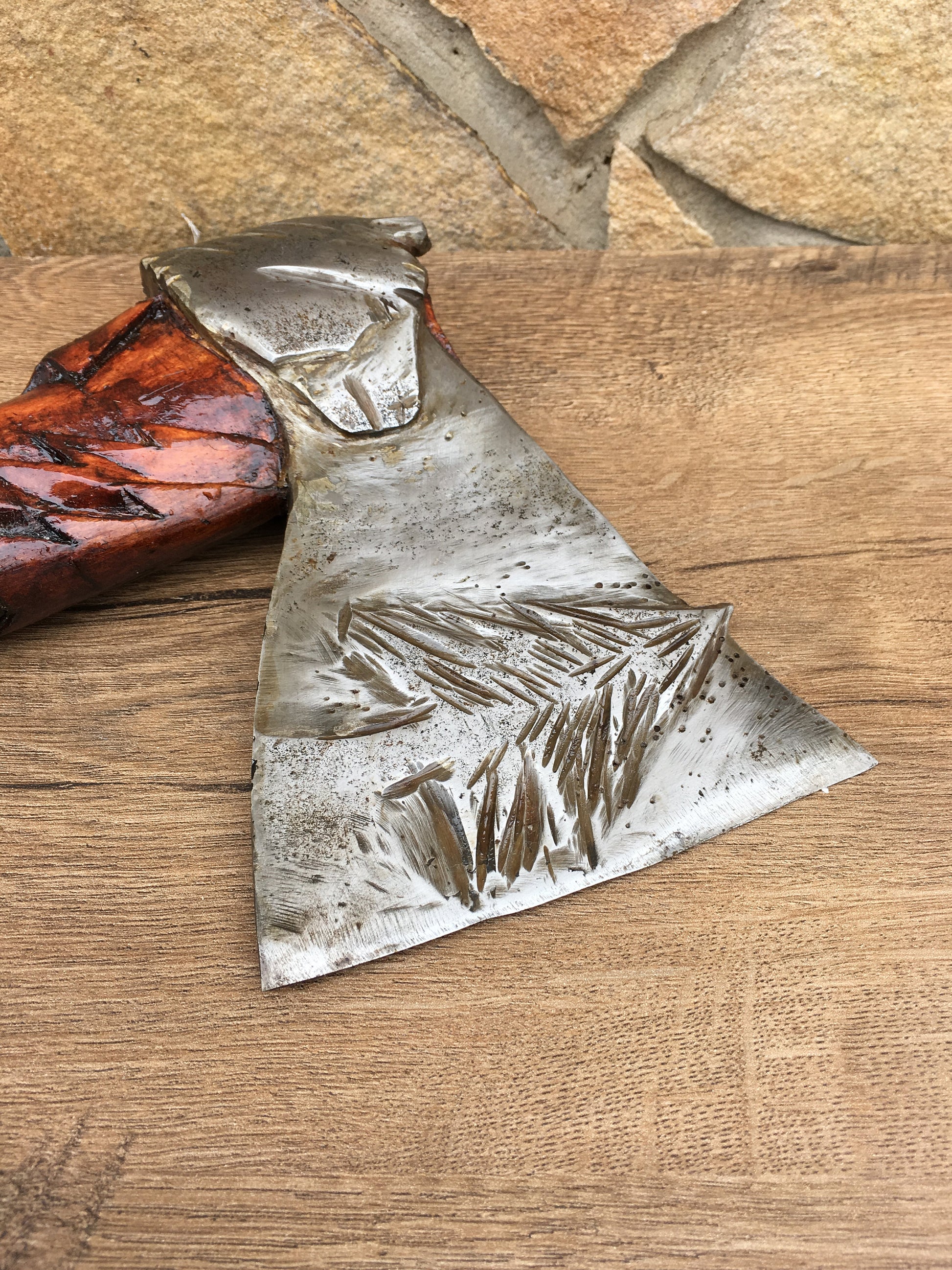 A compact outdoors axe, carved in steel with a fir-tree near the bear head, hand-forged and made from carbon steel using traditional blacksmith methods. The steel is stuck several times, increasing its density and thereby the durability of the axe. Perfect for packing in a rucksack, the axe can also be worn on a belt. It will be a perfect companion in your ventures through the wilds, through the woods of the pacific northwest, or at the cabin to make kindling to warm your hearthside. It has a wooden stump.
