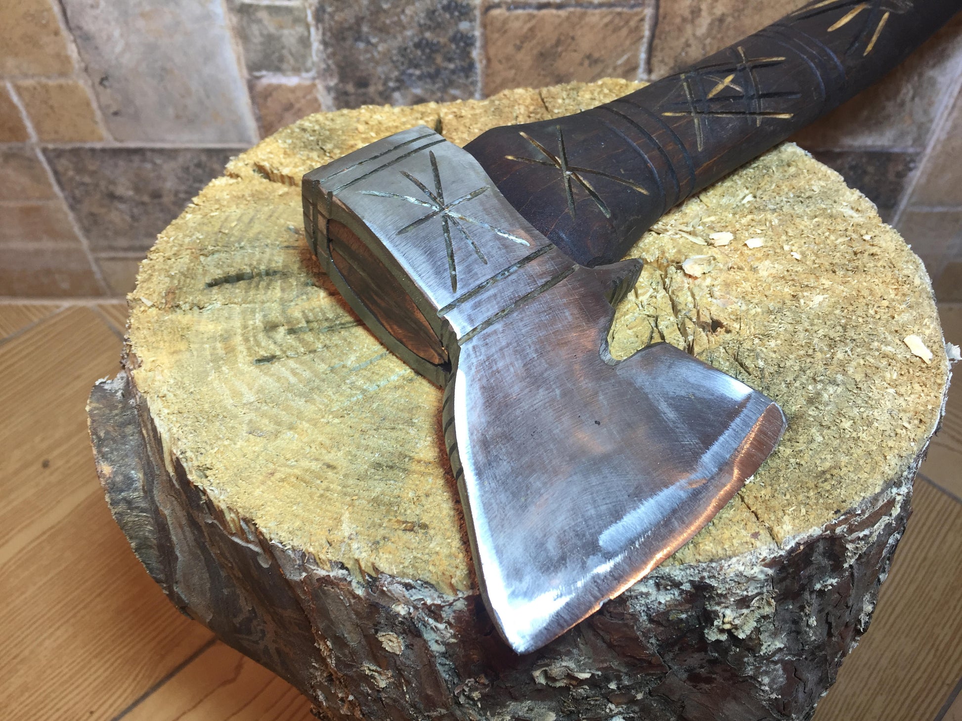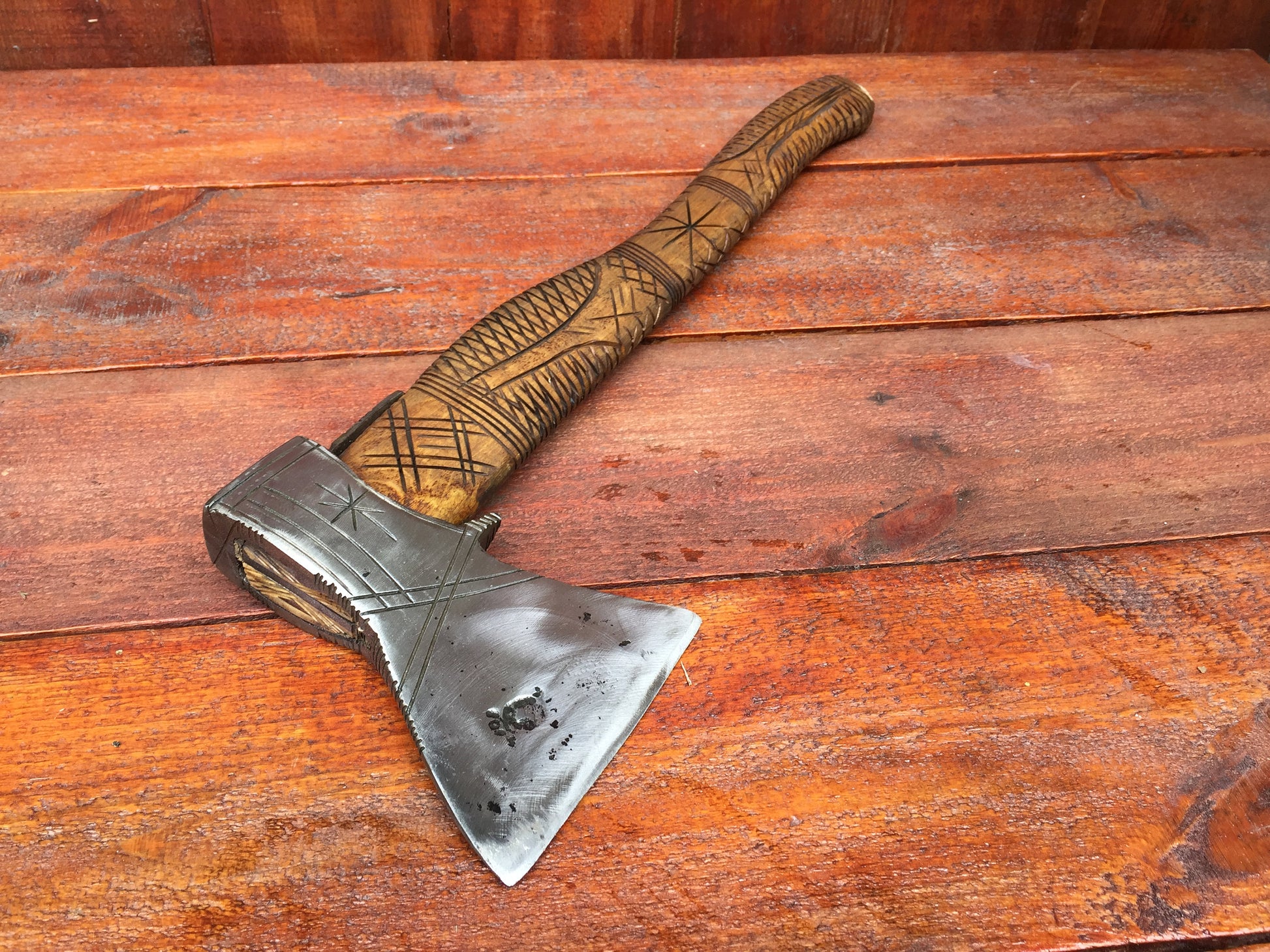 A compact outdoors axe, with carved handle and carved axe head, hand-forged and made from carbon steel using traditional blacksmith methods. The steel is stuck several times, increasing its density and thereby the durability of the axe. Perfect for packing in a rucksack, the axe can also be worn on a belt. It will be a perfect companion in your ventures through the wilds, through the woods of the pacific northwest, or at the cabin to make kindling to warm your hearthside. It has a wooden stump.