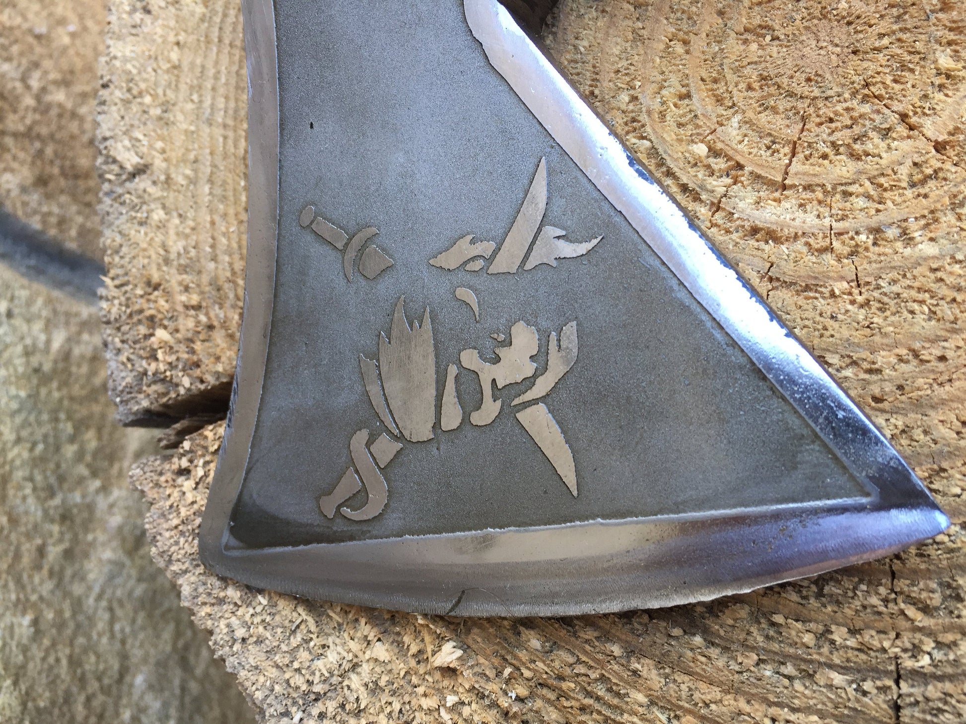 A compact outdoors axe, engraved with a pirate face and a ship, hand-forged and made from carbon steel using traditional blacksmith methods. The steel is stuck several times, increasing its density and thereby the durability of the axe. Perfect for packing in a rucksack, the axe can also be worn on a belt. It will be a perfect companion in your ventures through the wilds, through the woods of the pacific northwest, or at the cabin to make kindling to warm your hearthside. It has a wooden stump.