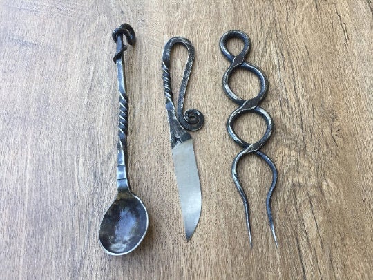 Hand Forged cutlery set in the style of the Middle Ages including 3 units: spoon, fork, knife.