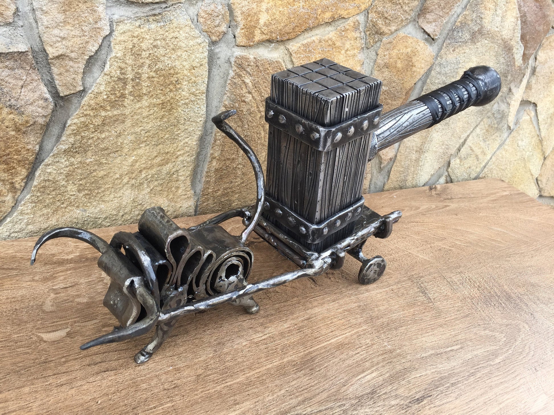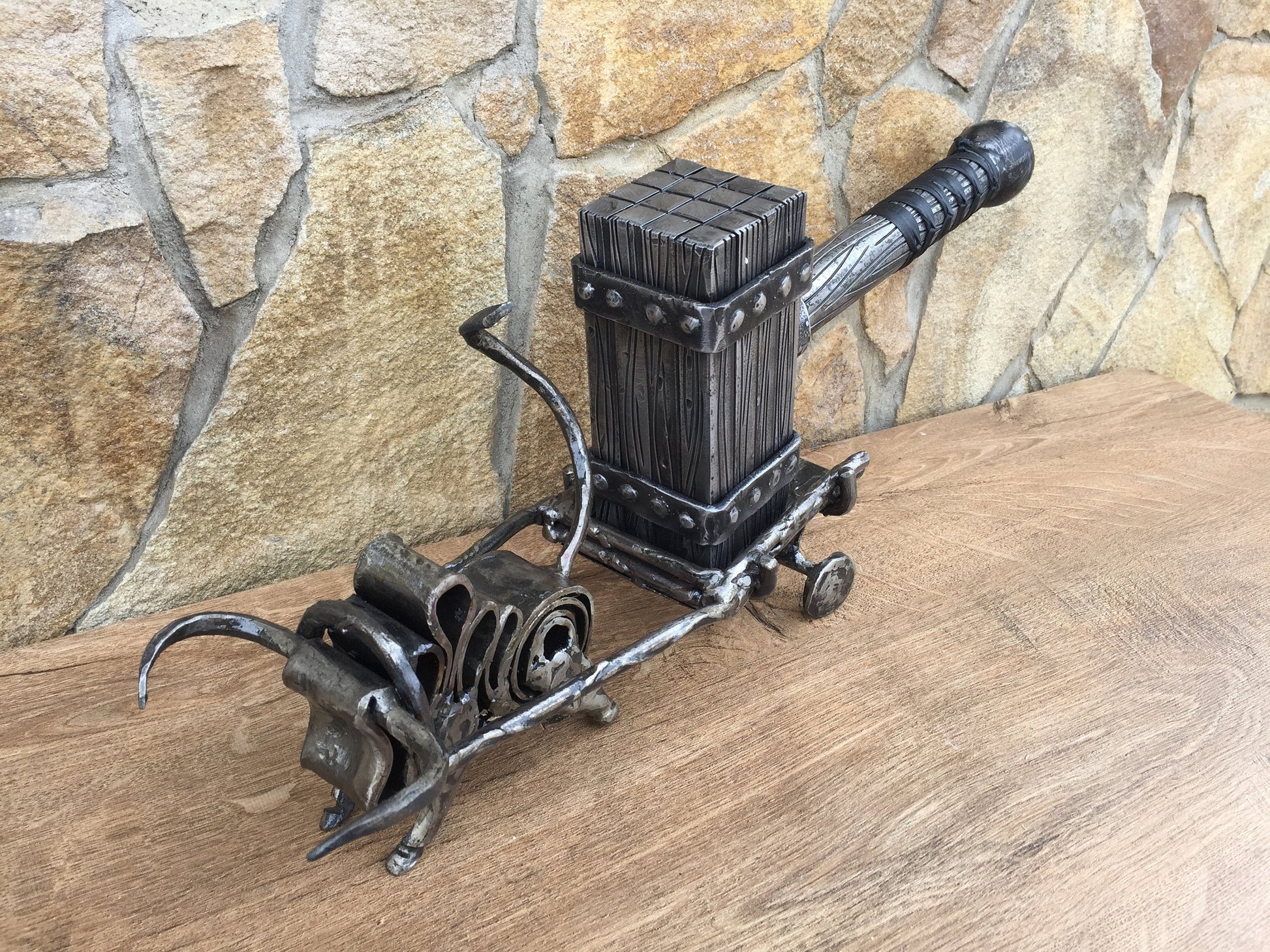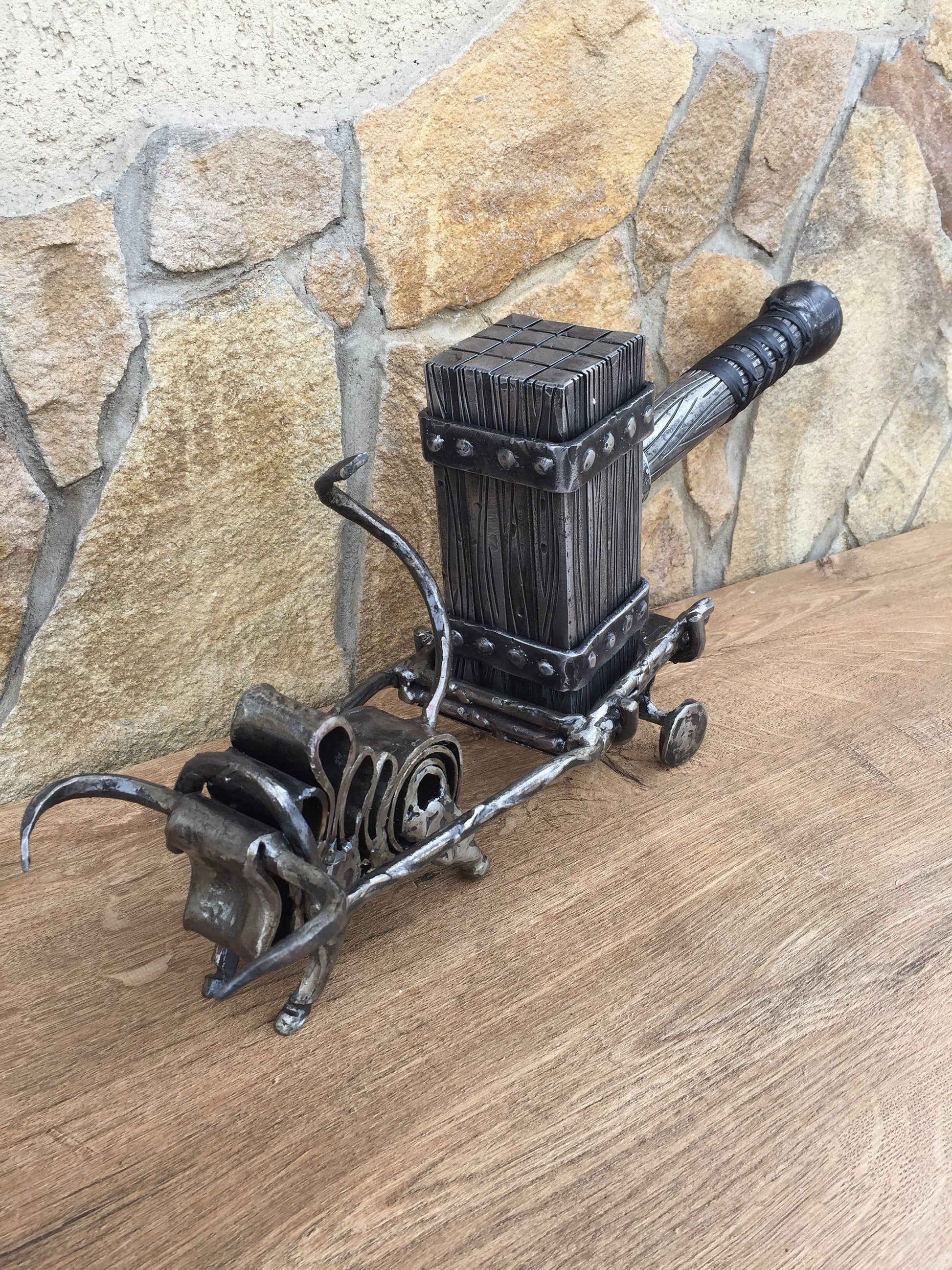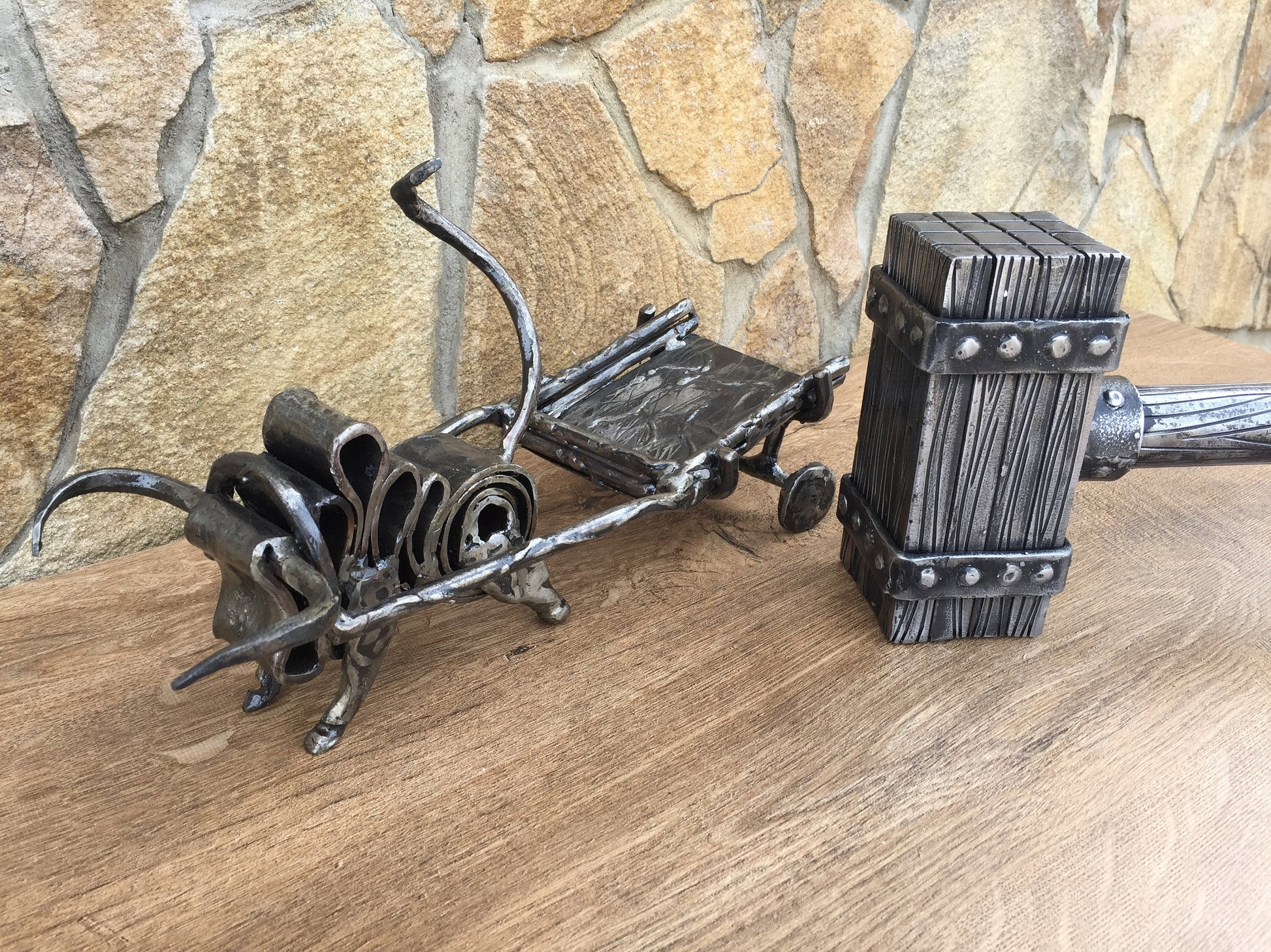 A compact hand-forged and made from carbon steel hammer with a hammer stand in a view of a bull with a cart done by using traditional blacksmith methods. It is done from 16 square rods which were welded together (very unique work), an iron handle is decoratively hand made (with nice bark structure), it stays on a nice hammer holder. This hammer is mainly a decorative hammer, not for a daily use.