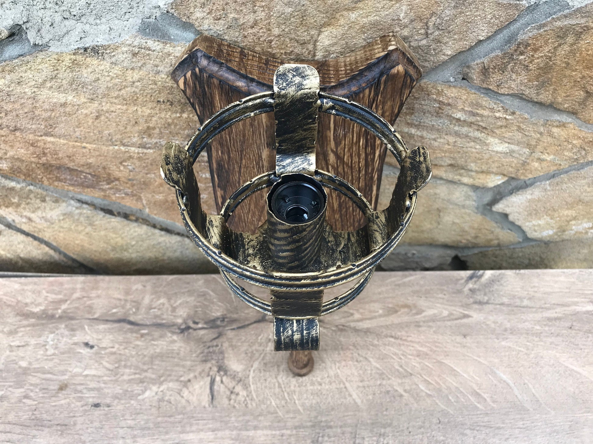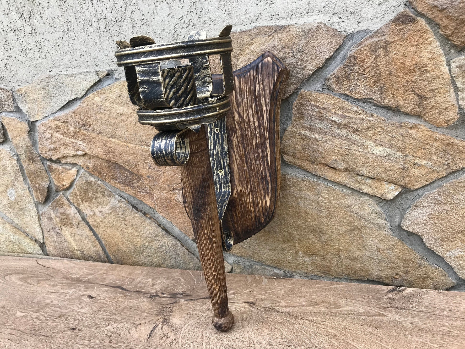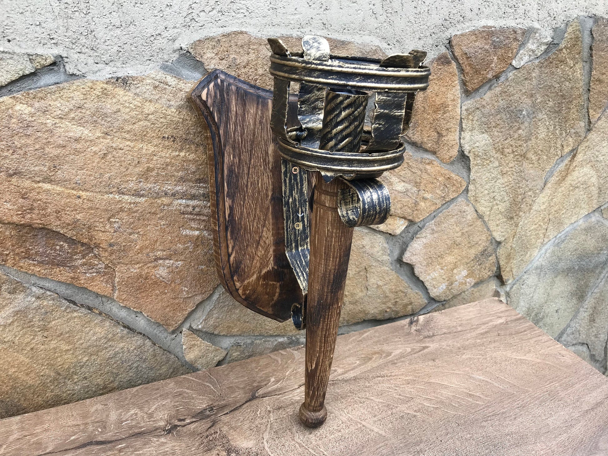 A wall lamp can be not a usual lamp but a masterpiece which can decorate your home and outlines the features of your home interior/exterior. Here is a hand forged wall lamp, hand made, in a view of a torch. It is fixed to a wall. You will not find anything similar to it. It is very decorative! It can serve as a lamp for your porch or entryway lamp or inside house lamp. A wood has a nice surface structure (with antique effect). This lantern creates a medieval atmosphere of old times!