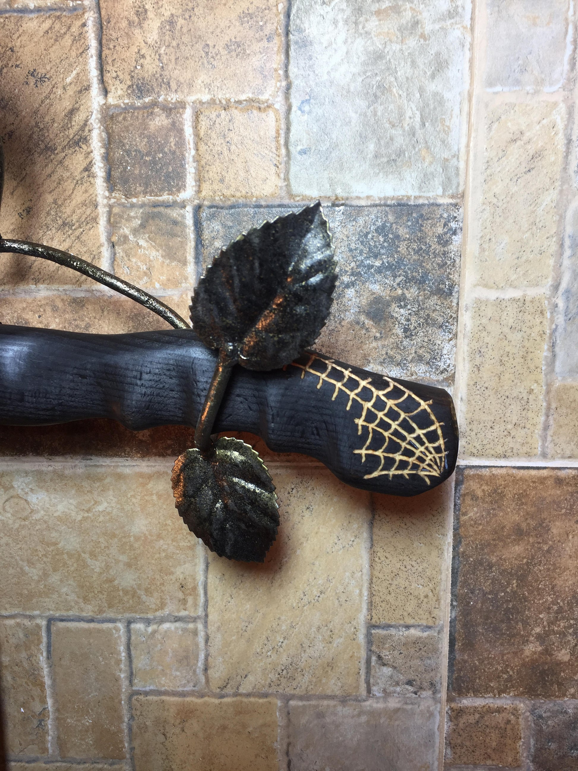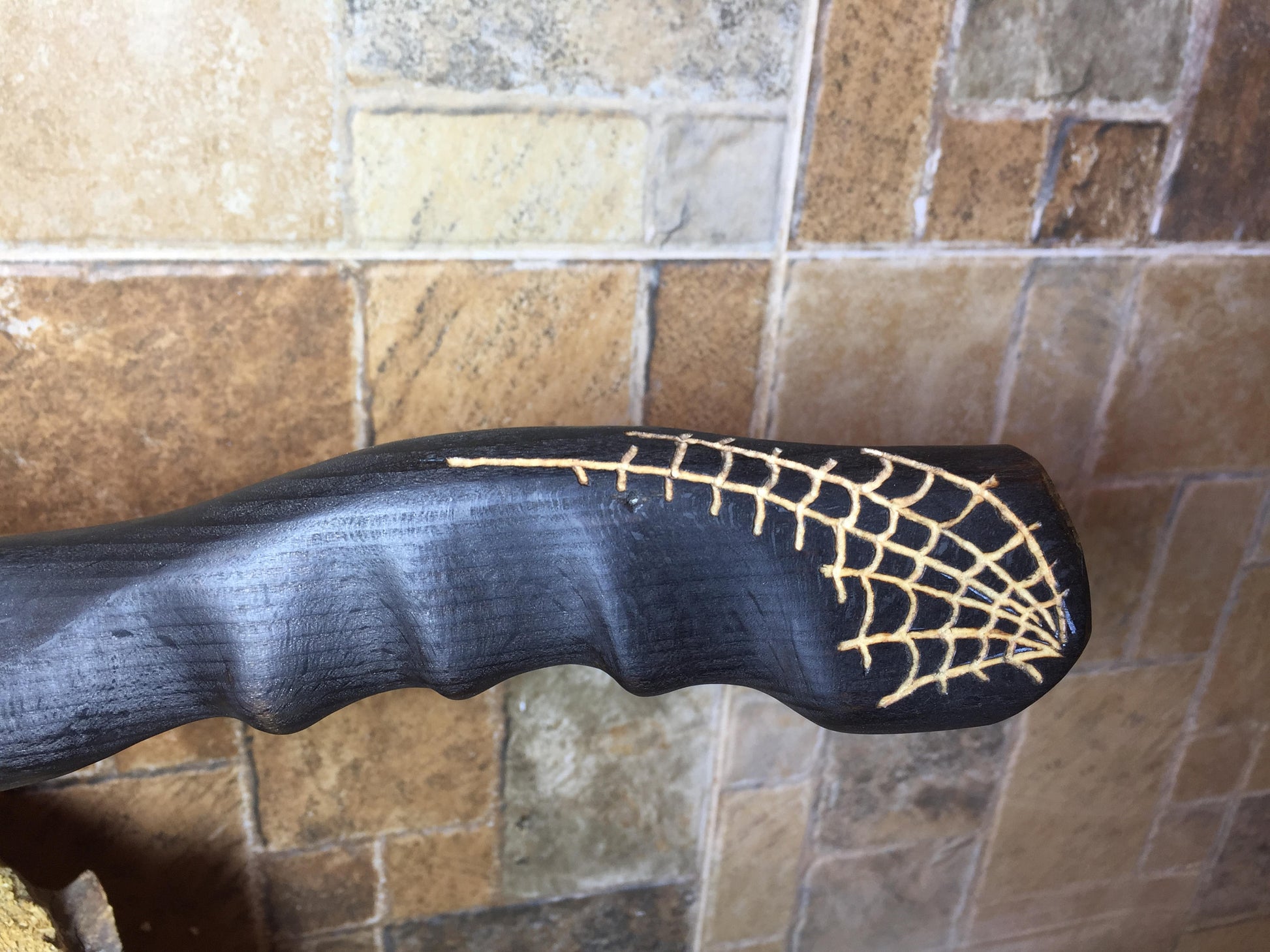 This unique axe has a nice metal structure in a view of the bent metal and a nice engraving of a spider web on the one side of the handle and engraved initials of a name/surname "KW" from the second side of the handle. The handle is decoratively carved to allow fingers better feel it in the hand. It looks very decorative although it is a real axe!