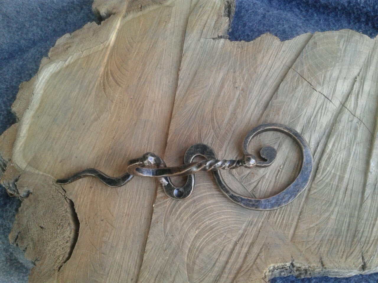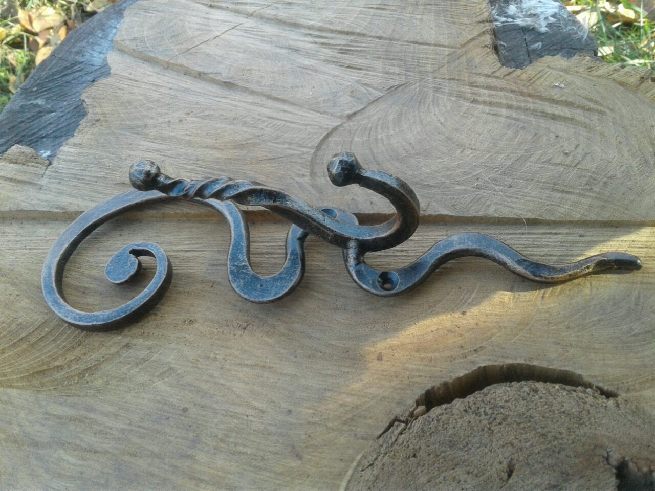 Here is hand forged wall hook. It is done in a very decorative way. You can place it in an entryway, in a barn, in a garage, in a kitchen, in a bathroom, on a backside of a door - wherever you need to hang whatever.