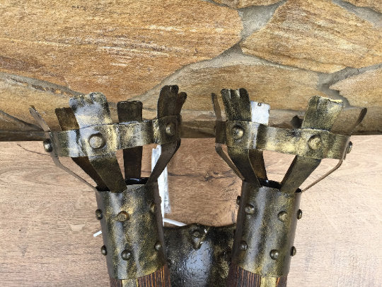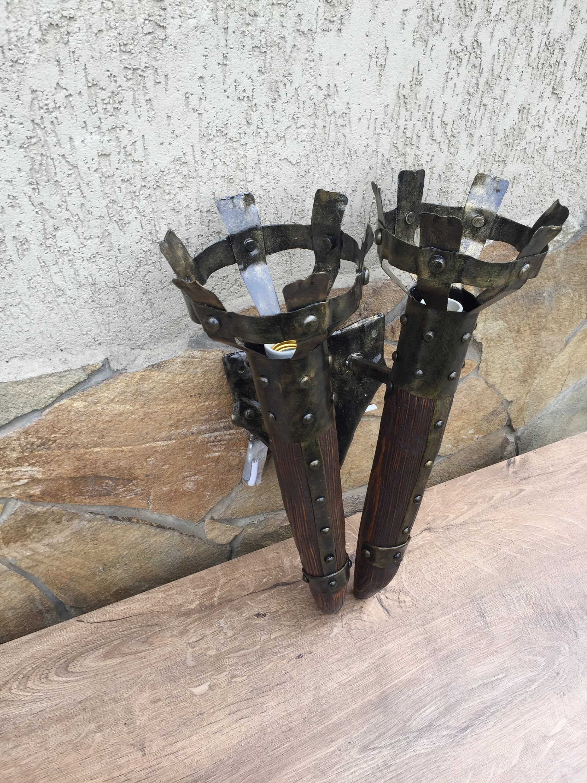 A wall lamp can be not a usual lamp but a masterpiece which can decorate your home and outlines the features of your home interior/exterior. Here is a hand forged wall lamp, hand made, in a view of a torch with two torches. It is fixed to a wall. You will not find anything similar to it. It is very decorative! It can serve as a lamp for your porch or entryway lamp or inside house lamp. A wood has a nice surface structure (small waves structure). This lantern creates a medieval atmosphere of old time!