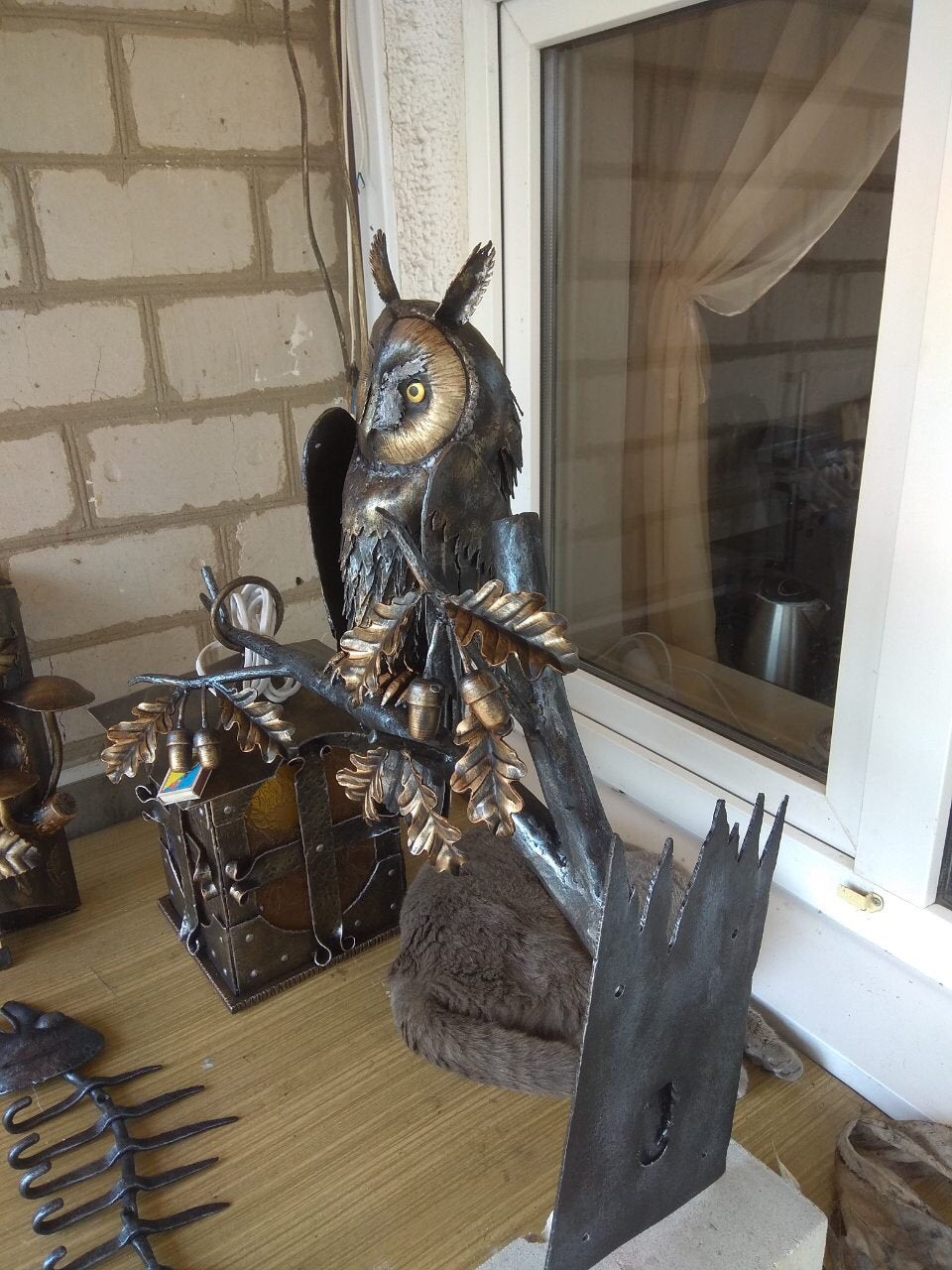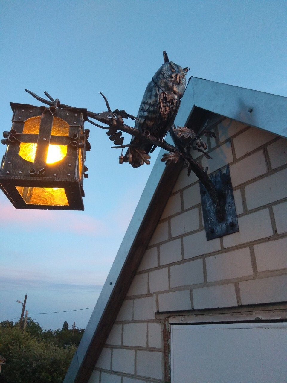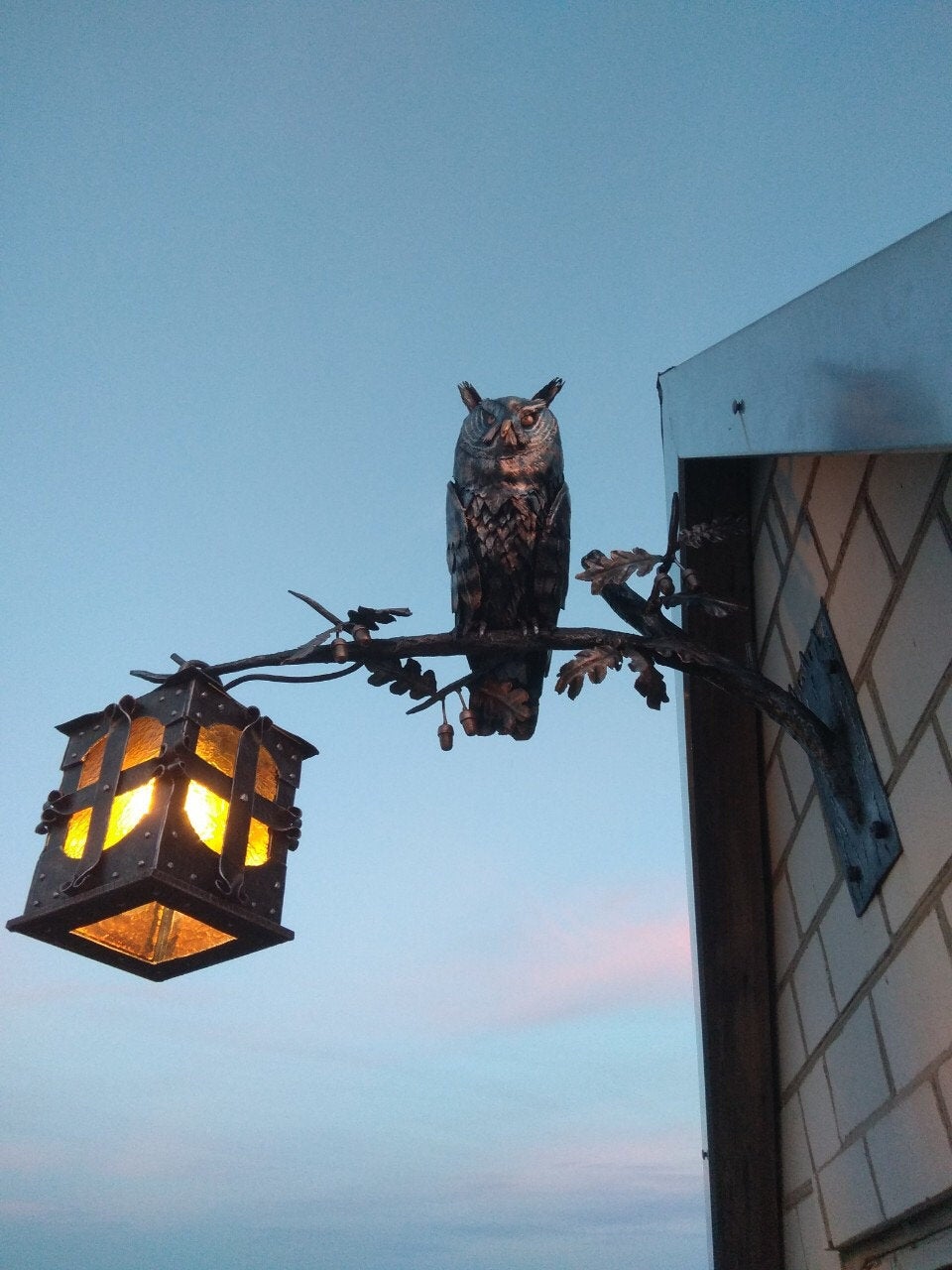 A wall lantern can be not a usual lamp but a masterpiece which can decorate your home and outlines the features of your home interior/exterior. Here is a hand forged outdoor wall sconce, hand made, in a view of an owl sitting on an oak branch with acorns and leaves. You will not find anything similar to it. It is very decorative! It can serve as a lamp for your porch or entryway lamp or inside house lamp. This lantern creates a medieval atmosphere of old viking times!