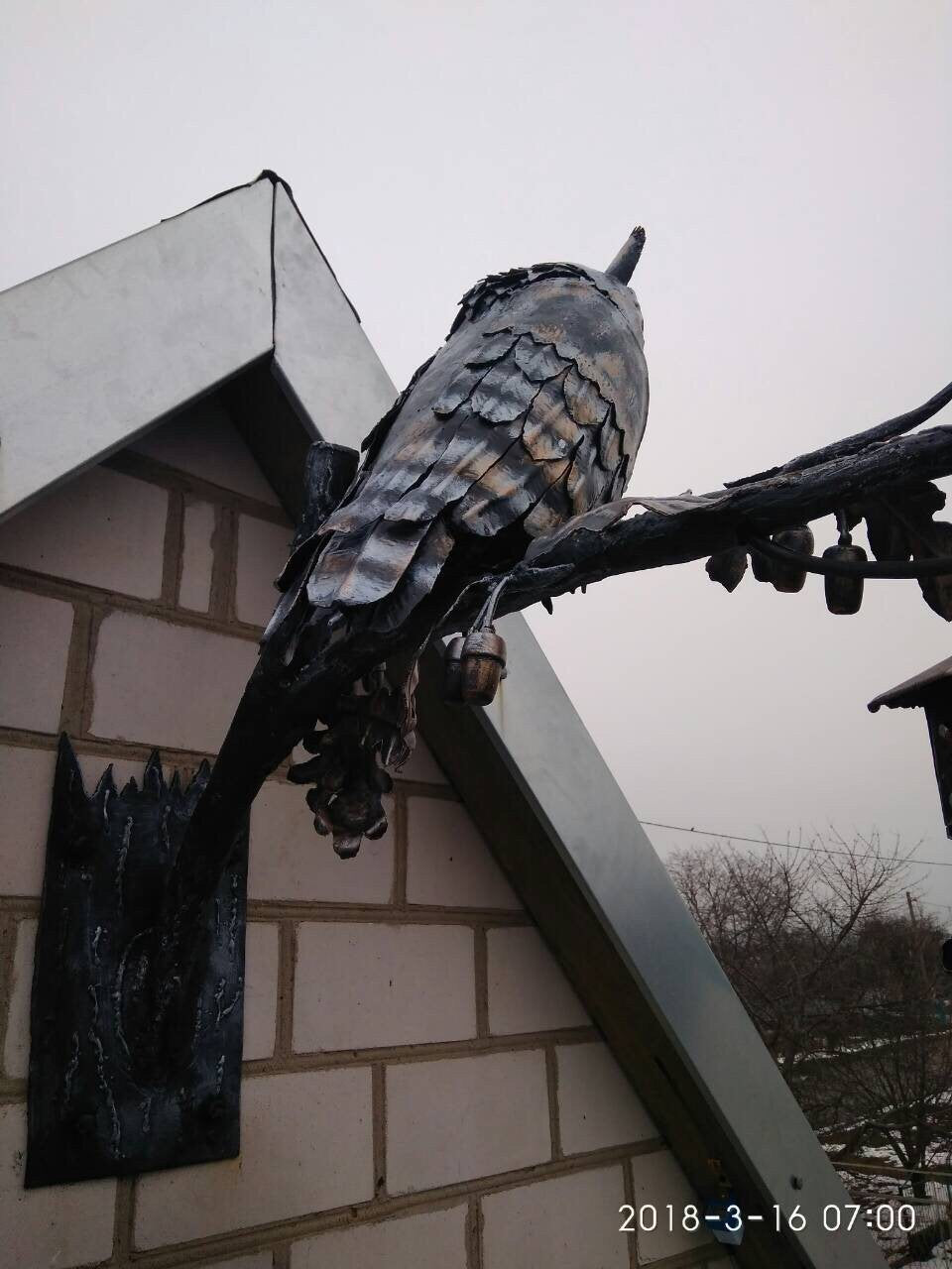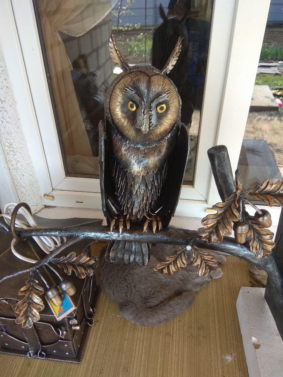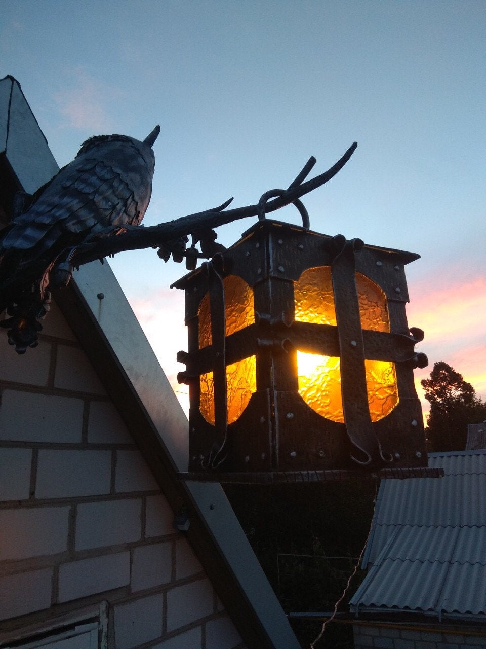 A wall lantern can be not a usual lamp but a masterpiece which can decorate your home and outlines the features of your home interior/exterior. Here is a hand forged outdoor wall sconce, hand made, in a view of an owl sitting on an oak branch with acorns and leaves. You will not find anything similar to it. It is very decorative! It can serve as a lamp for your porch or entryway lamp or inside house lamp. This lantern creates a medieval atmosphere of old viking times!